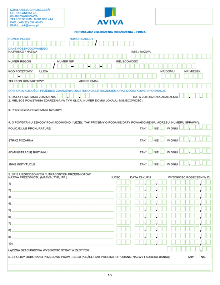 DZIAŁ OBSŁUGI ROSZCZEŃ UL. INFLANCKA 4b, 00-189 WARSZAWA TELECENTRUM: 0 801 888 444 FAX: (+48 22) 557 40 03 EMAIL: [email protected] FORMULARZ ZGŁOSZENIA ROSZCZENIA – FIRMA NUMER POLISY NUMER SZKODY DANE POSZKODOWANEGO NAZWISKO / NAZWA NUMER REGON KOD POCZTOWY - ULICA / IMIĘ / NAZWA / NUMER NIP - TELEFON KONTAKTOWY - MIEJSCOWOŚĆ - NR DOMU NR MIESZK. ADRES EMAIL OPIS OKOLICZNOŚCI, PRZEBIEG ZDARZENIA OBJĘTEGO UBEZPIECZENIEM ORAZ DODATKOWE INFORMACJE . . 1. DATA POWSTANIA ZDARZENIA DATA ZGŁOSZENIA ZDARZENIA 2. MIEJSCE POWSTANIA ZDARZENIA (W TYM ULICA, NUMER DOMU/ LOKALU, MIEJSCOWOŚĆ): . . 3. PRZYCZYNA POWSTANIA SZKODY: 4. O POWSTANIU SZKODY POWIADOMIONO (*JEŻELI TAK PROSIMY O PODANIE DATY POWIADOMIENIA, ADRESU, NUMERU SPRAWY): POLICJĘ LUB PROKURATURĘ TAK* NIE W DNIU . . ___________________________________________________________________________________________________________________________ STRAŻ POŻARNĄ TAK* NIE W DNIU . . ___________________________________________________________________________________________________________________________ ADMINISTRACJĘ BUDYNKU TAK* NIE W DNIU . . ___________________________________________________________________________________________________________________________ INNE INSTYTUCJE TAK* NIE W DNIU . . ___________________________________________________________________________________________________________________________ 5. SPIS USZKODZONYCH / UTRACONYCH PRZEDMIOTÓW NAZWA PRZEDMIOTU (MARKA, TYP, ITP.) ILOŚĆ 1) ______________________________________________________________ 2) ______________________________________________________________ 3) ______________________________________________________________ 4) ______________________________________________________________ 5) ______________________________________________________________ 6) ______________________________________________________________ 7) ______________________________________________________________ 8) ______________________________________________________________ 9) ______________________________________________________________ 10) _____________________________________________________________ DATA ZAKUPU . . . . . . . . . . . . . . . . . . . . WYSOKOŚĆ ROSZCZEŃ W ZŁ. , , , , , , , , , , , ŁĄCZNA SZACUNKOWA WYSOKOŚĆ STRAT W ZŁOTYCH 6. Z POLISY DOKONANO PRZELEWU PRAW - CESJI (*JEŻELI TAK PROSIMY O PODANIE NAZWY I ADRESU BANKU) TAK* NIE ___________________________________________________________________________________________________________________________ ___________________________________________________________________________________________________________________________ 1/2 7. WARTOŚĆ SZKODY: A) WNIOSKUJĘ O WYLICZENIE WARTOŚCI WEDŁUG KOSZTORYSU TOWARZYSTWA TAK B) UDOKUMENTUJĘ FAKTURAMI POWYKONAWCZYMI, KTÓRE ZOSTANĄ ZWERYFIKOWANE PRZEZ TOWARZYSTWO TAK 8. POSZKODANY JEST PŁATNIKIEM PODATKU VAT TAK TAK* NIE NIE 9. W PRZYPADKU, GDY SZKODA ZOSTAŁA WYRZĄDZONA PRZEZ OSOBĘ TRZECIĄ - CZY ZNANA JEST OSOBA ODPOWIEDZIALNA ZA SZKODĘ? (*JEŻELI TAK” PROSIMY O PODANIE IMIENIA, NAZWISKA, NAZWY ORAZ ADRESU) NIE NIE ___________________________________________________________________________________________________________________________ ___________________________________________________________________________________________________________________________ 10. OŚWIADCZAM, ŻE MIENIE UBEZPIECZONE JEST TYLKO W AVIVA TU OGÓLNYCH SA (*JEŻELI NIE PROSIMY O PODANIE NAZWY I ADRESU DRUGIEGO UBEZPIECZYCIELA) TAK NIE* ___________________________________________________________________________________________________________________________ ___________________________________________________________________________________________________________________________ 11. DO ZGŁOSZONEJ SZKODY ZAŁĄCZAM: 1) _________________________________________________________________________________________________________________________ 2) _________________________________________________________________________________________________________________________ 3) _________________________________________________________________________________________________________________________ 4) _________________________________________________________________________________________________________________________ 5) _________________________________________________________________________________________________________________________ 6) _________________________________________________________________________________________________________________________ 7) _________________________________________________________________________________________________________________________ 8) _________________________________________________________________________________________________________________________ 9) _________________________________________________________________________________________________________________________ OŚWIADCZAM, ŻE DANE ZAWARTE W FORMULARZU SĄ PRAWDZIWE, ZGODNE Z MOJĄ WIEDZĄ I ZOSTAŁY PRZEKAZANE W DOBREJ WIERZE JEŚLI ŚWIADCZENIE ZOSTANIE PRZYZNANE, PROSZĘ O PRZEKAZANIE NALEŻNEJ KWOTY PRZELEWEM NA KONTO, NUMER: ___________________________________________________________________________________________________________________________ DANE WŁAŚCICIELA KONTA, JEŻELI JEST INNY NIŻ POSZKODOWANEGO (IMIĘ, NAZWISKO, NAZWA ORAZ ADRES) CZYTELNY PODPIS IMIENIEM I NAZWISKIEM POSZKODOWANEGO DATA PODPISANIA .. MIEJSCE PODPISANIA 2/2