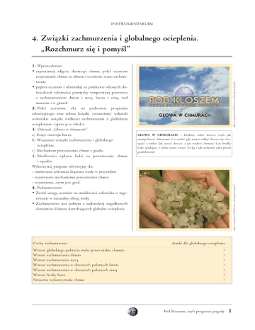 INSTRUMENTARUIM 4. Zwiàzki zachmurzenia i globalnego ocieplenia. „Rozchmurz si´ i pomyÊl” Cechy zachmurzenia Wzrost globalnego pokrycia nieba przez niskie chmury Wzrost zachmurzenia dniem Wzrost zachmurzenia nocà Wzrost zachmurzenia w obszarach polarnych latem Wzrost zachmurzenia w obszarach polarnych zimà Wzrost liczby burz Sztuczne wykorzystanie chmur G¸OWA W CHMURACH – Zróbmy sobie deszcz czyli jak manipulowaç chmurami. Co zrobiç gdy mimo zakl´ç deszcz nie chce spaÊç z nieba? Jak zasiaç deszcz, a jak wydoiç chmur´? Czy bry∏ka lodu spadajàca z nieba mo˝e wa˝yç 10 kg i jak uchroniç pola przed gradobiciem? zdj´cie z programu „Pod kloszem, czyli prognoza pogody” • zaprezentuj zdj´cia, ilustracje chmur, poleç uczniom rozpoznanie chmur za oknem i ocenienie stanu zachmurzenia • poproÊ uczniów i sformu∏uj na podstawie w∏asnych doÊwiadczeƒ zale˝noÊci pomi´dzy temperaturà powietrza a zachmurzeniem: dniem i nocà, latem i zimà, nad morzem i w górach 2. Poleç uczniom, aby na podstawie programu telewizyjnego oraz tekstu ksià˝ki (oratorium) wskazali wielorakie zwiàzki wielkoÊci zachmurzenia z globalnym ociepleniem, zapisz je w tabelce. 3. Odcinek „G∏owa w chmurach” a) Etapy rozwoju burzy. b) Wzajemne zwiàzki zachmurzenia i globalnego ocieplenia. c) Mechanizm powstawania chmur i gradu. d) Mo˝liwoÊci wp∏ywu ludzi na powstawanie chmur i opadów. Wykorzystaj program telewizyjny do: - omówienia schematu krà˝enia wody w przyrodzie - wyjaÊnienia mechanizmu powstawania chmur - wyjaÊnienia, czym jest grad. 4. Podsumowanie: • Zwróç uwag´ uczniów na mo˝liwoÊci cz∏owieka w ingerowanie w naturalny obieg wody. • Zachmurzenie jest jednym z najbardziej zagadkowych elementów klimatu kszta∏tujàcych globalne ocieplenie. zdj´cie z programu „Pod kloszem, czyli prognoza pogody” 1. Wprowadzenie: skutki dla globalnego ocieplenia ? ? ? ? ? ? ? Pod kloszem, czyli prognoza pogody 1