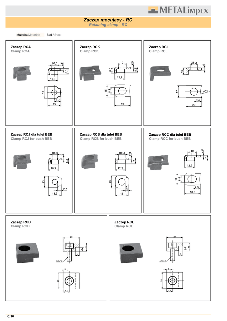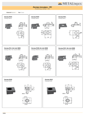Zaczep mocujący - RC Retaining clamp - RC Materiał/Material: Stal / Steel Zaczep RCA Clamp RCA Zaczep RCK Clamp RCK Zaczep RCL Clamp RCL Zaczep RCJ dla tulei BEB Clamp RCJ for bush BEB Zaczep RCB dla tulei BEB Clamp RCB for bush BEB Zaczep RCC dla tulei BEB Clamp RCC for bush BEB Zaczep RCD Clamp RCD C/16 Zaczep RCE Clamp RCE Zaczep mocujący - RC Retaining clamp - RC Zaczep RCF, RCH Clamp RCF, RCH Zaczep RCG Clamp RCG RCF RCH C/17