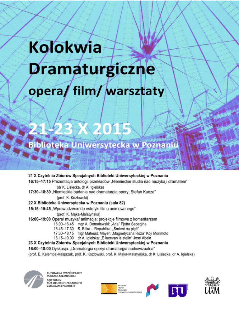 Kolokwia Dramaturgiczne opera/ film/ warsztaty 21-23 X 2015 Biblioteka Uniwersytecka w Poznaniu 21 X Czytelnia Zbiorów Specjalnych Biblioteki Uniwersyteckiej w Poznaniu 16:15–17:15 Prezentacja antologii przekładów „Niemieckie studia nad muzyką i dramatem” (dr K. Lisiecka, dr A. Igielska) 17:30–18:30 „Niemieckie badania nad dramaturgią opery: Stefan Kunze” (prof. K. Kozłowski) 22 X Biblioteka Uniwersytecka w Poznaniu (sala 82) 15:15–15:45 „Wprowadzenie do estetyki filmu animowanego” (prof. K. Mąka-Malatyńska) 16:00–19:00 Opera/ muzyka/ animacja: projekcje filmowe z komentarzem 16.00–16.45 16.45–17.30 17.30–18.15 18.15–19.00 mgr A. Domalewski: „Aria” Pjotra Sapegina S. Bitka – Republika: „Śmierć na pięć” mgr Mateusz Mayer: „Magnetyczna Róża” Kōji Morimoto dr A. Igielska: „E lucevan le stelle“ José Abela 23 X Czytelnia Zbiorów Specjalnych Biblioteki Uniwersyteckiej w Poznaniu 16:00–18:00 Dyskusja: „Dramaturgia opery/ dramaturgia audiowizualna” (prof. E. Kalemba-Kasprzak, prof. K. Kozłowski, prof. K. Mąka-Malatyńska, dr K. Lisiecka, dr A. Igielska)
