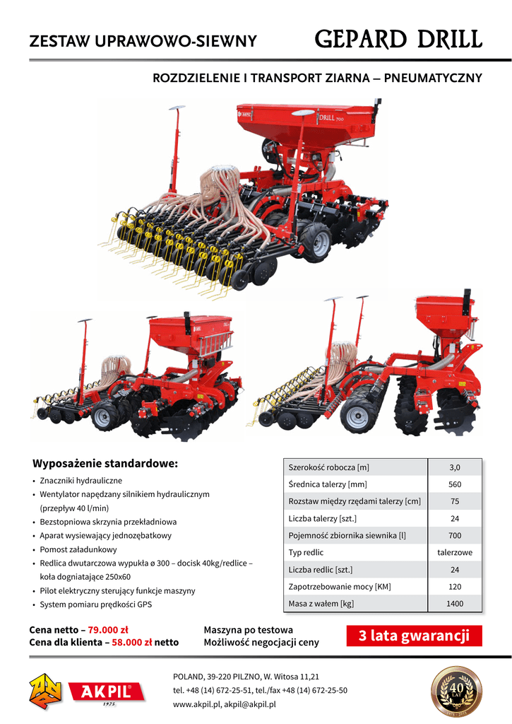 ZESTAW UPRAWOWO-SIEWNY ROZDZIELENIE I TRANSPORT ZIARNA – PNEUMATYCZNY Wyposażenie standardowe: Szerokość robocza [m] 3,0 • Znaczniki hydrauliczne Średnica talerzy [mm] 560 Rozstaw między rzędami talerzy [cm] 75 • Bezstopniowa skrzynia przekładniowa Liczba talerzy [szt.] 24 • Aparat wysiewający jednozębatkowy Pojemność zbiornika siewnika [l] 700 • Pomost załadunkowy Typ redlic • Wentylator napędzany silnikiem hydraulicznym (przepływ 40 l/min) • Redlica dwutarczowa wypukła ø 300 – docisk 40kg/redlice – talerzowe Liczba redlic [szt.] 24 • Pilot elektryczny sterujący funkcje maszyny Zapotrzebowanie mocy [KM] 120 • System pomiaru prędkości GPS Masa z wałem [kg] 1400 koła dogniatające 250x60 Cena netto – 79.000 zł Cena dla klienta – 58.000 zł netto Maszyna po testowa Możliwość negocjacji ceny 3 lata gwarancji POLAND, 39-220 PILZNO, W. Witosa 11,21 tel. +48 (14) 672-25-51, tel./fax +48 (14) 672-25-50 www.akpil.pl, [email protected] 197 5 - 2015