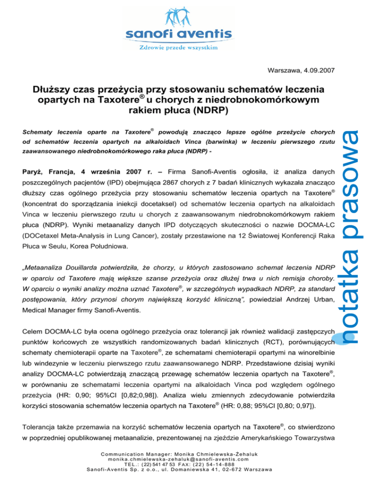 Warszawa, 4.09.2007 Dłuższy czas przeżycia przy stosowaniu schematów leczenia opartych na Taxotere® u chorych z niedrobnokomórkowym rakiem płuca (NDRP) Schematy leczenia oparte na Taxotere® powodują znacząco lepsze ogólne przeżycie chorych od schematów leczenia opartych na alkaloidach Vinca (barwinka) w leczeniu pierwszego rzutu zaawansowanego niedrobnokomórkowego raka płuca (NDRP) - Paryż, Francja, 4 września 2007 r. – Firma Sanofi-Aventis ogłosiła, iż analiza danych poszczególnych pacjentów (IPD) obejmująca 2867 chorych z 7 badań klinicznych wykazała znacząco dłuższy czas ogólnego przeżycia przy stosowaniu schematów leczenia opartych na Taxotere® (koncentrat do sporządzania iniekcji docetaksel) od schematów leczenia opartych na alkaloidach Vinca w leczeniu pierwszego rzutu u chorych z zaawansowanym niedrobnokomórkowym rakiem płuca (NDRP). Wyniki metaanalizy danych IPD dotyczących skuteczności o nazwie DOCMA-LC (DOCetaxel Meta-Analysis in Lung Cancer), zostały przestawione na 12 Światowej Konferencji Raka Płuca w Seulu, Korea Południowa. „Metaanaliza Douillarda potwierdziła, że chorzy, u których zastosowano schemat leczenia NDRP w oparciu od Taxotere mają większe szanse przeżycia oraz dłużej trwa u nich remisja choroby. W oparciu o wyniki analizy można uznać Taxotere®, w szczególnych wypadkach NDRP, za standard postępowania, który przynosi chorym największą korzyść kliniczną”, powiedział Andrzej Urban, Medical Manager firmy Sanofi-Aventis. Celem DOCMA-LC była ocena ogólnego przeżycia oraz tolerancji jak również walidacji zastępczych punktów końcowych ze wszystkich randomizowanych badań klinicznych (RCT), porównujących schematy chemioterapii oparte na Taxotere®, ze schematami chemioterapii opartymi na winorelbinie lub windezynie w leczeniu pierwszego rzutu zaawansowanego NDRP. Przedstawione dzisiaj wyniki analizy DOCMA-LC potwierdzają znaczącą przewagę schematów leczenia opartych na Taxotere®, w porównaniu ze schematami leczenia opartymi na alkaloidach Vinca pod względem ogólnego przeżycia (HR: 0,90; 95%CI [0,82;0,98]). Analiza wielu zmiennych zdecydowanie potwierdziła korzyści stosowania schematów leczenia opartych na Taxotere® (HR: 0,88; 95%CI [0,80; 0,97]). Tolerancja także przemawia na korzyść schematów leczenia opartych na Taxotere®, co stwierdzono w poprzedniej opublikowanej metaanalizie, prezentowanej na zjeździe Amerykańskiego Towarzystwa Communication Manager: Monika Chmielewska-Żehaluk [email protected] T E L . : ( 22) 541 47 53 F A X : ( 2 2 ) 5 4 - 1 4 - 8 8 8 Sanofi-Aventis Sp. z o.o., ul. Domaniewska 41, 02-672 Warszawa Onkologii Klinicznej (ASCO) 20061, a obecnie przyjętej do druku przez The Journal of Thoracic Oncology. W metaanalizie IDP, tolerancja, jak również zastępcze punkty końcowe, są nadal przedmiotem analizy. „Ta metaanaliza danych poszczególnych pacjentów dostarcza dowodów, że lek trzeciej generacji Taxotere®, znacząco przewyższa schematy leczenia oparte na alkaloidach Vinca w leczeniu pacjentów z zaawansowanym NDRP," stwierdził Jean-Yves Douillard, Profesor i Kierownik Oddziału Onkologii Medycznej w Ośrodku R Gauducheau w Saint Herblain, Francja, oraz główny badacz w metaanalizie. Informacje o badaniu Podstawy Taksany i alkaloidy Vinca są powszechnie stosowane w leczeniu pierwszego rzutu zaawansowanego NDRP. Badanie TAX 326, wykazujące korzystniejszy wpływ zestawu docetaksel-cisplatyna, w porównaniu z zestawem winorelbina-cisplatyna na medianę ogólnego przeżycia, stało się podstawą do rejestracji leku Taxotere® w Europie i USA, do stosowania w leczeniu pierwszego rzutu zaawansowanego NDRP. Ponieważ niektóre dane z badań porównawczych sugerują stałe korzyści dotyczące okresu przeżycia i bezpieczeństwa leczenia, przeprowadzono metaanalizę w celu oceny potencjalnych korzyści stosowania schematów leczenia opartych na Taxotere®, w porównaniu ze schematami leczenia opartymi na alkaloidach Vinca pod względem ogólnego przeżycia i tolerancji leczenia. Cel Celem analizy DOCMA-LC była ocena ogólnego przeżycia i tolerancji leczenia jak również walidacja zastępczych punktów końcowych ze wszystkich randomizowanych badań klinicznych (RCT) porównujących schematy chemioterapii oparte na Taxotere® ze schematami chemioterapii opartymi na winorelbinie lub windezynie w leczeniu pierwszego rzutu zaawansowanego NDRP. Metody Przeszukiwanie baz danych MEDLINE, CANCERLIT i Cochrane Library uzupełniono informacjami ze sprawozdań z badań klinicznych oraz ręcznego przeszukiwania odnośnych doniesień zjazdowych. Zbierano i analizowano dane wszystkich pacjentów. Uwzględniono jedynie randomizowane badania kliniczne (RCT) porównujące schematy chemioterapii oparte na Taxotere® ze schematami chemioterapii opartymi na winorelbinie lub windezynie. Siedem randomizowanych badań klinicznych obejmowało łącznie 2867 chorych (schematy oparte na Taxotere: 1638; schematy oparte na alkaloidach Vinca: 1229). Taxotere® był łączony ze związkiem platyny w trzech badaniach, Communication Manager: Monika Chmielewska-Żehaluk [email protected] T E L . : ( 22) 541 47 53 F A X : ( 2 2 ) 5 4 - 1 4 - 8 8 8 Sanofi-Aventis Sp. z o.o., ul. Domaniewska 41, 02-672 Warszawa z gemcytabiną w dwóch, a w dwóch badaniach był stosowany w monoterapii. Schematy chemioterapii oparte na winorelbinie były schematami porównawczymi w 6 z 7 badań, schemat oparty na windezynie w jednym badaniu2-8. Jakość metodologiczną każdego badania oceniano według skali Jada10. Analiza statystyczna Analiza skuteczności leczenia została przeprowadzona na podstawie „zamiaru leczenia” (intent-totreat). Analiza przeżycia została oparta na połączeniu poszczególnych logarytmów współczynnika ryzyka (HR). Dane połączono metodą „ważenia” odwrotnej wariancji. Wyniki Pierwsze wyniki dotyczące przeżycia1 dla wszystkich zestawów leków przemawiały