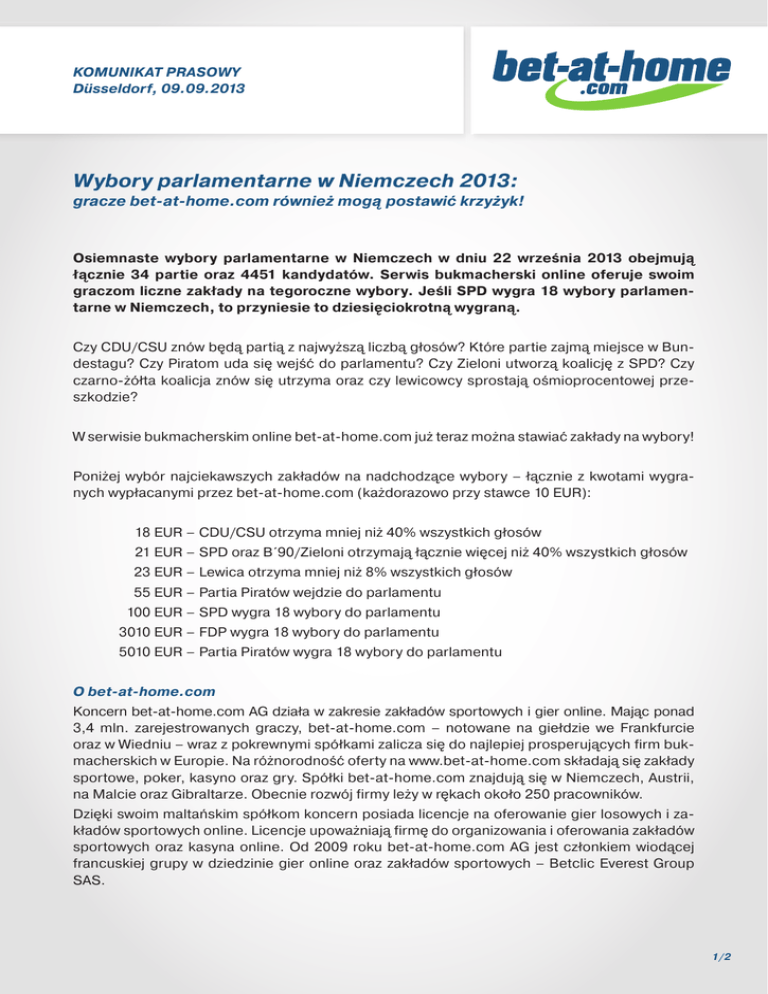 OBJAVA ZA TISK KOMUNIKAT PRASOWY 29. avgust 2012 Düsseldorf, 09.09.2013 Wybory parlamentarne w Niemczech 2013: gracze bet-at-home.com również mogą postawić krzyżyk! Osiemnaste wybory parlamentarne w Niemczech w dniu 22 września 2013 obejmują łącznie 34 partie oraz 4451 kandydatów. Serwis bukmacherski online oferuje swoim graczom liczne zakłady na tegoroczne wybory. Jeśli SPD wygra 18 wybory parlamentarne w Niemczech, to przyniesie to dziesięciokrotną wygraną. Czy CDU/CSU znów będą partią z najwyższą liczbą głosów? Które partie zajmą miejsce w Bundestagu? Czy Piratom uda się wejść do parlamentu? Czy Zieloni utworzą koalicję z SPD? Czy czarno-żółta koalicja znów się utrzyma oraz czy lewicowcy sprostają ośmioprocentowej przeszkodzie? W serwisie bukmacherskim online bet-at-home.com już teraz można stawiać zakłady na wybory! Poniżej wybór najciekawszych zakładów na nadchodzące wybory – łącznie z kwotami wygranych wypłacanymi przez bet-at-home.com (każdorazowo przy stawce 10 EUR): 18 EUR – CDU/CSU otrzyma mniej niż 40% wszystkich głosów 21 EUR – SPD oraz B´90/Zieloni otrzymają łącznie więcej niż 40% wszystkich głosów 23 EUR – Lewica otrzyma mniej niż 8% wszystkich głosów 55 EUR – Partia Piratów wejdzie do parlamentu 100 EUR – SPD wygra 18 wybory do parlamentu 3010 EUR – FDP wygra 18 wybory do parlamentu 5010 EUR – Partia Piratów wygra 18 wybory do parlamentu O bet-at-home.com Koncern bet-at-home.com AG działa w zakresie zakładów sportowych i gier online. Mając ponad 3,4 mln. zarejestrowanych graczy, bet-at-home.com – notowane na giełdzie we Frankfurcie oraz w Wiedniu – wraz z pokrewnymi spółkami zalicza się do najlepiej prosperujących firm bukmacherskich w Europie. Na różnorodność oferty na www.bet-at-home.com składają się zakłady sportowe, poker, kasyno oraz gry. Spółki bet-at-home.com znajdują się w Niemczech, Austrii, na Malcie oraz Gibraltarze. Obecnie rozwój firmy leży w rękach około 250 pracowników. Dzięki swoim maltańskim spółkom koncern posiada licencje na oferowanie gier losowych i zakładów sportowych online. Licencje upoważniają firmę do organizowania i oferowania zakładów sportowych oraz kasyna online. Od 2009 roku bet-at-home.com AG jest członkiem wiodącej francuskiej grupy w dziedzinie gier online oraz zakładów sportowych – Betclic Everest Group SAS. 1/2 OBJAVA ZA TISK KOMUNIKAT PRASOWY 29. avgust 2012 Düsseldorf, 09.09.2013 Na Państwa pytania chętnie udziela odpowiedzi Mag. Claus Retschitzegger Kierownik Działu Komunikacji +43 (0)732 / 9015 - 1017 [email protected] www.bet-at-home.com 2/2