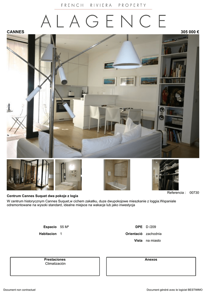 CANNES 305 000 € Referencia : Centrum Cannes Suquet dwa pokoje z logia W centrum historycznym Cannes Suquet,w cichem zakatku, duze dwupokojowe mieszkanie z loggia.Wspaniale odremontowane na wysoki standard, idealne miejsce na wakacje lub jako inwestycja Espacio Habitacion 55 M² 1 Prestaciones Climatización Document non contractuel DPE 00730 D /209 Orientació zachodnia Vista na miasto Anexos Document généré avec le logiciel BESTIMMO