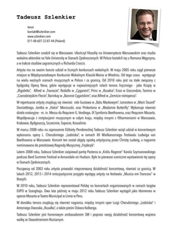 Tadeusz Szlenkier ! tenor [email protected] www.szlenkier.com 011-48-607-33-87-44 (Poland) ! Tadeusz Szlenkier urodził się w Warszawie. Ukończył filozofię na Uniwersytecie Warszawskim oraz studia wokalno-aktorskie na Yale University w Stanach Zjednoczonych. W Polsce kształcił się u Romana Węgrzyna, a w trakcie studiów zagranicznych u Richarda Cross’a. Artysta ma na swoim koncie udział w licznych konkursach wokalnych. W maju 2005 roku zajął pierwsze miejsce w Międzynarodowym Konkursie Wokalnym Klassik-Mania w Wiedniu. Od tego czasu występuje na wielu ważnych scenach muzycznych w Polsce i za granicą. Od 2010 roku jest na stałe związany z bydgoską Operą Nova, gdzie występuje w najważniejszych rolach tenora lirycznego - jako Książę w „Rigoletto”, Alfred w „Traviacie”, Rodolfo w „Cyganerii”, Princ w „Rusałce”, Enzo w Giocondzie, Tamino w „Czarodziejskim Flecie”, Barinkay w „Baronie Cygańskim”, oraz Alfred w „Zemście nietoperza”. W repertuarze artysty znajdują się również role Gustawa w „Balu Maskowym”, Leicestera w „Marii Stuard” Donizettiego, Jontka w „Halce” Moniuszki, oraz Pinkertona w „Madamie Butterfly”. Wykonuje również dzieła oratoryjne - m. in. Messa da Requiem G. Verdiego, IX Symfonia Beethovena, oraz Requiem Mozarta. Współpracuje z instytucjami muzycznym w całym kraju, między innymi z filharmoniami w Warszawie, Krakowie, Bydgoszczy, Szczecinie, Sopocie, Koszalinie. W marcu 2008 roku na zaproszenie Elżbiety Pendereckiej Tadeusz Szlenkier wziął udział w koncertowym wykonaniu opery L. Cherubiniego „Lodoïska”, w ramach XII Wielkanocnego Festiwalu Ludwiga van Beethovena w Warszawie. Koncert ten został objęty opieką artystyczną przez Christę Ludwig, a nagranie nominowano do prestiżowej Nagrody Muzycznej „Fryderyk”. Latem 2008 roku, Tadeusz Szlenkier zaśpiewał partię Pasterza w „Królu Rogerze” Karola Szymanowskiego podczas Bard Summer Festival w Annandale on Hudson. Było to pierwsze sceniczne wystawienie tej opery w Stanach Zjednoczonych. Począwszy od 2003 roku artysta prowadzi nieprzerwaną działalność koncertową, również za granicą. W latach 2012, 2013 i 2014 entuzjastycznie przyjęto występy artysty na festiwalu „Musica em Trancoso” w Brazylii. W 2010 roku, Tadeusz Szlenkier reprezentował Polskę na koncertach organizowanych w ramach targów EXPO w Szanghaju. Dwa lata później w maju 2012 roku Tadeusz Szlenkier wystąpił jako Idomeneo w operze Mozarta w Teatro Municipal w Limie w Peru. W dorobku tenora znajdują się również nagrania, między innymi oper Luigi Cherubiniego „Lodoïska” i Antoniego Dworaka „Rusałka”, a także pieśni Oskara Kolberga. Tadeusz Szlenkier jest honorowym ambasadorem SM i poprzez swoją działalność koncertową wspiera walkę ze Stwardnieniem Rozsianym.