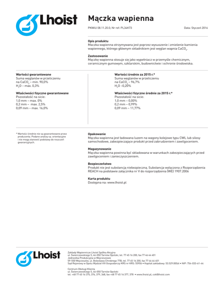 Mączka wapienna PKWiU 08.11.20.0; Nr ref: PL34K73 Data: Styczeń 2016 Opis produktu Maczka wapienna otrzymywana jest poprzez wysuszenie i zmielenie kamienia wapiennego, którego głównym składnikiem jest węglan wapnia CaCO3. Zastosowanie Mączkę wapienna stosuje się jako wypełniacz w przemyśle chemicznym, ceramicznym gumowym, szklarskim, budownictwie i ochronie środowiska. Wartości gwarantowane Suma węglanów w przeliczeniu na CaCO3 – min. 90,0% H2O – max. 0,3% Wartości średnie za 2015 r.* Suma węglanów w przeliczeniu na CaCO3 – 96,7% H2O –0,20% Właściwości fizyczne gwarantowane Pozostałość na sicie: 1,0 mm – max. 0% 0,2 mm – max. 2,5% 0,09 mm – max. 16,0% Właściwości fizyczne średnie za 2015 r.* Pozostałość na sicie: 1,0 mm – 0,00% 0,2 mm – 0,99% 0,09 mm – 11,77% * Wartości średnie nie są gwarantowane przez producenta. Podane analizy są orientacyjne i nie mogą stanowić podstawy do roszczeń gwarancyjnych. Opakowanie Mączka wapienna jest ładowana luzem na wagony kolejowe typu CWL lub silosy samochodowe, zabezpieczające produkt przed zabrudzeniem i zawilgoceniem. Magazynowanie Mączka wapienna powinna być składowana w warunkach zabezpieczających przed zawilgoceniem i zanieczyszczeniem. Bezpieczeństwo Produkt nie jest substancją niebezpieczną. Substancja wyłączona z Rozporządzenia REACH na podstawie załącznika nr V do rozporządzenia (WE) 1907.2006 Karta produktu Dostępna na: www.lhoist.pl Zakłady Wapiennicze Lhoist Spółka Akcyjna ul. Świerczewskiego 5, 46-050 Tarnów Opolski, tel. 77 45 16 200, fax 77 46 44 401 Jednostka Produkcyjna w Wojcieszowie 59-550 Wojcieszów, ul. Bolesława Chrobrego 77B, tel. 77 45 16 200, fax 77 46 44 401 Sąd Rejonowy w Opolu Wydział VIII Gospodarczy KRS nr KRS: 55906 • Kapitał zakładowy: 53.529.000zł • NIP: 754-033-61-44 Centrum Obsługi Klienta ul. Świerczewskiego 5, 46-050 Tarnów Opolski tel. +48 77 45 16 375, 376, 379, 368, fax +48 77 45 16 377, 378 • www.lhoist.pl, [email protected]