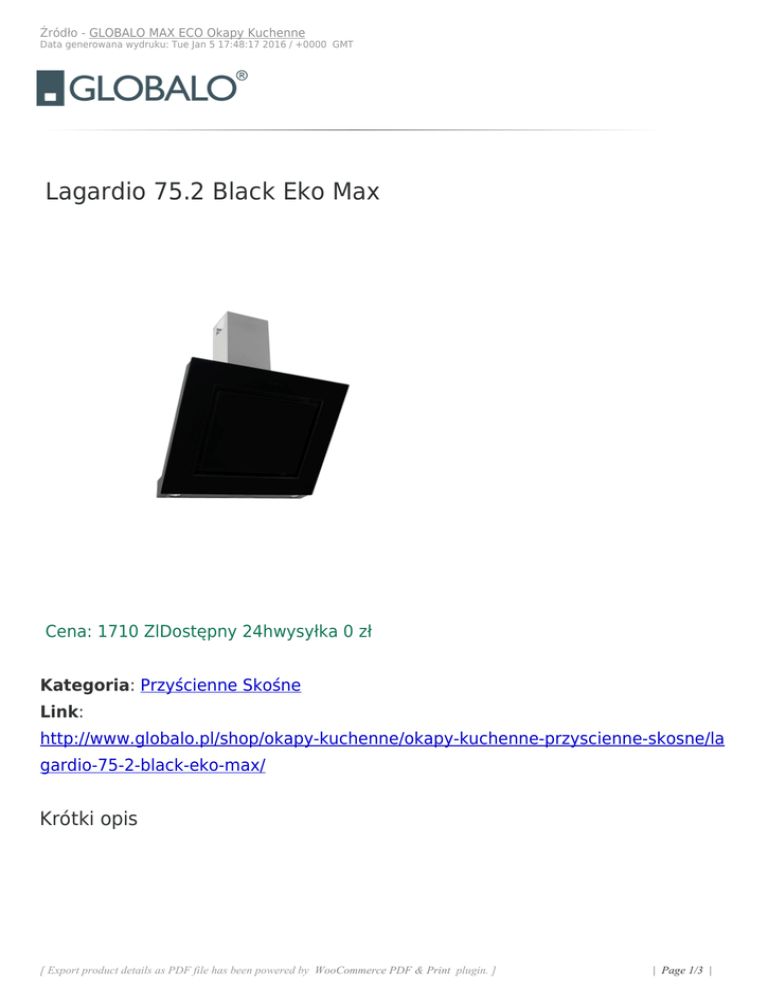 Źródło - GLOBALO MAX ECO Okapy Kuchenne Data generowana wydruku: Tue Jan 5 17:48:17 2016 / +0000 GMT Lagardio 75.2 Black Eko Max Cena: 1710 ZlDostępny 24hwysyłka 0 zł Kategoria: Przyścienne Skośne Link: http://www.globalo.pl/shop/okapy-kuchenne/okapy-kuchenne-przyscienne-skosne/la gardio-75-2-black-eko-max/ Krótki opis [ Export product details as PDF file has been powered by WooCommerce PDF & Print plugin. ] | Page 1/3 | Źródło - GLOBALO MAX ECO Okapy Kuchenne Data generowana wydruku: Tue Jan 5 17:48:17 2016 / +0000 GMT Krótki opis: klasa energetyczna A, przyścienny skośny, szer. 75 cm, gł. 46 cm, sterowanie sensorowe (dotykowe) z wyświetlaczem LED, zakres prędkości: 3 + boost, wydajność max. 815 m3/h, głośność min. 52 dB, wykonanie: czarne hartowane szkło, stal lakierowana na czarno, stal szlachetna (nierdzewna) Inox, oświetlenie diodowe 2 x 1,2 W. Linia GLOBALO Design Specyfikacja produktu: - Wymiary: 80 x 60 x 80 cm - Waga: 26 kg - Waga okapu: 23 kg - Szerokość: 75 cm - Głębokość: 46 cm - Wysokość: 90,2-128,2 cm - Filtr aluminiowy: wielowarstwowy, wzmacniany - Filtr węglowy: okrągły ASC 200 (1 kpl.) opcjonalnie - Sterowanie: sensorowe (dotykowe) z wyświetlaczem LED + pilot - Moc silnika: 275 W - Oświetlenie: diodowe 2 x 1,2 W - Średnica wylotu: fi 15 cm, redukcja fi 12 cm - Timer: 15 min - Wykonanie: czarne hartowane szkło, stal lakierowana na czarno, stal szlachetna (nierdzewna) Inox - Zakres prędkości: 3 + boost - Dodatki: pilot - Gwarancja: 2 lata - Tryb pracy: pochłaniacz, wyciąg - Turbina zewnętrzna: okap może pracować z turbiną zewnętrzną - Kod EAN: 5900652381777 [ Export product details as PDF file has been powered by WooCommerce PDF & Print plugin. ] | Page 2/3 | Źródło - GLOBALO MAX ECO Okapy Kuchenne Data generowana wydruku: Tue Jan 5 17:48:17 2016 / +0000 GMT - Typ okapu: Przyścienny Skośny - Wydajność min.: 335 m3/h - Wydajność max: 595 m3/h - Wydajność boost: 815 m3/h - Głośność min.: 52 dB - Głośność max: 63 dB - Głośność boost: 69 dB - Klasa energetyczna: Klasa A [ Export product details as PDF file has been powered by WooCommerce PDF & Print plugin. ] | Page 3/3 |