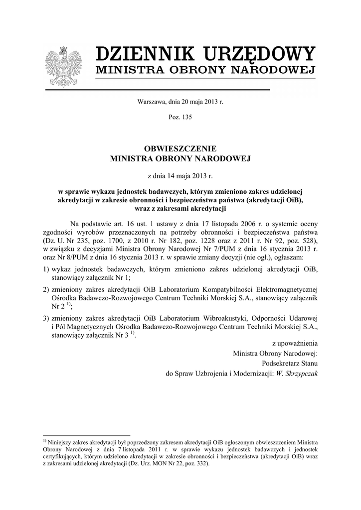 Warszawa, dnia 20 maja 2013 r. Poz. 135 OBWIESZCZENIE MINISTRA OBRONY NARODOWEJ z dnia 14 maja 2013 r. w sprawie wykazu jednostek badawczych, którym zmieniono zakres udzielonej akredytacji w zakresie obronności i bezpieczeństwa państwa (akredytacji OiB), wraz z zakresami akredytacji Na podstawie art. 16 ust. 1 ustawy z dnia 17 listopada 2006 r. o systemie oceny zgodności wyrobów przeznaczonych na potrzeby obronności i bezpieczeństwa państwa (Dz. U. Nr 235, poz. 1700, z 2010 r. Nr 182, poz. 1228 oraz z 2011 r. Nr 92, poz. 528), w związku z decyzjami Ministra Obrony Narodowej Nr 7/PUM z dnia 16 stycznia 2013 r. oraz Nr 8/PUM z dnia 16 stycznia 2013 r. w sprawie zmiany decyzji (nie ogł.), ogłaszam: 1) wykaz jednostek badawczych, którym zmieniono zakres udzielonej akredytacji OiB, stanowiący załącznik Nr 1; 2) zmieniony zakres akredytacji OiB Laboratorium Kompatybilności Elektromagnetycznej Ośrodka Badawczo-Rozwojowego Centrum Techniki Morskiej S.A., stanowiący załącznik Nr 2 1); 3) zmieniony zakres akredytacji OiB Laboratorium Wibroakustyki, Odporności Udarowej i Pól Magnetycznych Ośrodka Badawczo-Rozwojowego Centrum Techniki Morskiej S.A., stanowiący załącznik Nr 3 1). z upoważnienia Ministra Obrony Narodowej: Podsekretarz Stanu do Spraw Uzbrojenia i Modernizacji: W. Skrzypczak 1) Niniejszy zakres akredytacji był poprzedzony zakresem akredytacji OiB ogłoszonym obwieszczeniem Ministra Obrony Narodowej z dnia 7 listopada 2011 r. w sprawie wykazu jednostek badawczych i jednostek certyfikujących, którym udzielono akredytacji w zakresie obronności i bezpieczeństwa (akredytacji OiB) wraz z zakresami udzielonej akredytacji (Dz. Urz. MON Nr 22, poz. 332). Załączniki do obwieszczenia Ministra Obrony Narodowej z dnia 14 maja 2013 r. (poz. 135) Załącznik Nr 1 WYKAZ jednostek badawczych, którym zmieniono zakres udzielonej akredytacji OiB Lp. Nazwa jednostki badawczej Zakres udzielonej akredytacji OiB Laboratorium Kompatybilności Elektromagnetycznej Ośrodka Badawczo-Rozwojowego Centrum Techniki Morskiej S.A. Określa załącznik Nr 2 Laboratorium Wibroakustyki, Odporności Udarowej 2. i Pól Magnetycznych Ośrodka Badawczo-Rozwojowego Centrum Techniki Morskiej S.A. Określa załącznik Nr 3 1. 1/1 Załącznik Nr 2 ZAKRES AKREDYTACJI OiB Nr 20/MON/2011 Wydanie 2 LABORATORIUM KOMPATYBILNOŚCI ELEKTROMAGNETYCZNEJ OŚRODKA BADAWCZO-ROZWOJOWEGO CENTRUM TECHNIKI MORSKIEJ S.A. 81-109 Gdynia, ul. Dickmana 62 Grupa Nazwa wyrobu lub wyrobów* grupy wyrobów Grupa 2 Grupa 4 Grupa 5 Grupa 6 Grupa 8 Grupa 9 Grupa 10 Grupa 11 Grupa 16 Grupa 17 Urządzenia oraz zestawy urządzeń (systemy) elektryczne i elektroniczne (różne) zasilane prądem stałym lub przemiennym z grup: 2, 4, 5, 6, 8, 9, 10, 11, 16, 17. Dokumenty normatywne i/lub udokumentowane procedury badawcze Odporność na narażenia promieniowane – pole NO-06-A500:2012, magnetyczne w zakresie częstotliwości procedura PRS-01 od 30 Hz do 100 kHz Odporność na narażenia promieniowane – pole NO-06-A500:2012, elektryczne w zakresie częstotliwości procedura PRS-02 od 2 MHz do 18 GHz Odporność na narażenia przewodzone NO-06-A500:2012, w zakresie częstotliwości procedura PCS-01 od 30 Hz do 150 kHz – przewody zasilające Odporność na narażenia przewodzone NO-06-A500:2012, w zakresie częstotliwości procedura PCS-05 od 30 Hz do 150 kHz – prądy strukturalne Odporność na narażenia przewodzone NO-06-A500:2012, w zakresie częstotliwości procedura PCS-06 od 10 kHz do 200 MHz – przewody zasilające i sygnałowe Odporność na narażenia przewodzone – NO-06-A500:2012, pobudzenie impulsowe (ciągi impulsów quasi procedura PCS-07 prostokątnych) Poziom zaburzeń elektromagnetycznych NO-06-A500:2012 przewodzonych w zakresie częstotliwości procedura PCE-01 od 30 Hz do 10 kHz – przewody zasilające Poziom zaburzeń elektromagnetycznych NO-06-A500:2012, przewodzonych w zakresie częstotliwości procedura PCE-02 od 10 kHz do 10 MHz – przewody zasilające Poziom zaburzeń elektromagnetycznych NO-06-A500:2012, przewodzonych w zakresie częstotliwości procedura PCE-03 od 10 kHz do 40 GHz – terminale antenowe Poziom zaburzeń elektromagnetycznych NO-06-A500:2012, promieniowanych – pole magnetyczne procedura PRE-01 w zakresie częstotliwości od 30 Hz do 100 kHz Poziom zaburzeń elektromagnetycznych NO-06-A500:2012, promieniowanych – pole elektryczne procedura PRE-02 w zakresie częstotliwości od 10 kHz do 18 GHz Badane charakterystyki wyrobu i metody badawcze 1/3 LKEM OBR CTM S.A. Grupa Nazwa wyrobu lub wyrobów* grupy wyrobów Badane charakterystyki wyrobu i metody badawcze Odporność na wyładowania elektrostatyczne (do 30 kV) Odporność obwodów zasilania i linii wejścia/wyjścia na serie szybkich elektrycznych stanów przejściowych typu BURST (do 4 kV) Odporność obwodów zasilania i linii wejścia/wyjścia na udary napięciowe typu SURGE (do 4 kV) Odporność na pole magnetyczne o częstotliwości sieci elektroenergetycznej Odporność na impulsowe pole magnetyczne typu SURGE Odporność na pole magnetyczne oscylacyjne tłumione Odporność na przebiegi oscylacyjne Grupa 4 Grupa 5 Grupa 7 Grupa 8 Grupa 9 Grupa 10 Grupa 11 Grupa 16 Grupa 17 Grupa 5 Grupa 6 Grupa 9 Grupa 10 Grupa 11 Grupa 16 Grupa 17 Urządzenia oraz zestawy urządzeń (systemy) elektryczne i elektroniczne (różne) zasilane prądem stałym lub przemiennym z grup: 4, 5, 7, 8, 9, 10, 11, 16, 17; o maksymalnych wymiarach: 0,85 m×1,0 m×1,3 m Kabiny i obudowy urządzeń z grup: 5, 6, 9, 10, 11, 16, 17. Dokumenty normatywne i/lub udokumentowane procedury badawcze PN-EN 61000-4-2:2011; NO-06-A211:2005; AECTP 500 Ed.4., procedura 508/2 PN-EN 61000-4-4:2010 PN-EN 61000-4-5:2010 PN-EN 61000-4-8: 2010(oryg.) PN-EN 61000-4-9:1998 + /A1:2003 PN-EN 61000-4-10:1999 + /A1:2003 PN-EN 61000-4-12:2009 Odporność na zapady napięcia, krótkie przerwy NO-06-A108:2005, i zmiany napięcia zasilania, występujące w załącznik B, p. B.2 i B