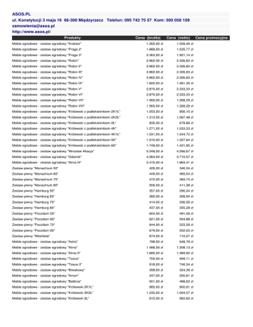 ASOS.PL ul. Konstytucji 3 maja 16 66-300 Międzyrzecz Telefon: 095 742 75 57 Kom: 500 058 109 [email protected] http://www.asos.pl/ Produkty Cena (brutto) Cena (netto) Meble ogrodowe - zestaw ogrodowy "Kraków" 1.265,00 zł 1.028,46 zł Meble ogrodowe - zestaw ogrodowy "Praga 2" 1.889,00 zł 1.535,77 zł Meble ogrodowe - zestaw ogrodowy "Praga 3" 2.363,00 zł 1.921,14 zł Meble ogrodowe - zestaw ogrodowy "Robin" 2.862,00 zł 2.326,83 zł Meble ogrodowe - zestaw ogrodowy "Robin II" 2.862,00 zł 2.326,83 zł Meble ogrodowe - zestaw ogrodowy "Robin III" 2.862,00 zł 2.326,83 zł Meble ogrodowe - zestaw ogrodowy "Robin IV" 2.862,00 zł 2.326,83 zł Meble ogrodowe - zestaw ogrodowy "Robin IX" 1.822,00 zł 1.481,30 zł Meble ogrodowe - zestaw ogrodowy "Robin V" 2.870,00 zł 2.333,33 zł Meble ogrodowe - zestaw ogrodowy "Robin VI" 2.870,00 zł 2.333,33 zł Meble ogrodowe - zestaw ogrodowy "Robin VII" 1.560,00 zł 1.268,29 zł Meble ogrodowe - zestaw ogrodowy "Robin VIII" 1.560,00 zł 1.268,29 zł Meble ogrodowe - zestaw ogrodowy "Królewski z podłokietnikiem 2K1Ł" 1.053,00 zł 856,10 zł Meble ogrodowe - zestaw ogrodowy "Królewski z podłokietnikiem 2K2Ł" 1.313,00 zł 1.067,48 zł Meble ogrodowe - zestaw ogrodowy "Królewski z podłokietnikiem 2Ł" 835,00 zł 678,86 zł Meble ogrodowe - zestaw ogrodowy "Królewski z podłokietnikiem 4K" 1.271,00 zł 1.033,33 zł Meble ogrodowe - zestaw ogrodowy "Królewski z podłokietnikiem 4K1Ł" 1.531,00 zł 1.244,72 zł Meble ogrodowe - zestaw ogrodowy "Królewski z podłokietnikiem 5K" 1.510,00 zł 1.227,64 zł Meble ogrodowe - zestaw ogrodowy "Królewski z podłokietnikiem 6K" 1.749,00 zł 1.421,95 zł Meble ogrodowe - zestaw ogrodowy "Wrocław Akacja" 5.248,00 zł 4.266,67 zł Meble ogrodowe - zestaw ogrodowy "Gdańsk" 4.564,00 zł 3.710,57 zł Meble ogrodowe - zestaw ogrodowy "Alma III" 2.415,00 zł 1.963,41 zł Zestaw piwny "Monachium 50" 426,00 zł 346,34 zł Zestaw piwny "Monachium 60" 449,00 zł 365,04 zł Zestaw piwny "Monachium 70" 472,00 zł 383,74 zł Zestaw piwny "Monachium 80" 506,00 zł 411,38 zł Zestaw piwny "Hamburg 50" 357,00 zł 290,24 zł Zestaw piwny "Hamburg 60" 380,00 zł 308,94 zł Zestaw piwny "Hamburg 70" 414,00 zł 336,59 zł Zestaw piwny "Hamburg 80" 437,00 zł 355,28 zł Zestaw piwny "Poczdam 50" 604,00 zł 491,06 zł Zestaw piwny "Poczdam 60" 621,00 zł 504,88 zł Zestaw piwny "Poczdam 70" 644,00 zł 523,58 zł Zestaw piwny "Poczdam 80" 679,00 zł 552,03 zł Zestaw piwny "Westfalia" 874,00 zł 710,57 zł Meble ogrodowe - zestaw ogrodowy "Astra" 798,00 zł 648,78 zł Meble ogrodowe - zestaw ogrodowy "Alma" 1.486,00 zł 1.208,13 zł Meble ogrodowe - zestaw ogrodowy "Alma II" 1.685,00 zł 1.369,92 zł Meble ogrodowe - zestaw ogrodowy "Tosca" 700,00 zł 569,11 zł Meble ogrodowe - zestaw ogrodowy "Tosca II" 918,00 zł 746,34 zł Meble ogrodowe - zestaw ogrodowy "Biwakowy" 399,00 zł 324,39 zł Meble ogrodowe - zestaw ogrodowy "Amon" 247,00 zł 200,81 zł Meble ogrodowe - zestaw ogrodowy "Balbina" 601,00 zł 488,62 zł Meble ogrodowe - zestaw ogrodowy "Królewski 2K1Ł" 985,00 zł 800,81 zł Meble ogrodowe - zestaw ogrodowy "Królewski 2K2Ł" 1.235,00 zł 1.004,07 zł 815,00 zł 662,60 zł Meble ogrodowe - zestaw ogrodowy "Królewski 2Ł" Cena promocyjna Meble ogrodowe - zestaw ogrodowy "Królewski 4K" 1.155,00 zł 939,02 zł Meble ogrodowe - zestaw ogrodowy "Królewski 4K1Ł" 1.405,00 zł 1.142,28 zł Meble ogrodowe - zestaw ogrodowy "Królewski 5K" 1.365,00 zł 1.109,76 zł Meble ogrodowe - zestaw ogrodowy "Królewski 6K" 1.575,00 zł 1.280,49 zł Zestaw piwny "Westfalia II" 840,00 zł 682,93 zł Zestaw piwny "Westfalia III" 840,00 zł 682,93 zł Zestaw piwny "Hanover 50" 610,00 zł 495,94 zł Zestaw piwny "Hanover 60" 633,00 zł 514,63 zł Zestaw piwny "Hanover 70" 656,00 zł 533,33 zł Zestaw piwny "Hanover 80" 690,00 zł 560,98 zł Meble ogrodowe - zestaw ogrodowy "Andaluzja" 8.390,00 zł 6.821,14 zł Meble ogrodowe - zestaw ogrodowy "Bergen" 5.479,00 zł 4.454,47 zł Meble ogrodowe - zestaw ogrodowy "Kraków 3" 2.034,00 zł 1.653,66 zł 795,00 zł 646,34 zł Meble ogrodowe - zestaw ogrodowy "Wrocław" Meble ogrodowe - zestaw ogrodowy "Poznań" 795,00 zł 646,34 zł 1.160,00 zł 943,09 zł Meble ogrodowe - zestaw ogrodowy "Classic 2Ł" 760,00 zł 617,89 zł Meble ogrodowe - zestaw ogrodowy "Róża" 795,00 zł 646,34 zł 1.743,00 zł 1.417,07 zł Meble ogrodowe - zestaw ogrodowy "Classic 2K2Ł" Meble ogrodowe - zestaw ogrodowy "Kraków 2"