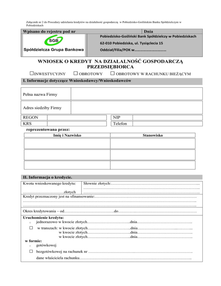 Załącznik nr 2 do Procedury udzielania kredytów na działalność gospodarczą w Pobiedzisko-Goślińskim Banku Spółdzielczym w Pobiedziskach Wpisano do rejestru pod nr Dnia Pobiedzisko-Gośliński Bank Spółdzielczy w Pobiedziskach 62-010 Pobiedziska, ul. Tysiąclecia 15 Oddział/Filia/POK w…………………………… WNIOSEK O KREDYT NA DZIAŁALNOŚĆ GOSPODARCZĄ PRZEDSIĘBIORCA INWESTYCYJNY OBROTOWY OBROTOWY W RACHUNKU BIEŻĄCYM I. Informacje dotyczące Wnioskodawcy/Wnioskodawców Pełna nazwa Firmy Adres siedziby Firmy REGON NIP KRS reprezentowana przez: Telefon Imię i Nazwisko Stanowisko II. Informacja o kredycie. Słownie złotych:………………………………………………………... ………………………………………………………………………….. …………………………złotych ………………………………………………………………………….. Kredyt przeznaczony jest na sfinansowanie:………………………………………………………………… ……………………………………………………………………………………………………………….. ……………………………………………………………………………………………………………….. Kwota wnioskowanego kredytu: Okres kredytowania – od……………………………….do………….……………………………………… Uruchomienie kredytu: jednorazowo w kwocie złotych…………………………..dnia………………………………….. w transzach: w kwocie złotych…………………………..dnia………………………...………... w kwocie złotych…………………………..dnia………………………………….. w kwocie złotych…………………………..dnia………………………………….. w formie: gotówkowej bezgotówkowej na rachunek nr …………………………….……………………………………. dane właściciela rachunku……………………………………………………………………….. Źródła finansowania przedsięwzięcia - wartość przedsięwzięcia ogółem…………….…..złotych, z tego środki własne…………………zł kredyt bankowy………………zł inne……..……………..zł Proponowane formy spłat kredytu: jednorazowo w:…………..ratach: miesięcznych kwartalnych półrocznych rocznych Proponowane formy spłat odsetek: miesięcznie kwartalnie półrocznie rocznie jednorazowo Okres karencji w spłacie kredyt:…………………………………………………………………………….. III. Proponowane formy zabezpieczenia kredytu: weksel własny in blanco wraz z deklaracją wekslową poręczenie wekslowe………………………………………………………………………………... poręczenie cywilne………………………………………………………………………………….. blokada środków pieniężnych na rachunku bankowym…………………………………………….. ………………………………………………………………………………………………………. przewłaszczenie………………………………………………………………………………..... ……………………………………………………………………………………………………… cesja praw z polisy ubezpieczeniowej……………………………………………………………… ............................................................................................................................................................ hipoteka na nieruchomości położonej:…………………………………………………………….. księga wieczysta numer…………………………..stanowiącej własność……………………. ………………………………………………………………………………………………………. Inne formy zabezpieczenia………………………………………………………………………….. ………………………………………………………………………………………………………. IV. Posiadane zobowiązania. A) Posiadane kredyty Nazwa Banku Wysokość kredytu udzielony do spłaty Ostateczny termin spłaty Forma zabezpieczenia spłaty kredytu i odsetek B) Udzielone gwarancje i poręczenia, wystawione weksle, poręczenia wekslowe Nazwa beneficjenta (komu udzielono) Kwota Termin ważności/ zapłaty Forma zabezpieczenia V. Bank informuje, że: 1) na podstawie art. 105 ust. 4 ustawy z dnia 29 sierpnia 1997 r. Prawo bankowe (Dz. U. 2015 r. , poz. 128 ze zm.) dotyczące Wnioskodawcy informacje stanowiące tajemnicę bankową Bank będzie przekazywał do Biura Informacji Kredytowej S.A. z siedzibą w Warszawie – Biuro Obsługi Klienta przy ul. Postępu 17A, 02-676 Warszawa (dalej BIK). 2) dane te będą przetwarzane przez BIK w celu i zakresie określonym w art.105 ustawy - Prawo bankowe oraz udostępniane: a. bankom: jako informacje stanowiące tajemnicę bankową w zakresie, w jakim informacje te są potrzebne w związku z wykonywaniem czynności bankowych oraz w związku ze stosowaniem metod statystycznych, b. innym instytucjom upoważnionym do udzielania kredytów: jako informacje stanowiące tajemnicę bankową, w zakresie, w jakim informacje te są niezbędne w związku z udzielaniem kredytów, pożyczek pieniężnych, gwarancji bankowych i poręczeń, c. biurom informacji gospodarczej w tym Krajowemu Rejestrowi Długów Biura Informacji Gospodarczej S.A. z siedzibą we Wrocławiu, działającym na podstawie ustawy z dnia 9 kwietnia 2010 r. o udostępnianiu informacji gospodarczych i wymianie danych gospodarczych (Dz. U. z 2010r., Nr 81, poz. 530), na zasadach określonych w tej ustawie, d. innym instytucjom wymienionym w art. 105 us