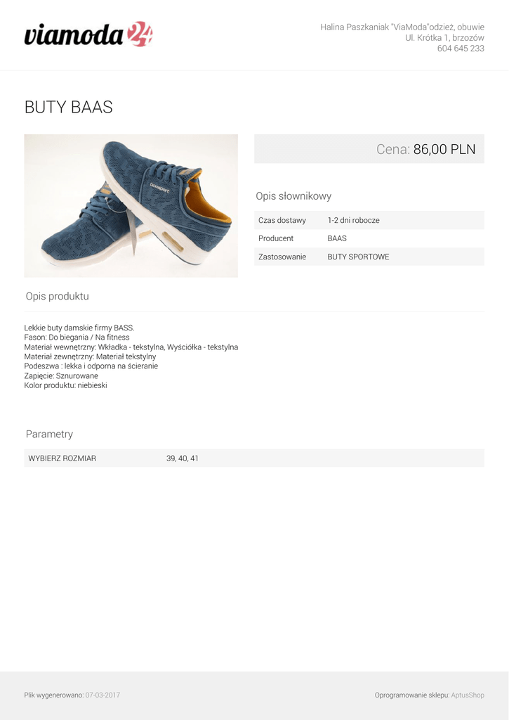 Halina Paszkaniak "ViaModa"odzież, obuwie Ul. Krótka 1, brzozów 604 645 233 BUTY BAAS Cena: 86,00 PLN Opis słownikowy Czas dostawy 1-2 dni robocze Producent BAAS Zastosowanie BUTY SPORTOWE Opis produktu Lekkie buty damskie firmy BASS. Fason: Do biegania / Na fitness Materiał wewnętrzny: Wkładka - tekstylna, Wyściółka - tekstylna Materiał zewnętrzny: Materiał tekstylny Podeszwa : lekka i odporna na ścieranie Zapięcie: Sznurowane Kolor produktu: niebieski Parametry WYBIERZ ROZMIAR Plik wygenerowano: 07-03-2017 39, 40, 41 Oprogramowanie sklepu: AptusShop Halina Paszkaniak "ViaModa"odzież, obuwie Ul. Krótka 1, brzozów 604 645 233 Galeria Plik wygenerowano: 07-03-2017 Powered by TCPDF (www.tcpdf.org) Oprogramowanie sklepu: AptusShop