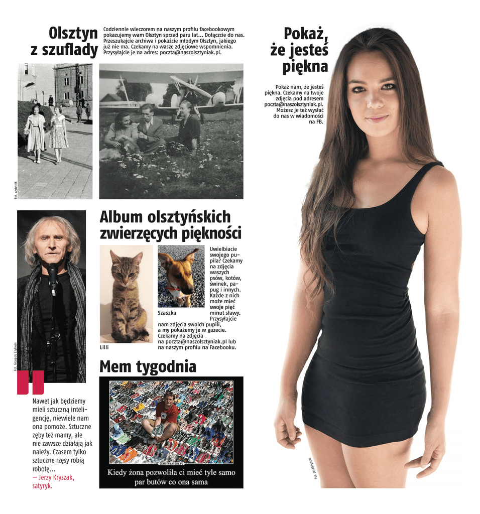 Olsztyn z szuflady Codziennie wieczorem na naszym profilu facebookowym pokazujemy wam Olsztyn sprzed paru lat... Dołączcie do nas. Przeszukajcie archiwa i pokażcie młodym Olsztyn, jakiego już nie ma. Czekamy na wasze zdjęciowe wspomnienia. Przysyłajcie je na adres: [email protected]. Pokaż, że jesteś piękna Fot. czytelnik Pokaż nam, że jesteś piękna. Czekamy na twoje zdjęcia pod adresem [email protected]. Możesz je też wysłać do nas w wiadomości na FB. Fot. Grzegorz Czykwin Album olsztyńskich zwierzęcych piękności Lilli Uwielbiacie swojego pupila? Czekamy na zdjęcia waszych psów, kotów, świnek, papug i innych. Każde z nich może mieć swoje pięć Szaszka minut sławy. Przysyłajcie nam zdjęcia swoich pupili, a my pokażemy je w gazecie. Czekamy na zdjęcia na [email protected] lub na naszym profilu na Facebooku. Nawet jak będziemy mieli sztuczną inteligencję, niewiele nam ona pomoże. Sztuczne zęby też mamy, ale nie zawsze działają jak należy. Czasem tylko sztuczne rzęsy robią robotę... — Jerzy Kryszak, satyryk. y.com ixaba Fot. p Mem tygodnia