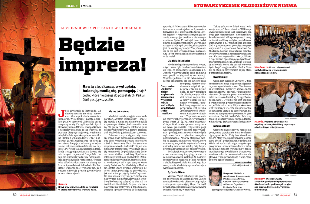 Stowarzyszenie Młodzieżowe Niniwa młodzi i misje L i s t o pa do w e s p o t k a n i e w S i e dl c a c h Będzie impreza! Bawią się, skaczą, wygłupiają, hałasują, modlą się, pomagają. Znajdź cechy, które nie pasują do pozostałych. Psikus! Otóż pasują wszystkie. J Kamil Szubielski est czwartek 10 listopada. Za chwilę zacznie się długi weekend. Młode pokolenie rusza imprezować. W siedleckiej parafii oblackiej pw. Św. Teresy od Dzieciątka Jezus rozpoczyna się XV ogólnopolski Zjazd Stowarzyszenia Młodzieżowego Niniwa i młodzieży oblackiej. To już tradycja, że podczas długiego majowego weekendu młodzi ludzie spotykają się w Kokotku na Śląsku, a w listopadzie w jednej z oblackich parafii. Gospodarze już miesiąc wcześniej biegają z zakasanymi rękawami, żeby wszystko udało się jak najlepiej. Pierwsza fala entuzjazmu uderza, kiedy następują powitania z dawno nie widzianymi znajomymi. Druga fala rozbija się o kościelny ołtarz w rytm piosenek śpiewanych na rozruszanie, trzecia wita oblackich duszpasterzy, siostry zakonne i przedstawicieli władz Siedlec, które wsparły całe wydarzenie. Ten sztorm generuje prawie 300 młodych uczestników zjazdu. 60 misyjne drogi styczeń – luty 2012 Siedlce Krzyż przy którym modliła się młodzież w czasie nabożeństwa w duchu Tazié. Nie ma jak w domu Młodzież została przyjęta w domach parafian. „Jestem księżniczką” – śmieje się Magda z Kalet. Ma dla siebie pokój z ogromnym łóżkiem, balkonem i łazienką. Dla grupy chłopaków z Kokotka pani gospodyni przygotowała zestaw greckich dań. Wschodnia gościnność jest cudowna. Dzień rozpoczyna się jutrznią. Jeszcze jedna, dwie piosenki na rozbudzenie i do akcji wkraczają siostry misjonarki miłości z Warszawy. Choć charyzmatem rozpoznawalnych „Kalkutek” nie jest wygłaszanie przemówień, wyjątkowo udało się je namówić do podzielenia się świadectwem służby i modlitwy. Spotkanie młodzieży przebiega pod hasłem „Zakorzenieni i zbudowani na Chrystusie, mocni w wierze (Kol 2,7)” – tym samym, które nosiły Światowe Dni Młodzieży w Madrycie. Siostra Charis świetnie wpasowuje się w ten temat, pokazując na przykładach, jak ważne jest przylgnięcie do Chrystusa. On sam działa w sytuacjach, które dla nas wydają się nierozwiązywalne. Trzeba tylko bardziej polegać na Nim niż na swoich możliwościach. Po przerwie czas na ćwiczenia praktyczne z tego tematu, adorację i przygotowanie do wieczornej spowiedzi. Wieczorem kilkunastu oblatów wraz z prowincjałem, o. Ryszardem Szmydkim OMI staje wokół ołtarza. „Żyjcie mądrze” – rozpoczyna intrygująco kazanie, nawiązując do słów z pierwszego czytania. Ojciec Prowincjał przechodzi powoli do autentyczności w wierze. Nie ma sensu żyć na pół gwizdka, skoro pełnia jest na wyciągnięcie ręki. Zdecydowanie się na ten gest wymaga jednak mądrości. Czy ja też chcę zapuścić silne korzenie w Jezusie? Dla ciała i dla ducha Młodzież chętnie używa słowa wypas, a tym razem było ono bardzo adekwatne do tego, co zastaliśmy. Gospodarze z o. Janem Wlazłym OMI na czele zamówili nam posiłki w eleganckiej restauracji. Wspólne jedzenie to nie tylko wzmocnienie organizmu, ale też świetny czas integracji, rozmów i buCharyzmatem dowania więzi. O tym, „Kalkutek” że przy jedzeniu się nie gada, bo się w brzuszku nie jest wygłaszanie źle układa, na tych kilka dni można zapomnieć. przemówień, wyjątkowo A kiedy jeszcze się nie gada? W teatrze. Popojednak łudniowym gwoździem podzieliły się programu jest sztuka świadectwem „Przezroczystość” w Censłużby trum Kultury w Siedli modlitwy. cach. To przedstawienie na motywach twórczości wystawione przez Teatr „S” śp. ks. Jana Twardowskiego. Doskonała oprawa muzyczna na żywo, gra światła, reżyserskie gagi wkomponowane w świetne teksty wierszy i profesjonalizm aktorski młodych wykonawców – to tylko bardzo ogólne podsumowanie. Aktorzy otrzymali owacje na stojąco, a katowicka Niniwa, która ma następnego dnia wystawiać swoją autorską, amatorską sztukę, drży, bo poprzeczka zawieszona jest bardzo wysoko. Po kolacji jeszcze trochę wolnego czasu na rozmowy i wygłupy, a wieczorem znowu chwila refleksji. W kościele rozpoczyna się modlitwa z Taizé. Młodzież z siedleckiego oddziału Katolickiego Stowarzyszenia Młodzieży wprowadza odpowiednią atmosferę. Być świadkiem Wieczór Taizé zakończył się procesją ze świecami po ulicach parafii. Jakieś nieżyczliwe krzyki z okien zostają zagłuszone przez śpiewający tłum. Na myśl przychodzą skojarzenia ze Światowymi Dniami Młodzieży w Madrycie. www.misyjnedrogi.pl Także sobota to dzień wyrażania swojej wiary. O. Leon Nieścior OMI kieruje uwagę młodzieży na fakt, iż człowiek bez Boga jest niespełniony i nieszczęśliwy. Przedstawia też kilka praktycznych uwag na temat modlitwy medytacyjnej. Jeszcze Eucharystia z o. Franciszkiem Bokiem OMI – proboszczem, po obiedzie garść wspomnień z wyjazdu na Światowe Dni Młodzieży. Późnym popołudniem członkowie Stowarzyszenia Młodzieżowego Niniwa z Katowic wystawili sztukę pt.„Ulotka o Eugeniuszu” opowiadającą o żywotności charyzmatu oblaciego. „Ubogim jest każdy człowiek, który nie poznał w swoim życiu Boga” – wyjaśnia Pan Ulotka. Oklaski na stojąco natychmiast zdjęły stres z przejętych aktorów. Kamil szubielski Wspólnota. Przez cały weekend spotykaliśmy się we wspólnocie doświadczając jej siły. Uwielbiamy! Czym jest Wieczór Chwały? O tym młodzi i starsi mogą się przekonać jeszcze tego samego dnia wieczorem. To mieszanka uwielbienia, modlitwy, śpiewu, tańca oraz świadectw i adoracji. Takie zakorzenienie w Chrystusie pokazała siedlecka młodzież z Akademickiej Grupy Ewangelizacyjnej. Uwielbienie jest jednym z ważniejszych przeżyć uczestniczącej w zjeździe młodzieży. Miłym akcentem jes
