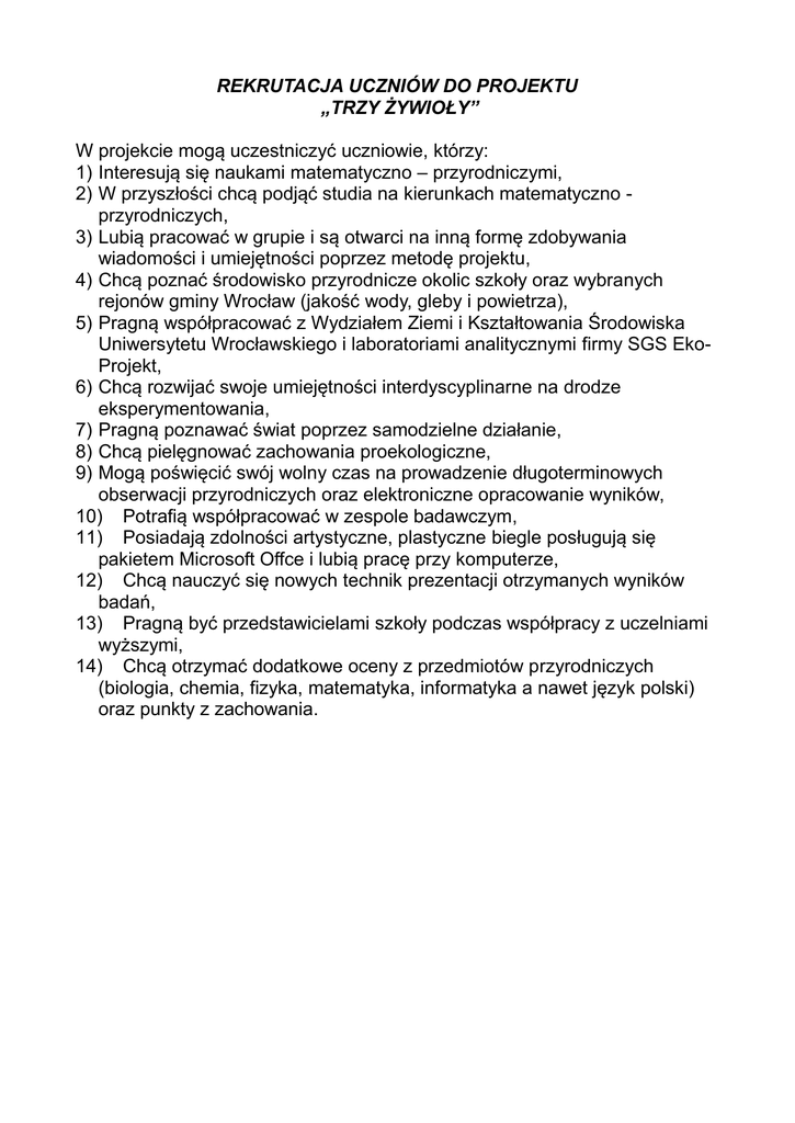REKRUTACJA UCZNIÓW DO PROJEKTU „TRZY ŻYWIOŁY” W projekcie mogą uczestniczyć uczniowie, którzy: 1) Interesują się naukami matematyczno – przyrodniczymi, 2) W przyszłości chcą podjąć studia na kierunkach matematyczno przyrodniczych, 3) Lubią pracować w grupie i są otwarci na inną formę zdobywania wiadomości i umiejętności poprzez metodę projektu, 4) Chcą poznać środowisko przyrodnicze okolic szkoły oraz wybranych rejonów gminy Wrocław (jakość wody, gleby i powietrza), 5) Pragną współpracować z Wydziałem Ziemi i Kształtowania Środowiska Uniwersytetu Wrocławskiego i laboratoriami analitycznymi firmy SGS EkoProjekt, 6) Chcą rozwijać swoje umiejętności interdyscyplinarne na drodze eksperymentowania, 7) Pragną poznawać świat poprzez samodzielne działanie, 8) Chcą pielęgnować zachowania proekologiczne, 9) Mogą poświęcić swój wolny czas na prowadzenie długoterminowych obserwacji przyrodniczych oraz elektroniczne opracowanie wyników, 10) Potrafią współpracować w zespole badawczym, 11) Posiadają zdolności artystyczne, plastyczne biegle posługują się pakietem Microsoft Offce i lubią pracę przy komputerze, 12) Chcą nauczyć się nowych technik prezentacji otrzymanych wyników badań, 13) Pragną być przedstawicielami szkoły podczas współpracy z uczelniami wyższymi, 14) Chcą otrzymać dodatkowe oceny z przedmiotów przyrodniczych (biologia, chemia, fizyka, matematyka, informatyka a nawet język polski) oraz punkty z zachowania. Jeśli jesteś zainteresowany pracą w projekcie prosimy o napisanie listu motywującego, w którym będą zawarte następujące informacje: 1) Nazwisko i imię, klasa (zdjęcie mile widziane) 2) Około 15 – 20 zdań, dlaczego chcesz uczestniczyć w projekcie? 3) Prezentacja swoich zainteresowań w szczególności z zakresu nauk matematyczno przyrodniczych: a) Praca przy komputerze ( rysowanie tabel, wykresów, przygotowywanie prezentacji multimedialnych), b) Zdolności artystyczne lub plastyczne, c) Umiejętność pracy w grupie, d) Posiadanie takich cech jak: skrupulatność, dokładność, sumienność, punktualność, dotrzymywanie terminów itp., 4) Inne zdolności (dociekliwość, kreatywność, poszukiwanie nowych rozwiązań, stawianie odważnych hipotez). ROZPROPAGOWANIE PROJEKTU WŚRÓD UCZNIÓW 1. Informacja na tablicach przy wejściu do szkoły, 2. Informacje na tablicach informacyjnych przy salach biologiczno – chemicznych, 3. Informacje na zebraniach z rodzicami, 4. Informacje dla wychowawców klas z prośbą o monitowanie z napisania listu motywacyjnego, 5. Ulotki dla uczniów z treścią listu motywacyjnego, 6. Prośba do nauczycieli języka polskiego o przedstawienie, w jaki sposób prawidłowo napisać taki list. 7. Zamieszczenie informacji o projekcie na stronie internetowej szkoły i Platformie edukacyjnej Fronter, 8. Kolorowe plakaty oraz postery z pracy uczniów, 9. Krótkie rymowanki zachęcające do wzięcia udziału w powyższym projekcie jako ewaluacja, 10. Wymyślenie charakterystycznego, śmiesznego logo tylko naszej szkoły związane z projektem. REGULAMIN REKRUTACJI UCZNIÓW DO PROJEKTU 1. W rekrutacji biorą udział wszyscy uczniowie, którzy w wyznaczonym terminie złożą list motywacyjny do zaplecza chemicznego 26a. 2. Do projektu przystąpią uczniowie, którzy zdobędą największą liczbę punktów z listu motywacyjnego przyznanych przez Szkolną Komisję Rekrutacyją. 3. Skład Szkolnej Komisji Rekrutacyjnej ustala Szkolny Koordynator Projektu i dyrektor szkoły. 4. W skład Szkolnej Komisji Rekrutacyjnej wchodzą nauczyciele uczący zarówno przedmiotów ścisłych, jak i humanistycznych uczestniczący w projekcie, 5. Uczniowie, którzy zostaną zakwalifikowani do projektu, biorą w nim udział przez jeden semestr z możliwością uczestnictwa w kolejnej edycji , 6. Po okresie jednego semestru uczniowie przygotowują sprawozdanie ze swojej działalności badawczej, 7. Forma sprawozdania zostanie ustalona uczniów biorących udział w projekcie np. poster, prezentacja multimedialna lub inna forma. 8. Uczniowie, którzy bardzo angażują się w pracę i dotrzymują terminów otrzymają za zgodą nauczyciela prowadzącego i dyrekcji szkoły ocenę semestralną wyższą o jeden stopień z przedmiotów biologia i chemia ( wyjątek stanowią osoby zagrożone z wymienionych przedmiotów), lub dodatkowe oceny cząstkowe z przedmiotów objętych projektem. 9. Uczniowie uczestniczący w projekcie otrzymują dodatkowe dodatnie punkty z zachowania od 1 do 10 w semestrze, 10. Uczniowie szczególnie wyróżniający się i uczestniczący w projekcie otrzymują pochwałę wychowawcy lub dyrektora szkoły, 11. W przypadku dużego zainteresowania udziałem w projekcie komisja rekrutacyjna przygotowuje listę rezerwową, 12. W przypadku nie spełniania przez ucznia warunków pracy w projekcie lub niedotrzymywania terminów następuje wymiana ucznia na ucznia z listy rezerwowej.