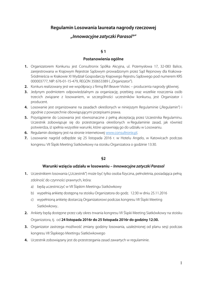 Regulamin Losowania laureata nagrody rzeczowej „Innowacyjne zatyczki Parasol®” §1 Postanowienia ogólne 1. Organizatorem Konkursu jest Consultronix Spółka Akcyjna, ul. Przemysłowa 17, 32-083 Balice, zarejestrowana w Krajowym Rejestrze Sądowym prowadzonym przez Sąd Rejonowy dla KrakowaŚródmieścia w Krakowie XI Wydział Gospodarczy Krajowego Rejestru Sądowego pod numerem KRS 000003777, NIP: 676-01-15-479, REGON 350653389 ( „Organizator”). 2. Konkurs realizowany jest we współpracy z firmą BVI Beaver Visitec – producenta nagrody głównej. 3. Jedynym podmiotem odpowiedzialnym za organizację, przebieg oraz wszelkie roszczenia osób trzecich związane z losowaniem, w szczególności uczestników konkursu, jest Organizator i producent. 4. Losowanie jest organizowane na zasadach określonych w niniejszym Regulaminie („Regulamin”) i zgodnie z powszechnie obowiązującymi przepisami prawa. 5. Przystąpienie do Losowania jest równoznaczne z pełną akceptacją przez Uczestnika Regulaminu. Uczestnik zobowiązuje się do przestrzegania określonych w Regulaminie zasad, jak również potwierdza, iż spełnia wszystkie warunki, które uprawniają go do udziału w Losowaniu. 6. Regulamin dostępny jest na stronie internetowej www.consultronix.pl. 7. Losowanie nagród odbędzie się 25 listopada 2016 r. w Hotelu Angelo, w Katowicach podczas kongresu: VII Śląski Meeting Siatkówkowy na stoisku Organizatora o godzinie 13:30. §2 Warunki wzięcia udziału w losowaniu – Innowacyjne zatyczki Parasol 1. Uczestnikiem losowania („Uczestnik”) może być tylko osoba fizyczna, pełnoletnia, posiadająca pełną zdolność do czynności prawnych, która: a) będą uczestniczyć w VII Śląskim Meetingu Siatkówkowy b) wypełnią ankietę dostępną na stoisku Organizatora do godz. 12:30 w dniu 25.11.2016 c) wypełnioną ankietę dostarczą Organizatorowi podczas kongresu VII Śląski Meeting Siatkówkowy.. 2. Ankiety będą dostępne przez cały okres trwania kongresu VII Śląski Meeting Siatkówkowy na stoisku Organizatora, tj. od 24 listopada 2016r do 25 listopada 2016r do godziny 12:30. 3. Organizator zastrzega możliwość zmiany godziny losowania, uzależnionej od planu sesji podczas kongresu VII Śląskiego Meetingu Siatkówkowego 4. Uczestnik zobowiązany jest do przestrzegania zasad zawartych w regulaminie. 1 §3 Wyłonienie zwycięzcy Losowania 1. Nad prawidłowością przebiegu Losowania będzie czuwać Komisja w składzie: a. Agnieszka Sotoła b. Tomasz Pragłowski 2. W przypadku braku możliwości stawienia się w miejscu Losowania członka Komisji, zobligowany jest on do wyznaczenia zastępcy. 3. Losowanie odbędzie się 25.11.2016r., o godzinie 13:30, w miejscu konferencji Hotel Angelo w Katowicach ul. Sokolska 24 40-086 Katowice Losowanie w szklanej kuli zostaje uwiecznione na zdjęciu i wraz z wynikiem Losowania zamieszczone na stronie Organizatora www.consultronix.pl, w czasie nie przekraczającym 7 dni od ukończenia Losowania. 4. Komisja wylosuje 2 Uczestników, którzy otrzymają nagrody. §5 Nagroda 1. Nagrodą w Konkursie jest: a) Zatyczki Parasol® pre-loaded Punctual Occluder; rozmiar M firmy BVI Beaver Visitec; b) Zatyczki Parasol®pre-loaded Punctual Occluder; rozmiar L firmy BVI Beacer Visitec 2. Nagrody nie podlegają zamianie na inne nagrody rzeczowe ani na ich równowartość pieniężną. 3. Imię i nazwisko zwycięzców losowania, zostanie opublikowane na stronie www.consultronix.pl. Nagrodę należy odebrać osobiści w dniu losowania. W przypadku nieodebrania nagrody Organizator skontaktuje się ze zwycięzcą w celu ustalenia sposobu dostarczenia nagrody. 4. W przypadku gdy wylosowana osoba nie odbierze nagrody oraz Organizatorowi nie uda się z nią skontaktować do 7 dni od dnia losowania, losowanie zostanie przeprowadzone ponownie w siedzibie firmy Consultronix. Wynik powtórnego losowania zostanie opublikowany na stronie www.consultronix.pl.. §6 Dane osobowe 1. Przystępując do Losowania Uczestnik wyraża zgodę na: 2 a) gromadzenie i przetwarzanie moich danych osobowych przez organizatora losowania „Innowacyjne zatyczki Parasol” na potrzeby w/w konkursu. (zgodnie z ustawa z dnia 29 sierpnia 1997 r. o ochronie danych osobowych, Dz.U. 1997 Nr 133, poz. 883 z późn. zm.). b) Wyrażam zgodę na przetwarzanie moich danych osobowych w celach handlowych i marketingowych prowadzonych przez firmę Consultronix SA oraz przez podmioty powiązane z firmą Consultronix SA. Zgodnie z ustawa o ochronie danych osobowych (Ustawa z dnia 29.08.1997r. o ochronie danych osobowych Dz.U. Nr 133, poz 88). c) Wyrażam zgodę na otrzymywanie informacji handlowych i marketingowych droga elektroniczna na podany powyżej adres poczty elektronicznej wysyłanych przez firmę Consultronix SA oraz podmioty powiązane z firma Consultronix SA. Zgodnie z cała ustawa o świadczeniu usług droga elektroniczna (Ustawa z dnia 18 lipca 2002r. Dz.U. Nr 144, poz 1204). 2. Administratorem bazy danych zawierającej Dane Osobowe Uczestników, w rozumieniu Ustawy o ochronie danych osobowych jest Organizator. 3. Podanie danych osobowych jest dobrowolne, z zastrzeżeniem, że ich niepodanie lub podanie chociażby częściowo nieprawdziwych bądź nieprawidłowych danych osobowych uniemożliwia udział w Losowaniu lub będzie podstawą niewydania Nagrody. Dane Osobowe będą przetwarzane i wykorzystywane przez Organizatora i Zamawiającego wyłącznie dla celów wskazanych w Regulaminie. §9 Postanowienia końcowe 1. Organizator zastrzega sobie prawo do wprowadzenia zmian w Regulaminie. Zmieniony Regulamin będzie obowiązywać od chwili jego opublikowania na stronie www.consultronix.pl. 2. Organizator uprawniony jest do zmiany postanowień niniejszego Regulaminu. 3. Przystąpienie do Losowania jest dobrowolne. 4. Przystąpienie do Losowania jest równoznaczne z akceptacją warunków niniejszego Regulaminu. 5. W sprawach nieuregulowanych niniejszym Regulaminem zastosowanie znajdu