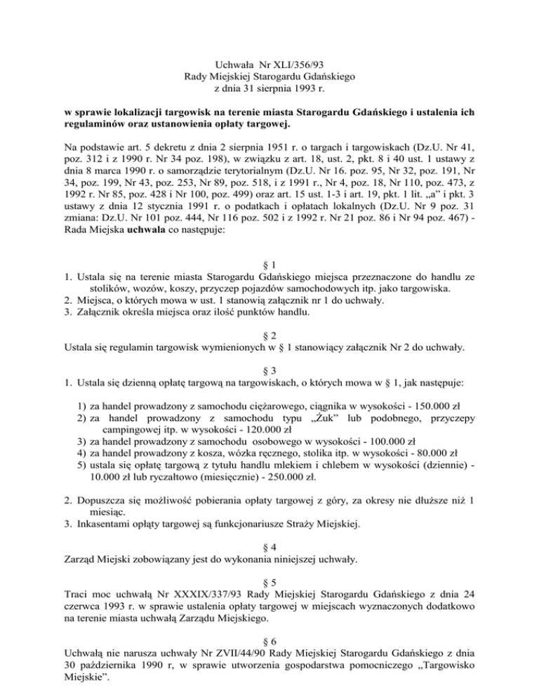 Uchwała Nr XLI/356/93 Rady Miejskiej Starogardu Gdańskiego z dnia 31 sierpnia 1993 r. w sprawie lokalizacji targowisk na terenie miasta Starogardu Gdańskiego i ustalenia ich regulaminów oraz ustanowienia opłaty targowej. Na podstawie art. 5 dekretu z dnia 2 sierpnia 1951 r. o targach i targowiskach (Dz.U. Nr 41, poz. 312 i z 1990 r. Nr 34 poz. 198), w związku z art. 18, ust. 2, pkt. 8 i 40 ust. 1 ustawy z dnia 8 marca 1990 r. o samorządzie terytorialnym (Dz.U. Nr 16. poz. 95, Nr 32, poz. 191, Nr 34, poz. 199, Nr 43, poz. 253, Nr 89, poz. 518, i z 1991 r., Nr 4, poz. 18, Nr 110, poz. 473, z 1992 r. Nr 85, poz. 428 i Nr 100, poz. 499) oraz art. 15 ust. 1-3 i art. 19, pkt. 1 lit. „a” i pkt. 3 ustawy z dnia 12 stycznia 1991 r. o podatkach i opłatach lokalnych (Dz.U. Nr 9 poz. 31 zmiana: Dz.U. Nr 101 poz. 444, Nr 116 poz. 502 i z 1992 r. Nr 21 poz. 86 i Nr 94 poz. 467) Rada Miejska uchwala co następuje: §1 1. Ustala się na terenie miasta Starogardu Gdańskiego miejsca przeznaczone do handlu ze stolików, wozów, koszy, przyczep pojazdów samochodowych itp. jako targowiska. 2. Miejsca, o których mowa w ust. 1 stanowią załącznik nr 1 do uchwały. 3. Załącznik określa miejsca oraz ilość punktów handlu. §2 Ustala się regulamin targowisk wymienionych w § 1 stanowiący załącznik Nr 2 do uchwały. §3 1. Ustala się dzienną opłatę targową na targowiskach, o których mowa w § 1, jak następuje: 1) za handel prowadzony z samochodu ciężarowego, ciągnika w wysokości - 150.000 zł 2) za handel prowadzony z samochodu typu „Żuk” lub podobnego, przyczepy campingowej itp. w wysokości - 120.000 zł 3) za handel prowadzony z samochodu osobowego w wysokości - 100.000 zł 4) za handel prowadzony z kosza, wózka ręcznego, stolika itp. w wysokości - 80.000 zł 5) ustala się opłatę targową z tytułu handlu mlekiem i chlebem w wysokości (dziennie) 10.000 zł lub ryczałtowo (miesięcznie) - 250.000 zł. 2. Dopuszcza się możliwość pobierania opłaty targowej z góry, za okresy nie dłuższe niż 1 miesiąc. 3. Inkasentami opłąty targowej są funkcjonariusze Straży Miejskiej. §4 Zarząd Miejski zobowiązany jest do wykonania niniejszej uchwały. §5 Traci moc uchwałą Nr XXXIX/337/93 Rady Miejskiej Starogardu Gdańskiego z dnia 24 czerwca 1993 r. w sprawie ustalenia opłaty targowej w miejscach wyznaczonych dodatkowo na terenie miasta uchwałą Zarządu Miejskiego. §6 Uchwałą nie narusza uchwały Nr ZVII/44/90 Rady Miejskiej Starogardu Gdańskiego z dnia 30 października 1990 r, w sprawie utworzenia gospodarstwa pomocniczego „Targowisko Miejskie”. §7 1. Uchwała wchodzi w życie z dniem ogłoszenia. 2. Uchwałą podlega ogłoszeniu w prasie lokalnej i trzykrotnie w Starogardzkiej Telewizji Kablowej z tym, że za datę ogłoszenia przyjmuje się datę ukazania się uchwały w prasie lokalnej. Przewodnicząca Rady Miejskiej Starogardu Gdańskiego Grażyna Hoppe Zał. Nr 1 do uchwały Rady Miejskiej Nr XLI/356/93 z dnia 31 sierpnia 1993 r. Wyznaczenie miejsc targowych na terenie miasta 1. 1) al. Wojska Polskiego (pomiędzy kioskiem i sklepem „Albion”) - jedno miejsce (ze stolika) 2. róg al. Wojska Polskiego (Grunwaldzka) naprzeciw sklepu piekarniczego (jedno miejsce ze stolika), 3. plac przy ul. Gimnazjalnej - jedno miejsce (ze stolika), 4. chodnik przy al. Jana Pawła II (obok budki z lodami) - jedno miejsce (ze stolika), 5. osiedle 60-lecia Odzyskania Niepodległości Polski (parking przy pawilonie handlowym) - na terenie Spółdzielni Mieszkaniowej „Kociewie” - 1 miejsce, 6. róg ul. Juranda ze Spychowa (Droga Nowowiejska) na terenie Spółdzielni Mieszkaniowej „Kociewie” - jedno miejsce, 7. parking przy al. Wojska Polskiego - 1 miejsce, 8. plac przy ul. Kilińskiego - do 10 miejsc, 9. os. Konstytucji 3 Maja - parking przy budynku Nr 2 - na terenie SM - 1 miejsce, 10.os. Konstytucji 3 Maja - parking przy stacji cieplnej - 3 miejsca, 11.ul. Juranda ze Spychowa - parking przy bud. 21-13 - 1 miejsce, 12.os. Kopernika - plac asfaltowy przy baraku Nr 19a - 2 miejsca, 13.os. Kopernika - plac między DK a hydrofornią - 1 miejsce, 14.al. Jana Pawła II - plac przy bud. 37-39 - 1 miejsce. 2. Postanowienia ust. 1 nie dotyczą sprzedaży mleka i chleba, którą to sprzedaż dopuszcza się w następujących miejscach: 1) 2) 3) 4) 5) 6) 7) 8) 9) 10) 11) os. Konstytucji 3 Maja, os. 60-lecia Odzyskania Niepodległości, os. Kopernika, Al. Wojska Polskiego, ul. Traugutta, ul. Pelplińska, Pomorska, os. Piastów, Al. Jana Pawła II, ul. Kryzana, ul. Skarszewska, os. Ks. Szumana. Przewodnicząca Rady Miejskiej Starogardu Gdańskiego Grażyna Hoppe Zał. nr 2 do uchwały Rady Miejskiej Nr XLI/356/93 z dnia 31 sierpnia 93 r. Regulamin miejsc targowych wyznaczonych na terenie miasta §1 1. Handel targowy poza targowiskiem, w miejscach do tego wyznaczonych uchwałą Rady Miejskiej Nr XLI/356/93 z dnia 31 sierpnia 1993 r. może odbywać się codziennie, po uzyskaniu zezwolenia wydanego przez Prezydenta Miasta. 2. W miejscach dodatkowo wyznaczonych może odbywać się handel art. spożywczymi, z wyłączeniem napojów alkoholowych oraz art. spożywczych, których sprzedaży w handlu obwoźnym zakazują przepisy sanitarne. §2 1. O zezwolenie ubiegać się mogą: 2. wszystkie podmioty gospodarcze prowadzące działalność statutową lub rejestrowaną działalność gospodarczą, 3. posiadacze i użytkownicy indywidualnych gospodarstw rolnych i działek przydomowych, 4. użytkownicy działek w pracowniczych ogrodach działkowych. 2. Handel w miejscach wyznaczonych dodatkowo może się odbywać z kosza, wózka ręcznego, stolika, samochodu osobowego, ciężarowego, samochodu typu „Żuk” lub podobnego, przyczepy campingowej i samochodowej. 3. Urządzenie handlowe musi być usunięte, a teren uprzątnięty każdego dnia po zakończeniu sprzedaży. §3 1. Osoby prowadzące handel w miejscach dodatkowo wyznaczonych obowiązane są do przestrzegania niniejszego 