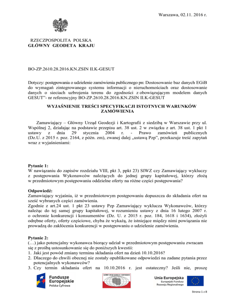 Warszawa, 02.11. 2016 r. RZECZPOSPOLITA POLSKA GŁÓWNY GEODETA KRAJU BO-ZP.2610.28.2016.KN.ZSIN II.K-GESUT Dotyczy: postępowania o udzielenie zamówienia publicznego pn: Dostosowanie baz danych EGiB do wymagań zintegrowanego systemu informacji o nieruchomościach oraz dostosowanie danych o sieciach uzbrojenia terenu do zgodności z obowiązującym modelem danych GESUT”- nr referencyjny BO-ZP.2610.28.2016.KN.ZSIN II.K-GESUT WYJAŚNIENIE TREŚCI SPECYFIKACJI ISTOTNYCH WARUNKÓW ZAMÓWIENIA Zamawiający – Główny Urząd Geodezji i Kartografii z siedzibą w Warszawie przy ul. Wspólnej 2, działając na podstawie przepisu art. 38 ust. 2 w związku z art. 38 ust. 1 pkt 1 ustawy z dnia 29 stycznia 2004 r. - Prawo zamówień publicznych (Dz.U. z 2015 r. poz. 2164, z późn. zm), zwanej dalej „ustawą Pzp”, przekazuje treść zapytań wraz z wyjaśnieniami: Pytanie 1: W nawiązaniu do zapisów rozdziału VIII, pkt 3, ppkt 23) SIWZ czy Zamawiający wykluczy z postępowania Wykonawców należących do jednej grupy kapitałowej, którzy złożą w przedmiotowym postępowaniu oddzielne oferty na różne części postępowania? Odpowiedź: Zamawiający wyjaśnia, iż w przedmiotowym postępowaniu dopuszcza do składania ofert na sześć wybranych części zamówienia. Zgodnie z art.24 ust. 1 pkt 23 ustawy Pzp Zamawiający wyklucza Wykonawców, którzy należąc do tej samej grupy kapitałowej, w rozumieniu ustawy z dnia 16 lutego 2007 r. o ochronie konkurencji i konsumentów (Dz. U. z 2015 r. poz. 184, 1618 i 1634), złożyli odrębne oferty, oferty częściowe, chyba że wykażą, że istniejące między nimi powiązania nie prowadzą do zakłócenia konkurencji w postępowaniu o udzielenie zamówienia. Pytanie 2: (…) jako potencjalny wykonawca biorący udział w przedmiotowym postępowaniu zwracam się z prośbą ustosunkowanie się do poniższych kwestii: 1. Jaki jest powód zmiany terminu składania ofert na dzień 10.10.2016? 2. Dlaczego do chwili obecnej nie zostały opublikowane odpowiedzi na zadane pytania przez potencjalnych wykonawców? 3. Czy termin składania ofert na 10.10.2016 r. jest ostateczny? Jeśli nie, proszę Strona 1 z 8 o informację na temat nowego terminu? Powyższe pytania podyktowane są czysto praktycznymi względami, a mianowicie uzyskaniem ubezpieczeniowej gwarancji zapłaty wadium i terminami w niej zawartymi. Otóż w dniu 22 września tj. 4 dni przed ostatecznym terminem składania ofert nasza firma (przypuszczamy jednak, że większość firm także) uzyskała przedmiotową gwarancję ze ściśle określonymi terminami zawartymi w SIWZ. Był to dzień w którym zamierzaliśmy przesłać ofertę do Zamawiającego korzystając z operatora pocztowego. Sytuacja związana z przesunięciem terminu składania ofert spowodowała, że ubezpieczeniowa gwarancja zapłaty wadium stała się nieważna. W chwili obecnej aby ponownie wziąć udział w przetargu należy rzeczoną gwarancję zmienić (prolongować). Nie wiemy jednak czy ostatecznym terminem składania ofert jest dzień 10.10.2016. Zamawiający naraża w ten sposób potencjalnych wykonawców na niepotrzebne koszty, a co więcej może powodować, że przygotowane gwarancje załączone do ofert mogą być nieważne ze względu na niezgodności w terminach. Z tego też względu prosimy o rzetelne i wcześniejsze informowanie potencjalnych wykonawców w zakresie wyżej wymienionych kwestii. Zmiany na stanowiskach kierowniczych w GUGiK nie powinny być tego przeszkodą. Proszę równocześnie o jak najszybszą odpowiedź na niniejsze pismo. Odpowiedź: Zamawiający dokonał w dniu 19.10.2016 r. zmian w przedmiotowym postępowaniu i przedłużył odpowiednio termin składania i otwarcia ofert. Pytanie nr 3 Niniejszym zwracam się uprzejmie z zapytaniem, czy w zamówieniu publicznym o numerze referencyjnym BO-ZP.2610.28.2016.KN.ZSIN II. K-GESUT, którego przedmiotem jest: „Dostosowanie baz danych EGiB do wymagań zintegrowanego systemu informacji o nieruchomościach oraz dostosowanie danych o sieciach uzbrojenia terenu do zgodności z obowiązującym modelem danych GESUT” (dla 17 części, od 13 do 29) będą miały zastosowanie wyjaśnienia dotyczące warunków technicznych realizacji zamówienia, których Zamawiający udzielił w ramach poprzedniego postępowania o numerze referencyjnym BO-ZP.2610.14.2016.KN.ZSIN II. K-GESUT (dla 12 części)? W szczególności chodzi mi o odpowiedź na pytanie nr 3, zawartą w wyjaśnieniach treści SIWZ z dnia 18.04.2016 r. do postępowania o numerze referencyjnym BOZP.2610.14.2016.KN.ZSIN II. K-GESUT (kopia pisma z treścią wyjaśnień w załączeniu). Główny Geodeta Kraju w wyjaśnieniach tych stwierdza: „Zgodnie z opisaną sytuacją, w przypadku gdy w PZGiK brak jest wiarygodnych dokumentów umożliwiających ustalenie danych określających przebieg granic działek ewidencyjnych, a jednocześnie zainteresowani właściciele lub władający tymi działkami nie wskażą zgodnie przebiegu granic tych działek oraz w odniesieniu do objętych tymi działkami gruntów nie można stwierdzić spokojnego stanu posiadania, Wykonawca ustali dane określające przebieg granic tych działek oraz położenie punktów granicznych na zasadach określonych w § 39 ust. 3 rozporządzenia w sprawie EGiB, wykorzystując w szczególności do tego celu odpowiedni fragment dotychczasowej mapy ewidencyjnej w postaci rastrowej, wpasowany metodą transformacji afinicznej w punkty dostosowania, którymi powinny być punkty graniczne nieruchomości sąsiednich oraz jednoznacznie zidentyfikowane punkty graniczne tych działek, co zostało opisane w SIWZ. W takim przypadku, współrzędne punktów granicznych wykonawca określi na podstawie pomiaru kartometrycznego. W związku z powyższym pomiar punktów granicznych w terenie jest bezprzedmiotowy. Ponadto wyjaśniam, iż przedmiot niniejszego zamówienia nie obejmuje zadań związanych z wyznaczaniem i okazywaniem tak ustalonych Strona 2 z
