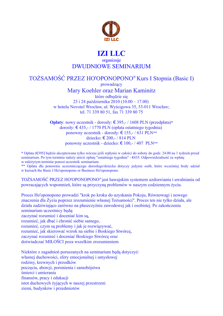 IZI LLC organizuje DWUDNIOWE SEMINARIUM TOŻSAMOŚĆ PRZEZ HO'OPONOPONO® Kurs I Stopnia (Basic I) prowadzący Mary Koehler oraz Marian Kaminitz które odbędzie się 23 i 24 października 2010 (10.00 – 17.00) w hotelu Novotel Wrocław, ul. Wyścigowa 35, 53-011 Wrocław; tel. 71 339 80 51, fax 71 339 80 75 Opłaty: nowy uczestnik - dorosły: € 395,- / 1608 PLN (przedpłata)* dorosły: € 435,- / 1770 PLN (opłata ostatniego tygodnia) ponowny uczestnik - dorosły: € 155,- / 631 PLN** dziecko: € 200,- / 814 PLN ponowny uczestnik - dziecko: € 100,- / 407 PLN** * Opłata (€395) będzie akceptowana tylko wóczas jeśli wpłynie w całości do soboty do godz. 24.00 na 1 tydzień przed seminarium. Po tym terminie należy uiścić opłatę "ostatniego tygodnia" - €435. Odpowiedzialność za wpłatę w należytym terminie ponosi uczestnik seminarium. ** Opłata dla ponownie uczestniczącego dorosłego/dziecka dotyczy jedynie osób, które wcześniej brały udział w kursach the Basic I Ho'oponopono or Business Ho'oponopono. TOŻSAMOŚĆ PRZEZ HO'OPONOPONO® jest hawajskim systemem uzdrawiania i uwalniania od powracających wspomnień, które są przyczyną problemów w naszym codziennym życiu. Proces Ho'oponopono prowadzi "krok po kroku do uzyskania Pokoju, Równowagi i nowego znaczenia dla Życia poprzez zrozumienie własnej Tożsamości". Proces ten nie tylko działa, ale działa zadziwiająco zarówno na płaszczyźnie zawodowej jak i osobistej. Po zakończeniu seminarium uczestnicy będą: zaczynać rozumieć i doceniać kim są, rozumieć, jak dbać i chronić siebie samego, rozumieć, czym są problemy i jak je rozwiązywać, rozumieć, jak skierować wzrok na siebie i Boskiego Stwórcę, zaczynać rozumieć i doceniać Boskiego Stwórcę oraz doświadczać MIŁOŚCI poza wszelkim zrozumieniem Niektóre z zagadnień poruszanych na seminarium będą dotyczyć: własnej duchowości, sfery emocjonalnej i umysłowej rodziny, krewnych i przodków poczęcia, aborcji, poronienia i samobójstwa śmierci i umierania finansów, pracy i edukacji istot duchowych żyjących w naszej przestrzeni ziemi, budynków i przedmiotów Seminarium trwa 2 dni, w czasie których uczestnicy uczą się: kim są, czym są problemy, jak je rozwiązać w sobie dzięki oczyszczeniu z toksyn i powracających wspomnień. Dołącz do nas 23 i 24 października 2010 i hooponoponuj swoje życie! IZI LLC organizuje TOŻSAMOŚĆ PRZEZ HO'OPONOPONO® Rejestrując sie na kurs I stopnia zgadzam się z treścią Klauzuli Ograniczonej Odpowiedzialności oraz Umowy Rejestracyjnej, które brzmią: KLAUZULA OGRANICZONEJ ODPOWIEDZIALNOŚCI: Nie ma gwarancji, że cokolwiek, co zostanie uczynione komukolwiek przez The Foundation of I, Inc. Freedom of the Cosmos, jej założycielkę, Morrnah Nalamahu Simeonę, IZI LLC, IHHL LLC, Ho’akamai LLC, Springboard Consulting LLC, Paddy ‘0, LLC, ich założycieli, pracowników, wolontariuszy, sponsorów, koordynatorów oraz instruktorów lub Boską Moc, “Ja”, że system uwalniania stresu oraz tożsamości włączając w to Hooponopono, ale nie tylko, także wszystkie medytacje, wizualizacje, zarządzenia, procesy duchowego oczyszczania i ochrony zawarte w tej książce przyniosą kiedykolwiek określone rezultaty lub pożądane wyniki. Działanie procesu Hooponopono w połączeniu z prawami uniwersalnymi i prawami kosmosu jest bezpośrednim doświadczeniem pomiędzy jednostką, jej wewnętrzną tożsamością oraz Boskością “Ja”. Karma oraz Boska Opatrzność będzie ostatecznym sędzią w każdym indywidualnym procesie Hooponopono. Tylko jednostka może być świadkiem jej osobistego procesu oczyszczania, ochrony ciała, umysłu i ducha poprzez użycie ćwiczeń tutaj zawartych. Rzeczywiste dowody działania procesu Hooponopono spoczywają w każdym indywidualnie, tak więc każdy może doświadczyć lub nie mocy Hooponopono na sobie. UMOWA REJESTRACYJNA: Wpisujesz się na listę IZI LLC, sponsorującego kurs Tożsamość przez Hooponopono, który jest własnością i przedstawiany przez IZI LLC za zgodą The Foundation of I, Inc. Freedom of the Cosmos, edukacyjnej fundacji non-profit, zwanej w Umowie Fundacją. Jest to prawnie wiążąca umowa pomiędzy Tobą, IZI LLC i Fundacją. Poprzez zapisanie się na kurs Tożsamości przez Hooponopono, zgadzasz się i akceptujesz warunki niniejszej Umowy. Jeśli się nie zgadzasz ze wszystkimi warunkami tej Umowy, nie wpisuj się na kurs. Warunki Umowy 1. Informacje o prawach autorskich, do znaku handlowego oraz pozostałych prawach własności Fundacja oraz IZI LLC posiada wszelkie prawa autorskie, prawo do znaku handlowego oraz inne intelektualne prawa własności do wszystkich prezentowanych na kursach Tożsamość przez Hooponopono lub Tożsamość Hooponopono treści, włączając w to, ale nie ograniczając się tylko do: informacji, znaków handlowych, zawartości wykładów, dokumentacji, podręczników, tekstów, artykułów, broszur, ilustracji, szkiców, prezentacji audio-video, procesów, ćwiczeń, narzędzi, ikon oraz wszelkich innych odnośnych materiałów. Nie wolno Ci modyfikować, reprodukować, dystrybuować, wysyłać, transmitowac, nagrywać, filmować, publikować, kreować pochodnych prac, transferować, sprzedawać lub odgrywać żadnych informacji lub materiałów związanych z praktyką Hooponopono w całości, w części ani w żadnym innym znaczeniu bez wcześniejszej pisemnej zgody Fundacji. Podpisując Umowę zobowiązujesz się również nie uczyć, nie wyjawiać, nie dystrystrybuować, nie sprzedawać, nie ogłaszać ani nie udostępniać osobom trzecim w żaden inny sposób, żadnej części intelektualnej własności Tożsamości przez Hooponopono, którą otrzymałeś w jakiejkolwiek postaci bez wcześniejszej pisemnej zgody Fundacji. Zobowiązujesz się również zachować w tajemnicy wszystkie poufne informacje, które otrzymałeś od IZI LLC oraz Fundacji jako rezultat swojej rejestracji i 