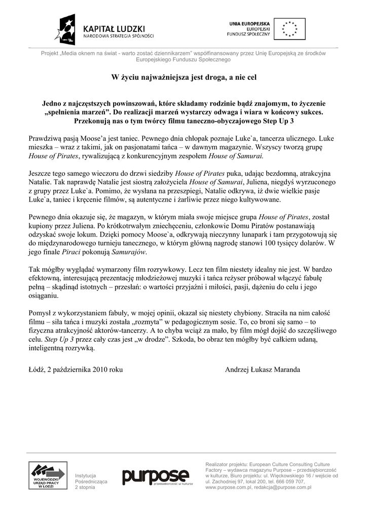 Projekt „Media oknem na świat - warto zostać dziennikarzem” współfinansowany przez Unię Europejską ze środków Europejskiego Funduszu Społecznego W życiu najważniejsza jest droga, a nie cel Jedno z najczęstszych powinszowań, które składamy rodzinie bądź znajomym, to życzenie „spełnienia marzeń”. Do realizacji marzeń wystarczy odwaga i wiara w końcowy sukces. Przekonują nas o tym twórcy filmu taneczno-obyczajowego Step Up 3 Prawdziwą pasją Moose’a jest taniec. Pewnego dnia chłopak poznaje Luke`a, tancerza ulicznego. Luke mieszka – wraz z takimi, jak on pasjonatami tańca – w dawnym magazynie. Wszyscy tworzą grupę House of Pirates, rywalizującą z konkurencyjnym zespołem House of Samurai. Jeszcze tego samego wieczoru do drzwi siedziby House of Pirates puka, udając bezdomną, atrakcyjna Natalie. Tak naprawdę Natalie jest siostrą założyciela House of Samurai, Juliena, niegdyś wyrzuconego z grupy przez Luke`a. Pomimo, że wysłana na przeszpiegi, Natalie odkrywa, iż dwie wielkie pasje Luke`a, taniec i kręcenie filmów, są autentyczne i żarliwie przez niego kultywowane. Pewnego dnia okazuje się, że magazyn, w którym miała swoje miejsce grupa House of Pirates, został kupiony przez Juliena. Po krótkotrwałym zniechęceniu, członkowie Domu Piratów postanawiają odzyskać swoje lokum. Dzięki pomocy Moose`a, odkrywają nieczynny lunapark i tam przygotowują się do międzynarodowego turnieju tanecznego, w którym główną nagrodę stanowi 100 tysięcy dolarów. W jego finale Piraci pokonują Samurajów. Tak mógłby wyglądać wymarzony film rozrywkowy. Lecz ten film niestety idealny nie jest. W bardzo efektowną, interesującą prezentację młodzieżowej muzyki i tańca reżyser próbował włączyć fabułę pełną – skądinąd istotnych – przesłań: o wartości przyjaźni i miłości, pasji, dążeniu do celu i jego osiąganiu. Pomysł z wykorzystaniem fabuły, w mojej opinii, okazał się niestety chybiony. Straciła na nim całość filmu – siła tańca i muzyki została „rozmyta” w pedagogicznym sosie. To, co broni się samo – to fizyczna atrakcyjność aktorów-tancerzy. A to chyba wciąż za mało, by film mógł dojść do szczęśliwego celu. Step Up 3 przez cały czas jest „w drodze”. Szkoda, bo obraz ten mógłby być całkiem udaną, inteligentną rozrywką. Łódź, 2 października 2010 roku Instytucja Pośrednicząca 2 stopnia Andrzej Łukasz Maranda Realizator projektu: European Culture Consulting Culture Factory – wydawca magazynu Purpose – przedsiębiorczość w kulturze, Biuro projektu: ul. Więckowskiego 16 / wejście od ul. Zachodniej 97, lokal 200, tel. 666 059 707, www.purpose.com.pl, [email protected]
