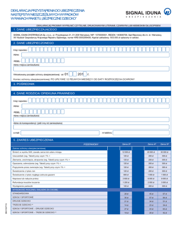 DEKLARACJAPRZYSTĄPIENIADOUBEZPIECZENIA NASTĘPSTWNIESZCZĘŚLIWYCHWYPADKÓW WRAMACHPAKIETU„BEZPIECZNEDZIECKO” DEKLARACJĘ PROSIMY WYPEŁNIĆ CZYTELNIE, DRUKOWANYMI LITERAMI, CZARNYM LUB NIEBIESKIM DŁUGOPISEM 1. DANE UBEZPIECZAJĄCEGO SIGNAL IDUNA DYSTRYBUCJA Sp. z o.o., ul. Przyokopowa 31, 01-208 Warszawa, NIP: 1070005931, REGON: 140808759, Sąd Rejonowy dla m. st. Warszawy, XII Wydział Gospodarczy Krajowego Rejestru Sądowego, numer KRS 0000269408, Kapitał zakładowy: 503.000 zł opłacony w całości. 2. DANE UBEZPIECZONEGO Imięi nazwisko: Adres: PESEL: Adres miejsca zamieszkania: Wnioskowany początek ochrony ubezpieczeniowej: od 01 201 r. Koniec ochrony ubezpieczeniowej: PO UPŁYWIE 12 PEŁNYCH MIESIĘCY OD DATY ROZPOCZĘCIA OCHRONY 3. POŚREDNIK 4. DANE RODZICA/ OPIEKUNA PRAWNEGO Imięi nazwisko: Adres: PESEL: Adres miejsca zamieszkania: Adres do korespondencji: (jeśli inny niż zamieszkania) e-mail: nr telefonu: 5. ZAKRES UBEZPIECZENIA PODSTAWOWY Zakres 2P Zakres 4P Zakres 5P Zakres ochrony ubezpieczeniowej Śmierć w wyniku NW, zawału serca lub udaru mózgu 12 000 zł 20 000 zł 30 000 zł Uszczerbek (wg. Tabeli) przy czym 1% = 120 zł 200 zł 300 zł Złamanie, zwichnięcia, skręcenia (wg. Tabeli) przy czym 1% = 120 zł 200 zł 300 zł Oparzenia, odmrożenia (wg. Tabeli) przy czym 1% = 120 zł 200 zł 300 zł Pogryzienie przez zwierzęta (wg. Tabeli) przy czym 1% = 120 zł 200 zł 300 zł Świadczenie z tytułu ran 120 zł 200 zł 300 zł Świadczenie z tytułu nagłego zatrucia gazami 600 zł 1 000 zł 1 500 zł Naprawa lub nabycie protez 3 600 zł 6 000 zł 9 000 zł Refundacja kosztów leczenia 1 200 zł 2 000 zł 3 000 zł 120 zł 200 zł 300 zł STANDARDOWA 28 zł 45 zł 67 zł SZKOŁY SPORTOWE 35 zł 57 zł 84 zł DRUGIE DZIECKO 21 zł 34 zł 51 zł TRZECIE DZIECKO + 14 zł 23 zł 34 zł SZKOŁY SPORTOWE – DRUGIE DZIECKO 27 zł 43 zł 63 zł SZKOŁY SPORTOWE – TRZECIE DZIECKO + 18 zł 29 zł 42 zł Wystąpienie padaczki SIM 0135/??.16 WYSOKOŚĆ ROCZNEJ SKŁADKI ZA OSOBĘ: ROZSZERZONY Zakres ochrony ubezpieczeniowej Zakres 2R Zakres 4R Śmierć w wyniku wypadku komunikacyjnego (świadczenie skumulowane) 18 000 zł 30 000 zł 45 000 zł Śmierć rodzica/opiekuna prawnego 1 200 zł 2 000 zł 3 000 zł Diagnoza sepsy 1 000 zł 1 000 zł 1 000 zł Amputacja kończyny spowodowana nowotworem 1 000 zł 1 000 zł 1 000 zł Diagnoza nowotworu złośliwego 1 000 zł 1 000 zł 1 000 zł 20 zł 20 zł 20 zł 1 200 zł 2 000 zł 3 000 zł STANDARDOWA 33 zł 52 zł 77 zł SZKOŁY SPORTOWE 42 zł 65 zł 97 zł DRUGIE DZIECKO 25 zł 39 zł 58 zł TRZECIE DZIECKO + 17 zł 26 zł 39 zł SZKOŁY SPORTOWE – DRUGIE DZIECKO 32 zł 49 zł 73 zł SZKOŁY SPORTOWE – TRZECIE DZIECKO + 21 zł 33 zł 49 zł Dzienne świadczenie szpitalne Koszty stomatologiczne Zakres 5R WYSOKOŚĆ ROCZNEJ SKŁADKI ZA OSOBĘ: 1. Ubezpieczony uczęszcza do szkoły sportowej: tak nie 2. Ubezpieczony jest drugim dzieckiem ubezpieczonym w SIGNAL IDUNA Polska TU S.A.: tak nie (jeżeli „tak” proszę podać nr PESEL pierwszego dziecka): 3. Ubezpieczony jest trzecim lub kolejnym dzieckiem ubezpieczonym w SIGNAL IDUNA Polska TU S.A.: tak nie (jeżeli „tak” proszę podać nr PESEL drugiego dziecka): Płatność składki: płatność gotówką 6. OSOBY UPOSAŻONE L.p. 6. OSOBY UPOSAŻONE Osoba Uposażona imię i nazwisko PESEL Uposażonego Stopień pokrewieństwa % udziału 1. 2. 3. 7. OŚWIADCZENIA Oświadczenie Rodzica/ Opiekuna Prawnego w imieniu Ubezpieczonego: 1. Wszystkie dane zawarte w tym wniosku są prawdziwe i zgodne z moją najlepszą wiedzą. Jestem świadomy(a), że SIGNAL IDUNA Polska Towarzystwo Ubezpieczeń S.A. może, w przypadku stwierdzenia ich nieprawdziwości odmówić wypłaty świadczeń określonych w umowie ubezpieczenia. 2. Wyrażam zgodę na występowanie w trybie przepisów art. 38 ust. 1-9 ustawy z dnia 11 września 2015 r. o działalności ubezpieczeniowej i reasekuracyjnej przez SIGNAL IDUNA Polska Towarzystwo Ubezpieczeń S.A. do podmiotów wykonujących działalność leczniczą w rozumieniu przepisów o działalności leczniczej, tudzież do innych zakładów ubezpieczeń, z pytaniami i prośbami dotyczącymi okoliczności wymienionych w powołanych przepisach ustawy o działalności ubezpieczeniowej (w szczególności stanu zdrowia i udzielonych usług zdrowotnych, z wyłączeniem wyników badań genetycznych), w celach związanych z oceną ryzyka ubezpieczeniowego i weryfikacją podanych przeze mnie danych oraz ustaleniem prawa do świadczeń z zawartej umowy ubezpieczenia i wysokością świadczenia. Ponadto zgadzam się na występowanie do Narodowego Funduszu Zdrowia o informacje w zakresie świadczeniodawców (nazwa i adres), którzy udzielili świadczeń opieki zdrowotnej w związku z wypadkiem lub zdarzeniem losowym. 3. Upoważniam personel medyczny, w tym także każdego lekarza, grupową praktykę lekarską, a także każdą placówkę służby zdrowia, które posiadają informacje o ubezpieczanych dzieciach do ujawnienia ich treści SIGNAL IDUNA Polska Towarzystwo Ubezpieczeń S.A. oraz jego asekuratorom, a w szczególności każdej informacji o stanie zdrowia, w zakresie niezbędnym do przeprowadzenia oceny ryzyka ubezpieczeniowego lub ustalenia odpowiedzialności z tytułu umowy ubezpieczenia zawartej na podstawie niniejszego wniosku oraz wyrażam zgodę na występowanie przez SIGNAL IDUNA Polska Towarzystwo Ubezpieczeń S.A. o powyższe informacje w tym kserokopię dokumentacji medycznej do ww. podmiotów. 4. Zostałem(am) poinformowany(a), że w przypadku stwierdzenia podwyższonego ryzyka ubezpieczeniowego SIGNAL IDUNA Polska Towarzystwo Ubezpieczeń S.A. może zaproponować inne warunki. 5. Oświadczam, że doręczone mi zostały Ogólne Warunki Ubezpieczenia, a także inne warunki umowy obowiązujące w dniu zawarcia umowy i zapoznałem(am) się z ich treścią. Zapoznałem(am) się również z treścią i zakresem pełnomocnictwa wystawionego przez SI