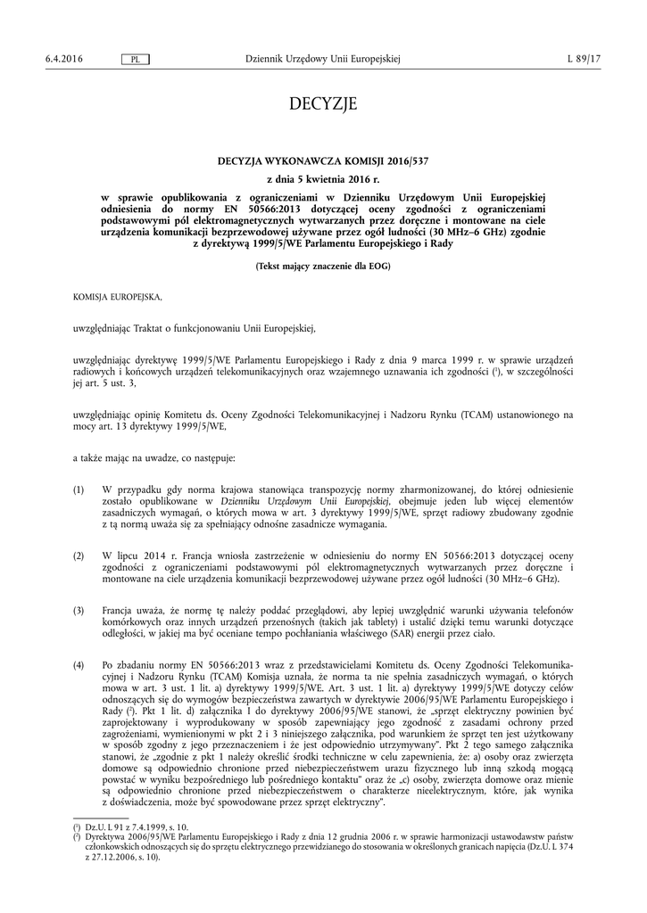 6.4.2016 Dziennik Urzędowy Unii Europejskiej PL L 89/17 DECYZJE DECYZJA WYKONAWCZA KOMISJI 2016/537 z dnia 5 kwietnia 2016 r. w sprawie opublikowania z ograniczeniami w Dzienniku Urzędowym Unii Europejskiej odniesienia do normy EN 50566:2013 dotyczącej oceny zgodności z ograniczeniami podstawowymi pól elektromagnetycznych wytwarzanych przez doręczne i montowane na ciele urządzenia komunikacji bezprzewodowej używane przez ogół ludności (30 MHz–6 GHz) zgodnie z dyrektywą 1999/5/WE Parlamentu Europejskiego i Rady (Tekst mający znaczenie dla EOG) KOMISJA EUROPEJSKA, uwzględniając Traktat o funkcjonowaniu Unii Europejskiej, uwzględniając dyrektywę 1999/5/WE Parlamentu Europejskiego i Rady z dnia 9 marca 1999 r. w sprawie urządzeń radiowych i końcowych urządzeń telekomunikacyjnych oraz wzajemnego uznawania ich zgodności (1), w szczególności jej art. 5 ust. 3, uwzględniając opinię Komitetu ds. Oceny Zgodności Telekomunikacyjnej i Nadzoru Rynku (TCAM) ustanowionego na mocy art. 13 dyrektywy 1999/5/WE, a także mając na uwadze, co następuje: (1) W przypadku gdy norma krajowa stanowiąca transpozycję normy zharmonizowanej, do której odniesienie zostało opublikowane w Dzienniku Urzędowym Unii Europejskiej, obejmuje jeden lub więcej elementów zasadniczych wymagań, o których mowa w art. 3 dyrektywy 1999/5/WE, sprzęt radiowy zbudowany zgodnie z tą normą uważa się za spełniający odnośne zasadnicze wymagania. (2) W lipcu 2014 r. Francja wniosła zastrzeżenie w odniesieniu do normy EN 50566:2013 dotyczącej oceny zgodności z ograniczeniami podstawowymi pól elektromagnetycznych wytwarzanych przez doręczne i montowane na ciele urządzenia komunikacji bezprzewodowej używane przez ogół ludności (30 MHz–6 GHz). (3) Francja uważa, że normę tę należy poddać przeglądowi, aby lepiej uwzględnić warunki używania telefonów komórkowych oraz innych urządzeń przenośnych (takich jak tablety) i ustalić dzięki temu warunki dotyczące odległości, w jakiej ma być oceniane tempo pochłaniania właściwego (SAR) energii przez ciało. (4) Po zbadaniu normy EN 50566:2013 wraz z przedstawicielami Komitetu ds. Oceny Zgodności Telekomunika cyjnej i Nadzoru Rynku (TCAM) Komisja uznała, że norma ta nie spełnia zasadniczych wymagań, o których mowa w art. 3 ust. 1 lit. a) dyrektywy 1999/5/WE. Art. 3 ust. 1 lit. a) dyrektywy 1999/5/WE dotyczy celów odnoszących się do wymogów bezpieczeństwa zawartych w dyrektywie 2006/95/WE Parlamentu Europejskiego i Rady (2). Pkt 1 lit. d) załącznika I do dyrektywy 2006/95/WE stanowi, że „sprzęt elektryczny powinien być zaprojektowany i wyprodukowany w sposób zapewniający jego zgodność z zasadami ochrony przed zagrożeniami, wymienionymi w pkt 2 i 3 niniejszego załącznika, pod warunkiem że sprzęt ten jest użytkowany w sposób zgodny z jego przeznaczeniem i że jest odpowiednio utrzymywany”. Pkt 2 tego samego załącznika stanowi, że „zgodnie z pkt 1 należy określić środki techniczne w celu zapewnienia, że: a) osoby oraz zwierzęta domowe są odpowiednio chronione przed niebezpieczeństwem urazu fizycznego lub inną szkodą mogącą powstać w wyniku bezpośredniego lub pośredniego kontaktu” oraz że „c) osoby, zwierzęta domowe oraz mienie są odpowiednio chronione przed niebezpieczeństwem o charakterze nieelektrycznym, które, jak wynika z doświadczenia, może być spowodowane przez sprzęt elektryczny”. (1) Dz.U. L 91 z 7.4.1999, s. 10. (2) Dyrektywa 2006/95/WE Parlamentu Europejskiego i Rady z dnia 12 grudnia 2006 r. w sprawie harmonizacji ustawodawstw państw członkowskich odnoszących się do sprzętu elektrycznego przewidzianego do stosowania w określonych granicach napięcia (Dz.U. L 374 z 27.12.2006, s. 10). L 89/18 (5) PL Dziennik Urzędowy Unii Europejskiej 6.4.2016 Biorąc pod uwagę wyżej wymienione aspekty bezpieczeństwa w normie EN 50566:2013, które wymagają poprawy, i w oczekiwaniu na odpowiednie zmiany tej normy, publikacji w Dzienniku Urzędowym Unii Europejskiej odniesienia do normy EN 50566:2013 powinno towarzyszyć stosowne ostrzeżenie, PRZYJMUJE NINIEJSZĄ DECYZJĘ: Artykuł 1 Odniesienie do normy EN 50566:2013 dotyczącej oceny zgodności z ograniczeniami podstawowymi pól elektromagne tycznych wytwarzanych przez doręczne i montowane na ciele urządzenia komunikacji bezprzewodowej używane przez ogół ludności (30 MHz–6 GHz) publikuje się w Dzienniku Urzędowym Unii Europejskiej z ograniczeniami określonymi w załączniku. Artykuł 2 Niniejsza decyzja wchodzi w życie dwudziestego dnia po jej opublikowaniu w Dzienniku Urzędowym Unii Europejskiej. Sporządzono w Brukseli dnia 5 kwietnia 2016 r. W imieniu Komisji Jean-Claude JUNCKER Przewodniczący 6.4.2016 PL Dziennik Urzędowy Unii Europejskiej L 89/19 ZAŁĄCZNIK Publikacja odniesień do europejskich norm zharmonizowanych na podstawie dyrektywy 1999/5/WE EON (1) CENELEC Odniesienie do normy i jej tytuł (oraz dokument referencyjny) EN 50566:2013 Norma wyrobu dotycząca oceny zgodności z ograniczeniami podstawowymi pól elek tromagnetycznych wytwarzanych przez do ręczne i montowane na ciele urządzenia ko munikacji bezprzewodowej używane przez ogół ludności (30 MHz–6 GHz) Pierwsza publi kacja w Dz.U. 12.10.2013 Odniesienie do normy zastą pionej Data ustania domniema nia zgodności normy za stąpionej Przypis 1 Artykuł dyrek tywy 1999/5/WE Art. 3 ust. 1 lit. a) Ostrzeżenie: Korzystając z niniejszej publikacji, należy przestrzegać określonych warunków odnoszących się do odstępu oddzielają cego urządzenie od ciała, odzwierciedlających praktyczny sposób codziennego używania i zapewniających bezpieczne korzystanie z doręcznych i montowanych na ciele urządzeń komunikacji bezprzewodowej używanych przez ogół ludności (30 MHz–6 GHz), na potrzeby realizacji celów w zakresie bezpieczeństwa, o których mowa w art. 3 ust. 1 lit. a) dyrektywy 1999/5/WE w związku z zał