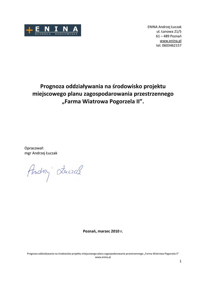 ENINA Andrzej Łuczak ul. Łanowa 21/5 61 – 489 Poznań www.enina.pl tel. 0603462157 Prognoza oddziaływania na środowisko projektu miejscowego planu zagospodarowania przestrzennego „Farma Wiatrowa Pogorzela II”. Opracował: mgr Andrzej Łuczak Poznań, marzec 2010 r. Prognoza oddziaływania na środowisko projektu miejscowego planu zagospodarowania przestrzennego „Farma Wiatrowa Pogorzela II” www.enina.pl 1 SPIS TREŚCI 1 ZAWARTOŚĆ, GŁÓWNE CELE PROJEKTOWANEGO DOKUMENTU ORAZ JEGO POWIĄZANIA Z INNYMI DOKUMENTAMI 1.1 Cele opracowania projektu planu 1.2 Ogólna charakterystyka ustaleń zawartych w projekcie Planu 1.3 Powiązania ustaleń projektu planu z innymi dokumentami 1.4 Zmiany stanu środowiska w przypadku braku projektowanego planu zagospodarowania przestrzennego 2 METODY ZASTOSOWANE PRZY SPORZĄDZANIU PROGNOZY 3 ANALIZA ISTNIEJĄCEGO STANU ORAZ JAKOŚCI ŚRODOWISKA 3.1 Położenie, rzeźba terenu 3.2 Warunki hydrogeologiczne 3.3 Warunki klimatyczne 3.4 Rośliny 3.5 Zwierzęta 3.6 Obszar Natura 2000 3.6.1 Obszar Natura 2000 – Dąbrowy Krotoszyńskie PLH300002 3.6.2 Obszar Natura 2000 – Dąbrowy Krotoszyńskie PLB300007 3.7 Jakość powietrza 4 CELE OCHRONY ŚRODOWISKA USTANOWIONE NA SZCZEBLU MIĘDZYNARODOWYM, WSPÓLNOTOWYM I KRAJOWYM ISTOTNE Z PUNKTU WIDZENIA PROJEKTU PLANU 4.1 II Polityka Ekologiczna Państwa 4.2 Narodowy Plan Rozwoju 4.3 Dyrektywa 2001/77/EC z dnia 27 września 2001 r. w sprawie promocji energii elektrycznej produkowanej ze źródeł odnawialnych na wewnętrznym rynku energii 5 ISTNIEJĄCE PROBLEMY OCHRONY ŚRODOWISKA ISTOTNE Z PUNKTU WIDZENIA REALIZACJI PROJEKTU PLANU ZAGOSPODAROWANIA PRZESTRZENNEGO 5.1 Analiza potencjalnych problemów ochrony środowiska, w szczególności z punktu widzenia obszarów podlegających ochronie na podstawie ustawy o ochronie przyrody (tekst jedn. Dz. U. 2009 nr 151 poz. 1220) 5.1.1 Obszar Natura 2000 5.1.2 Obszary Chronionego Krajobrazu 5.2 Pozostałe problemy, które mogą wystąpić przy realizacji Planu 6 PRZEWIDYWANE ODDZIAŁYWANIA USTALEŃ PROJEKTU PLANU NA ŚRODOWISKO 6.1 Wpływ na zwierzęta 6.2 Wprowadzanie gazów lub pyłów do powietrza 6.3 Wytwarzanie odpadów 6.4 Wykorzystywanie zasobów środowiska Prognoza oddziaływania na środowisko projektu miejscowego planu zagospodarowania przestrzennego „Farma Wiatrowa Pogorzela II” www.enina.pl 2 5 5 5 9 9 9 10 10 11 11 14 14 17 17 18 19 19 19 20 21 21 21 21 22 22 23 23 23 23 23 6.5 Przekształcenie krajobrazu i walorów widokowych 6.6 Emitowanie hałasu i promieniowania elektromagnetycznego 7 ROZWIĄZANIA MAJĄCE NA CELU ZAPOBIEGANIE, OGRANICZANIE LUB KOMPENSACJĘ PRZYRODNICZĄ NEGATYWNYCH ODDZIAŁYWAŃ NA ŚRODOWISKO REALIZACJI PROJEKTU PLANU 7.1 Integralność obszaru Natura 2000 7.2 Wpływ na różnorodność biologiczną, zwierzęta i rośliny 7.3 Człowiek 7.4 Wody 7.5 Powietrze 7.6 Powierzchnia ziemi, krajobraz, zabytki 7.7 Klimat 7.8 Zasoby naturalne 7.9 Dobra materialne 8 ROZWIĄZANIA ALTERNATYWNE DO ROZWIĄZAŃ W PROJEKCIE PLANU ORAZ IDENTYFIKACJA LUK WE WSPÓŁCZESNEJ WIEDZY 9 PROPOZYCJE DOTYCZĄCE PRZEWIDYWANYCH METOD ANALIZY SKUTKÓW REALIZACJI POSTANOWIEŃ PROJEKTU PLANU ORAZ CZĘSTOTLIWOŚĆ JEJ PRZEPROWADZANIA 10 INFORMACJE O MOŻLIWYM TRANSGRANICZNYM ODDZIAŁYWANIU NA ŚRODOWISKO 11 STRESZCZENIE SPORZĄDZONE W JĘZYKU NIESPECJALISTYCZNYM 12 MATERIAŁY ŹRÓDŁOWE 13 ZAŁĄCZNIKI Prognoza oddziaływania na środowisko projektu miejscowego planu zagospodarowania przestrzennego „Farma Wiatrowa Pogorzela II” www.enina.pl 3 23 28 31 31 31 32 32 32 32 33 33 33 33 33 33 34 36 36 Spis tabel Tabela 1. Gatunki ptaków dominujących (powyżej 5% zgrupowania) stwierdzone na badanych powierzchniach [14] w okresie lęgowym i polęgowym........................................... 14 Tabela 2. Liczebność oraz status ochronny ptaków stwierdzonych w okolicy miejscowości Pogorzela [14]. ......................................................................................................................... 14 Tabela 3. Gatunki ptaków występujące na terenie obszaru Natura 2000 – Dąbrowy Krotoszyńskie (PLB300007) wymienione w Załączniku I Dyrektywy Rady 79/409/EWG. ....... 18 Tabela 4. Przewidywane oddziaływania ustaleń projektu Planu ............................................. 31 Spis rycin Rycina 1. Średnia miesięczna częstotliwość wiatru według kierunków (%) [11]..................... 12 Rycina 2. Zasoby energetyczne wiatru w Polsce...................................................................... 13 Rycina 3. Oddziaływanie na klimat akustyczny projektowanych farm wiatrowych sąsiadujących z planowanymi elektrowniami wiatrowymi zlokalizowanymi na obszarze Planu (poziom dźwięku A).................................................................................................................. 22 Rycina 4. Mapa przedstawiająca planowane lokalizacje elektrowni wiatrowych na tle cennych obiektów w miejscowości Pogorzela. ...................................................................................... 24 Rycina 5. Mapa przedstawiająca planowane lokalizacje elektrowni wiatrowych na tle cennych obiektów w miejscowości Gumienice. ..................................................................................... 25 Rycina 6. Mapa przedstawiająca planowane lokalizacje elektrowni wiatrowych na tle cennych obiektów w miejscowości Kromolice. ...................................................................................... 26 Rycina 7. Mapa przedstawiająca planowane lokalizacje elektrowni wiatrowych na tle cennych obiektów w miejscowości Ochla. ............................................................................................. 27 Rycina 8. Mapa hałasu przemysłowego od farmy wiatrowej w pobliżu miejscowości Głuchów i Gumienice (poziom dźwięku A).............................................................................................. 29 Rycina 9. Mapa hałasu przemysłowego od farmy wiatro