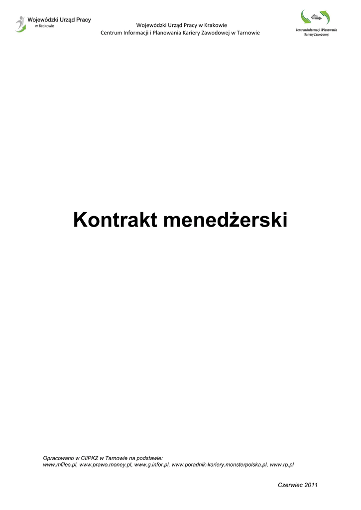 Wojewódzki Urząd Pracy w Krakowie Centrum Informacji i Planowania Kariery Zawodowej w Tarnowie Kontrakt menedżerski Opracowano w CIiPKZ w Tarnowie na podstawie: www.mfiles.pl, www.prawo.money.pl, www.g.infor.pl, www.poradnik-kariery.monsterpolska.pl, www.rp.pl Czerwiec 2011 Wojewódzki Urząd Pracy w Krakowie Centrum Informacji i Planowania Kariery Zawodowej w Tarnowie Spis treści 1. Wstęp 2 2. Co to jest kontrakt menedżerski 2 3. Wady i zalety kontraktu menedżerskiego 4 4. Polecana literatura 9 Opracowano w CIiPKZ w Tarnowie na podstawie: www.mfiles.pl, www.prawo.money.pl, www.g.infor.pl, www.poradnik-kariery.monsterpolska.pl, www.rp.pl Czerwiec 2011 Wojewódzki Urząd Pracy w Krakowie Centrum Informacji i Planowania Kariery Zawodowej w Tarnowie Wstęp Coraz bardziej popularną formą zatrudnienia na stanowiskach kierowniczych w dużych przedsiębiorstwach staje się zatrudnienie w ramach kontraktu menadżerskiego. To rozwiązanie powstało w Stanach Zjednoczonych, jako lek na niską efektywność i motywację kadry zarządzającej. Zastosowanie kontaktów menadżerskich zwiększyło swobodę szefów w zarządzaniu przedsiębiorstwem i czyniło ich odpowiedzialnymi za osiągane wyniki oraz zyski firmy, co przekładało się z kolei na odpowiednio wysokie ich wynagrodzenie. Pierwsze kontakty menedżerskie w Polsce pojawiły się już na początku lat dziewięćdziesiątych – pierwszymi szefami zatrudnionymi w takiej formie byli prezesi dużych prywatyzowanych wtedy przedsiębiorstw państwowych. Kontrakt menedżerskim jest typem umowy nienazwanej, niesprecyzowanej przez przepisy prawa, czyli umowy o których przepisy Kodeksu Cywilnego wprost nie stanowią. Kontrakty mogą być zawierane z menedżerami mającymi różny status prawny. Menedżerem może być zarówno osoba fizyczna, jak i przedsiębiorca prowadzący własną działalność gospodarczą. 1.Co to jest kontrakt menedżerski? Kontrakt menedżerski to rodzaj umowy cywilnoprawnej na mocy, której przyjmujący zlecenie zobowiązuje się za wynagrodzeniem do stałego wykonywania czynności zarządu przedsiębiorstwem zleceniodawcy (przedsiębiorcy) w jego imieniu i na jego rzecz. W literaturze kontrakty menedżerskie nazywane są również: umową o zarządzanie, umową o sprawowanie zarządu, umową zarządu, umową o wykonywanie zarządu, umową menedżerską lub umową o świadczenie usług menedżerskich. Do najczęściej zawieranych kontraktów należą: - kontrakt menedżerski – oparty na zasadzie umowy zlecenia - kontrakt menedżerski – zawarty na podstawie umowy o pracę - kontrakt menedżerski w formie umowy o świadczenie usług w ramach wykonywania wolnego zawodu. Kontrakt może być zawarty z uprawnionym organem lub przedstawicielem podmiotu zarządzanego, której przedmiotem jest świadczenie przez menedżera usługi zarządzania. Jest to umowa starannego działania – menedżer nie zobowiązuje się, że na pewno uzyska pożądany efekt np. w postaci zmniejszenia kosztów utrzymania czy zwiększenia przychodów firmy. Jego zobowiązanie podlega przede wszystkim na podjęciu działań, które wg obiektywnej oceny mogą doprowadzić do takiego efektu. Opracowano w CIiPKZ w Tarnowie na podstawie: www.mfiles.pl, www.prawo.money.pl, www.g.infor.pl, www.poradnik-kariery.monsterpolska.pl, www.rp.pl Czerwiec 2011 Wojewódzki Urząd Pracy w Krakowie Centrum Informacji i Planowania Kariery Zawodowej w Tarnowie Menadżer może zarządzać całą firmą lub jej częścią, np. odziałem lub określonym obszarem działalności np. logistyką, sprzedażą, marketingiem. Zakres swobody decyzyjnej menedżera jest większy niż pracownika zarządzanej spółki. Kontrakt w różny sposób określa granice działań, które menadżer może przeprowadzać samodzielnie bez uzyskiwania zgody np. rady nadzorczej lub zgromadzenia wspólników spółki zarządzanej. Konieczna jest zgoda w/w na sprzedaż lub obciążenie cennych nieruchomości, powstanie zobowiązań o określonej wartości, przejęcie innych firm lub emisję nowych akcji. Menadżer w kontrakcie może zobowiązać się nie tylko do świadczenia usługi zarządzania firmą. Właściciele zarządzanej spółki oczekiwać mogą także od niego wdrożenia nowych metod zarządzania, procedur i traktowania tego, jako swego rodzaju rodzaj know-how. Cennym aktywem wnoszonym przez menedżera do firmy jest również grupa jego klientów i kontaktów. Wśród kontraktów menedżerskich można wyróżnić: kontrakty menadżerskie w przedsiębiorstwach państwowych – są one nastawione na poprawę kondycji przedsiębiorstwa kontrakty menadżerskie w jednoosobowych spółkach Skarbu Państwa- ich celem jest opracowanie programu restrukturyzacji, przygotowania i przeprowadzenia prywatyzacji umowy o zarządzanie majątkiem Narodowych Funduszy Inwestycyjnych kontrakty menedżerskie w przedsiębiorstwach prywatnych – głównym zadaniem jest sprawne prowadzenie przedsiębiorstwa zgodnie z zasadami kupieckimi. 2. Wady i zalety kontraktu menadżerskiego Do zalet kontraktu menadżerskiego należy: duża swoboda w tworzeniu kontraktu, który jest umową pomiędzy dwoma równymi partnerami i może zostać zawarta na zasadzie umowy o pracę lub umowy prawa cywilnego możliwość negocjacji obowiązków i przywilejów przez menedżera wysokość pensji na którą składa tzw. część stała i zmienna uzależniona od osiąganych wyników tzw.„złoty parasol” – zamian za obietnicę wierności firmie menedżer może dostać odprawę do wysokości 36 krotności swojej pensji. Do wad kontraktu menadżerskiego należy zakaz konkurencji polegający na tym, że w trakcie trwania umowy i po jej rozwiązaniu menedżer zobowiązuje się przez określony czas (najczęściej 3 lata) nie pracować dla firm konkurencyjnych w stosunku do firmy Opracowano w CIiPKZ w Tarnowie na podstawie: www.mfiles.pl, www.prawo.money.pl, www.g.infor.pl, www.poradnik-kariery.monsterpolska.pl, www.rp.pl Czerwi