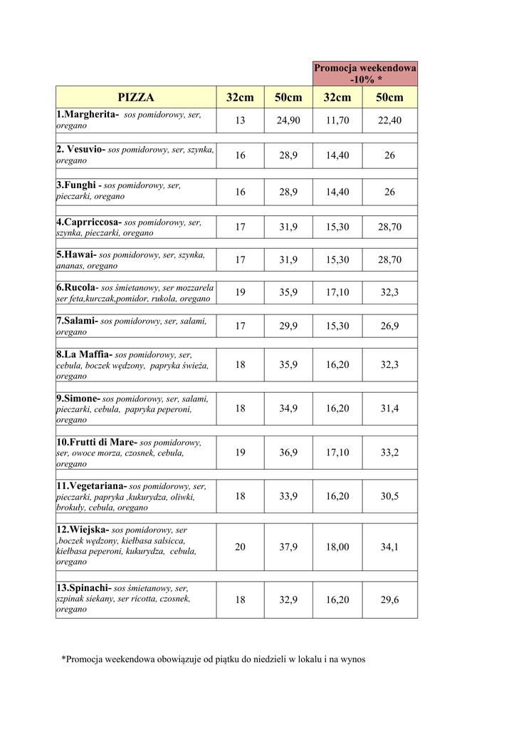 Promocja weekendowa -10% * PIZZA 1.Margherita- sos pomidorowy, ser, oregano 2. Vesuvio- sos pomidorowy, ser, szynka, oregano 3.Funghi - sos pomidorowy, ser, pieczarki, oregano 4.Caprriccosa- sos pomidorowy, ser, szynka, pieczarki, oregano 5.Hawai- sos pomidorowy, ser, szynka, ananas, oregano 6.Rucola- sos śmietanowy, ser mozzarela ser feta,kurczak,pomidor, rukola, oregano 7.Salami- sos pomidorowy, ser, salami, oregano 32cm 50cm 32cm 50cm 13 24,90 11,70 22,40 16 28,9 14,40 26 16 28,9 14,40 26 17 31,9 15,30 28,70 17 31,9 15,30 28,70 19 35,9 17,10 32,3 17 29,9 15,30 26,9 18 35,9 16,20 32,3 18 34,9 16,20 31,4 19 36,9 17,10 33,2 18 33,9 16,20 30,5 20 37,9 18,00 34,1 18 32,9 16,20 29,6 8.La Maffia- sos pomidorowy, ser, cebula, boczek wędzony, papryka świeża, oregano 9.Simone- sos pomidorowy, ser, salami, pieczarki, cebula, papryka peperoni, oregano 10.Frutti di Mare- sos pomidorowy, ser, owoce morza, czosnek, cebula, oregano 11.Vegetariana- sos pomidorowy, ser, pieczarki, papryka ,kukurydza, oliwki, brokuły, cebula, oregano 12.Wiejska- sos pomidorowy, ser ,boczek wędzony, kiełbasa salsicca, kiełbasa peperoni, kukurydza, cebula, oregano 13.Spinachi- sos śmietanowy, ser, szpinak siekany, ser ricotta, czosnek, oregano *Promocja weekendowa obowiązuje od piątku do niedzieli w lokalu i na wynos Promocja weekendowa -10%* PIZZA 32cm 50cm 32cm 50cm 19 36,9 17,1 33,2 18 - 16,2 18 33,9 16,2 30,5 18 33,9 16,2 30,5 19 35,9 17,1 32,3 18 32,9 16,2 29,6 19 35,9 17,1 32,3 18 33,9 16,2 30,5 18 35,9 16,2 32,3 18 33,9 16,2 30,5 19 36,9 17,1 33,2 18 35,9 16,2 32,3 14.Quattro Stagioni - sos pomidorowy, ser, szynka, oliwki, pieczarki, owoce morza , oregano 15.Calzone (pieróg)- sos pomidorowy, ser mozzarella, szynka cebula, czarny pieprz, oregano - 16.Serowa Uczta – sos śmietanowy, ser mozzarella, ser feta, ser gorgonzola, ser ricotta, oregano 17.Indiana- sos pomidorowy, ser, kurczak, kukurydza, pieprz czarny, tabasco, oregano - ostra 18.Costa Nostra- sos pomidorowy, ser, szynka, bekon, pieczarki, ogórek konserwowy,cebula, oregano 19.Tonno- sos pomidorowy, ser, tuńczyk, pomidor, oregano 20. Kurki z Qrką- sos śmietanowy, ser, kurki, kurczak, cebula, oregano 21.Macaroni- sos śmietanowy, ser, makaron spaghetti, kurczak, brokuły, oregano 22.Siciliana- sos pomidorowy, ser, anchois, czarne oliwki, kapary, czosnek, pieprz, oregano 23.Brocoli- sos pomidorowy, salami, brokuły, ser, oregano 24. Favorita – sos pomidorowy, bekon, papryka, cebula, jajko, ser, oregano 25.Speciale- sos pomidorowy, ser, kiełbasa peperoni, papryka peperoni, tabasco, oregano- ostra *Promocja weekendowa obowiązuje od piątku do niedzieli w lokalu i na wynos PIZZA 32cm Promocja weekendowa -10% * 50cm 32cm 50cm 26.Calabrese- sos pomidorowy, ser, szynka, pieczarki, kiełbasa peperoni, oliwki, cebula, oregano 19 36,9 17,1 33,2 19 36,9 17,1 33,2 19 36,9 17,1 33,2 20 37,9 18 34,1 18 35,9 16,2 31. Kompozycja Wlasna- sos 13 24,9 11,7 22,4 pomidorowy, ser, oregano??? każdy dodatek 3 5 3 5 27.Dracula- sos śmietanowo-czosnkowy, ser mozzarella, kurczak, pieczarki, cebula, bazylia 28.Kebab Pizza- sos pomidorowy, ser mozzarella, kebab, pieczarki, papryka peperoni, pomidor, oregano 29.Dobra Uczta- sos pomidorowy, ser mozzarella, szynka, bekon, kebab, kiełbasa salami , oregano, bazylia 30.Orientalna- sos pomidorowy, ser, pieczarki, ananas, kurczak, curry , 33,2 1. Pieczywko czosnkowe (3 szt) 4,00zl 2. Pieczywko czosnkowe z serem (3 szt) 4,50zl 3. Pieczywko czosnkowe z serem i kiełbasą peperoni (3 szt) 5,00zl 4. Paluchy z pieca z sosem czosnkowym 7,00zl 5. Sos czosnkowy, sos koktailowy (własnoręcznie robione) 3,00zl 6. Ketchup lub sos pomidorowy 2,00 zł PROMOCJE** ! PONIEDZIAŁEK: Do dwóch gigantów średnia pizza gratis! WTOREK: Drugi gigant za 50% ceny! ŚRODA: Na każdą pizzę jeden dodatek gratis! *Promocja weekendowa obowiązuje od piątku do niedzieli tylko w lokalu i na wynos ** Promocje obowiązują tylko w lokalu i na wynos