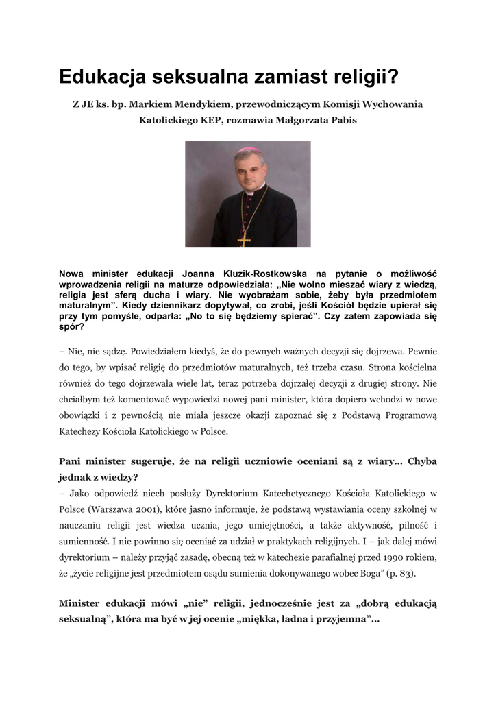 Edukacja seksualna zamiast religii? Z JE ks. bp. Markiem Mendykiem, przewodniczącym Komisji Wychowania Katolickiego KEP, rozmawia Małgorzata Pabis Nowa minister edukacji Joanna Kluzik-Rostkowska na pytanie o możliwość wprowadzenia religii na maturze odpowiedziała: „Nie wolno mieszać wiary z wiedzą, religia jest sferą ducha i wiary. Nie wyobrażam sobie, żeby była przedmiotem maturalnym”. Kiedy dziennikarz dopytywał, co zrobi, jeśli Kościół będzie upierał się przy tym pomyśle, odparła: „No to się będziemy spierać”. Czy zatem zapowiada się spór? – Nie, nie sądzę. Powiedziałem kiedyś, że do pewnych ważnych decyzji się dojrzewa. Pewnie do tego, by wpisać religię do przedmiotów maturalnych, też trzeba czasu. Strona kościelna również do tego dojrzewała wiele lat, teraz potrzeba dojrzałej decyzji z drugiej strony. Nie chciałbym też komentować wypowiedzi nowej pani minister, która dopiero wchodzi w nowe obowiązki i z pewnością nie miała jeszcze okazji zapoznać się z Podstawą Programową Katechezy Kościoła Katolickiego w Polsce. Pani minister sugeruje, że na religii uczniowie oceniani są z wiary… Chyba jednak z wiedzy? – Jako odpowiedź niech posłuży Dyrektorium Katechetycznego Kościoła Katolickiego w Polsce (Warszawa 2001), które jasno informuje, że podstawą wystawiania oceny szkolnej w nauczaniu religii jest wiedza ucznia, jego umiejętności, a także aktywność, pilność i sumienność. I nie powinno się oceniać za udział w praktykach religijnych. I – jak dalej mówi dyrektorium – należy przyjąć zasadę, obecną też w katechezie parafialnej przed 1990 rokiem, że „życie religijne jest przedmiotem osądu sumienia dokonywanego wobec Boga” (p. 83). Minister edukacji mówi „nie” religii, jednocześnie jest za „dobrą edukacją seksualną”, która ma być w jej ocenie „miękka, ładna i przyjemna”… – Nie wiem, chociaż może powinienem się domyślić, jaki model edukacji seksualnej pani minister ma na myśli. Kościół nie sprzeciwia się edukacji seksualnej. Zawsze ją prowadził. Potrzebna jest mądra edukacja, by dobrze obchodzić się z darem seksualności. To wielka siła i trzeba wiedzieć, jak ją wykorzystać, by służyła miłości i odpowiedzialności. Nieroztropne wprowadzanie dzieci w świat ludzi dorosłych zawsze przynosi negatywne skutki i ostatecznie staje się krzywdą wyrządzoną człowiekowi. Zawsze odbije się to na rodzinie. Dlatego upominając się o właściwy kształt wychowania, upominamy się jednocześnie o rodzinę. I o to apelujemy zwłaszcza do rodziców, by mieli czujność, czego próbuje się uczyć ich dzieci, kto to robi i jakie ma kompetencje. Czy planuje Ksiądz Biskup jakieś spotkanie, w czasie którego zostałyby poruszone te niepokojące społeczeństwo katolickie zapowiedzi? – Pewnie teraz, po tych zmianach, będziemy musieli trochę poczekać, ale jesteśmy gotowi do rozmów. Ufam, że w niedługim czasie pojawi się taka możliwość. W Polsce trwa ogromny atak na Kościół, pomawiani są księża, biskupi, a za sprawą Twojego Ruchu MEN szuka w szkołach katechetów pedofilów. Jak w takiej sytuacji odebrał Ksiądz Biskup apel ks. Marcina Węcławskiego do kapłanów? – Bardzo się ucieszyłem tą inicjatywą. Nawet wpisałem sobie do mojego kalendarza, by pamiętać i solidarnie z innymi kapłanami łączyć się we wspólnej modlitwie. Pytają też osoby świeckie o możliwość włączenia się w ten modlitewny apel. Modlitwa jednego człowieka potrafi czynić cuda, a cóż dopiero wspólna modlitwa nas wszystkich. Ona jest naszą mocą. Dziękuję za rozmowę. Nasz Dziennik