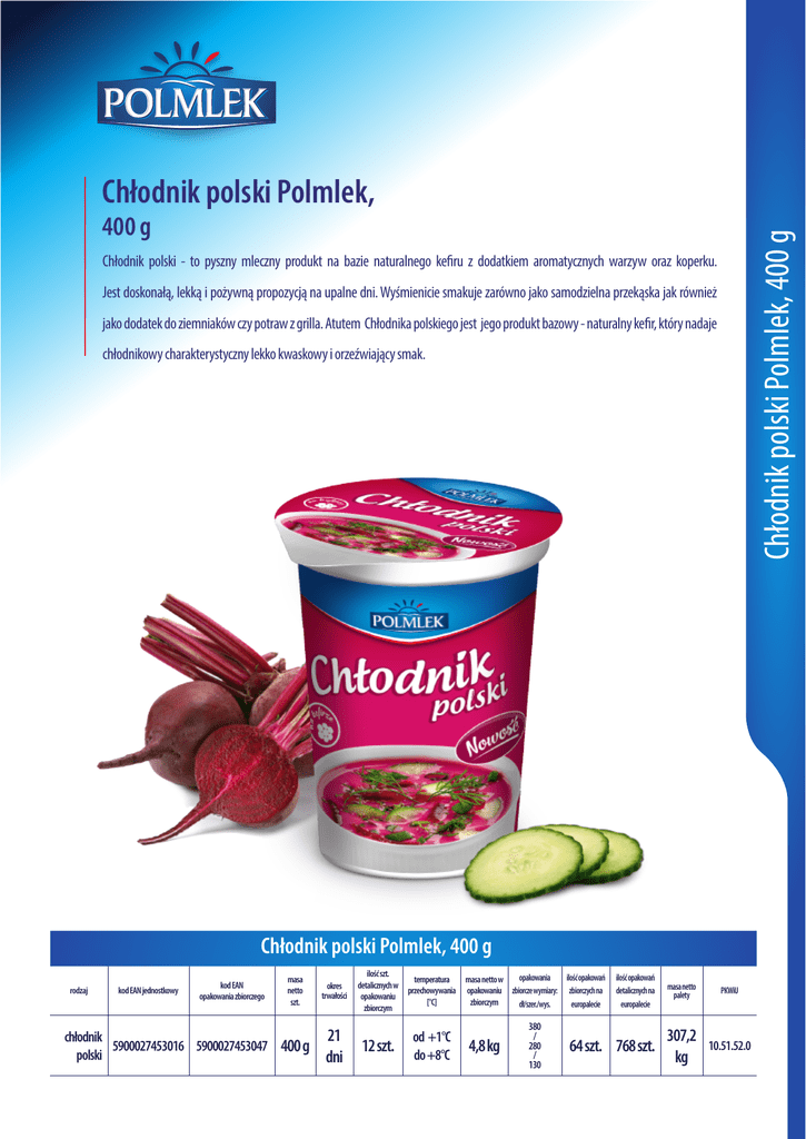 Chłodnik polski Polmlek, Chłodnik polski Polmlek, 400 g 400 g Chłodnik polski - to pyszny mleczny produkt na bazie naturalnego kefiru z dodatkiem aromatycznych warzyw oraz koperku. Jest doskonałą, lekką i pożywną propozycją na upalne dni. Wyśmienicie smakuje zarówno jako samodzielna przekąska jak również jako dodatek do ziemniaków czy potraw z grilla. Atutem Chłodnika polskiego jest jego produkt bazowy - naturalny kefir, który nadaje chłodnikowy charakterystyczny lekko kwaskowy i orzeźwiający smak. Chłodnik polski Polmlek, 400 g rodzaj kod EAN jednostkowy kod EAN opakowania zbiorczego masa netto szt. chłodnik 5900027453016 5900027453047 400 g polski okres trwałości 21 dni ilość szt. opakowania ilość opakowań temperatura masa netto w detalicznych w przechowywania opakowaniu zbiorcze wymiary: zbiorczych na opakowaniu [°C] zbiorczym dł/szer./wys. europalecie zbiorczym 12 szt. od +1°C do +8°C 4,8 kg 380 / 280 / 130 ilość opakowań detalicznych na europalecie masa netto palety PKWiU 64 szt. 768 szt. 307,2 kg 10.51.52.0