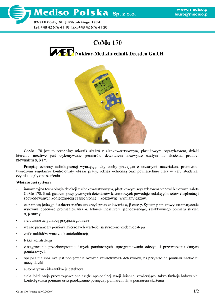 CoMo 170 Nuklear-Medizintechnik Dresden GmbH CoMo 170 jest to przenośny miernik skażeń z cienkowarstwowym, plastikowym scyntylatorem, dzięki któremu możliwe jest wykonywanie pomiarów detektorem niezwykle czułym na skażenia promieniowaniem α, β i γ. Przepisy ochrony radiologicznej wymagają, aby osoby pracujące z otwartymi materiałami promieniotwórczymi regularnie kontrolowały obszar pracy, odzież ochronną oraz powierzchnię ciała w celu zbadania, czy nie uległy one skażeniu. Właściwości systemu • innowacyjna technologia detekcji z cienkowarstwowym, plastikowym scyntylatorem stanowi kluczową zaletę CoMo 170. Brak gazowo-przepływowych detektorów ksenonowych powoduje redukcję kosztów eksploatacji spowodowanych koniecznością czasochłonnej i kosztownej wymiany gazów. • za pomocą jednego detektora można zmierzyć promieniowanie α, β oraz γ. System pomiarowy automatycznie wykrywa obecność promieniowania α. Istnieje możliwość jednoczesnego, selektywnego pomiaru skażeń α, β oraz γ. • sterowanie za pomocą przyjaznego menu • ważne parametry pomiaru mierzonych wartości są strzeżone kodem dostępu • zbiór nuklidów wraz z ich autokalibracją • lekka konstrukcja • zintegrowanie przechowywania danych pomiarowych, oprogramowania odczytu i przetwarzania danych pomiarowych • opcjonalnie możliwe jest podłączenie różnych zewnętrznych detektorów, na przykład do pomiaru wielkości mocy dawki • automatyczna identyfikacja detektora • stała lokalizacja pracy zapewniona dzięki opcjonalnej stacji ściennej zawierającej także funkcję ładowania, kontrolę czasu pomiaru oraz przełączanie pomiędzy pomiarem tła, a pomiarem skażenia CoMo170 (ważne od 09.2009r.) 1/2 Dane techniczne: Detektor: cienkowarstwowy, plastikowy scyntylator z powłoką ZnS Rozmiar detektora: 170 cm2 Tło: α: α/β: Odejmowanie tła: ustawiany czas pomiaru tła Elektronika pomiaru: elektronika wspomagana μ-kontrolerem Klawiatura: membranowa klawiatura, 5 przycisków funkcyjnych Alarm: oddzielnie ustawiany dla każdego nuklidu, alarm akustyczny około 0.1 cps około 15 – 25 cps Wyświetlanie wyników: cps, Bq, Bq/cm2 Nuklidy: 25, zaprogramowane faktory kalibracji, możliwość dodanie nuklidów przez użytkownika, zintegrowana autokalibracja Czas pomiaru: ciągły, przy pracy stacjonarnej ustawiany w sekundach Wyświetlacz: duży, graficzny wyświetlacz LCD 128 x 64 pixele, podświetlany, ustawianie czasu trwania iluminacji Zasilanie: dwie baterie AA lub odpowiednie akumulatorki (NICD, NIMH), dostępna ładowarka w postaci stacji ściennej z funkcją ładowania baterii Zakres temperatur: -10°c ÷ 40°c, bez kondensacji, w wersji specjalnej od -20°c Wymiary: 280 x 125 x 135 mm (dł (z rączką) x szer. x wys.) Waga: ok. 750 g (włączając baterie) Obudowa: nowoczesna, ergonomiczna obudowa Interface: RS 232, ładowanie, dodatkowe detektory 1 Stacjonarne użycie systemu CoMo w czynnym stanowisku na ścianie 2 CoMo połączone z detektorem do pomiaru wielkości mocy dawki 3 CoMo umieszczone w wózku CoMo170 (ważne od 09.2009r.) 2/2