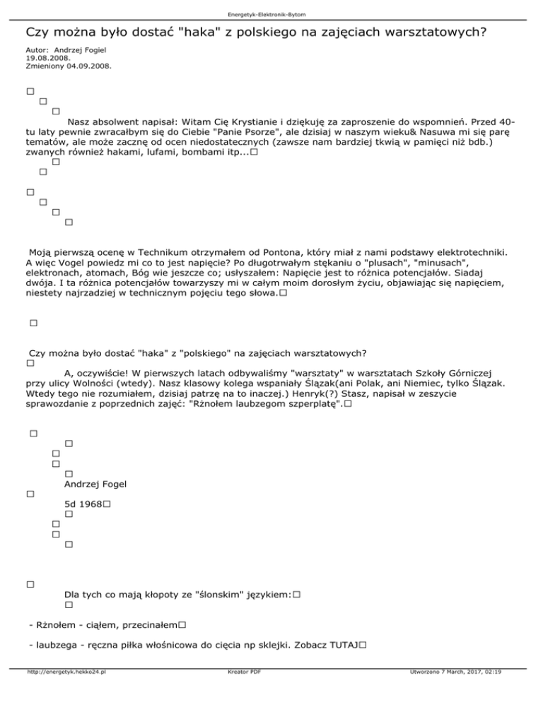Energetyk-Elektronik-Bytom Czy można było dostać "haka" z polskiego na zajęciach warsztatowych? Autor: Andrzej Fogiel 19.08.2008. Zmieniony 04.09.2008. Nasz absolwent napisał: Witam Cię Krystianie i dziękuję za zaproszenie do wspomnień. Przed 40tu laty pewnie zwracałbym się do Ciebie "Panie Psorze", ale dzisiaj w naszym wieku& Nasuwa mi się parę tematów, ale może zacznę od ocen niedostatecznych (zawsze nam bardziej tkwią w pamięci niż bdb.) zwanych również hakami, lufami, bombami itp... Moją pierwszą ocenę w Technikum otrzymałem od Pontona, który miał z nami podstawy elektrotechniki. A więc Vogel powiedz mi co to jest napięcie? Po długotrwałym stękaniu o "plusach", "minusach", elektronach, atomach, Bóg wie jeszcze co; usłyszałem: Napięcie jest to różnica potencjałów. Siadaj dwója. I ta różnica potencjałów towarzyszy mi w całym moim dorosłym życiu, objawiając się napięciem, niestety najrzadziej w technicznym pojęciu tego słowa. Czy można było dostać "haka" z "polskiego" na zajęciach warsztatowych? A, oczywiście! W pierwszych latach odbywaliśmy "warsztaty" w warsztatach Szkoły Górniczej przy ulicy Wolności (wtedy). Nasz klasowy kolega wspaniały Ślązak(ani Polak, ani Niemiec, tylko Ślązak. Wtedy tego nie rozumiałem, dzisiaj patrzę na to inaczej.) Henryk(?) Stasz, napisał w zeszycie sprawozdanie z poprzednich zajęć: "Rżnołem laubzegom szperplatę". Andrzej Fogel 5d 1968 Dla tych co mają kłopoty ze "ślonskim" językiem: - Rżnołem - ciąłem, przecinałem - laubzega - ręczna piłka włośnicowa do cięcia np sklejki. Zobacz TUTAJ http://energetyk.hekko24.pl Kreator PDF Utworzono 7 March, 2017, 02:19 Energetyk-Elektronik-Bytom - szperplata - sklejka drewniana Dziękujemy Andrzejowi za te ciekawie napisane wspomnienia! Napisz do nas o Twoich ciekawych wspomnieniach! Admin 04 września 2008 Andrzej Fogel napisał: Dziękuję za korespondencję. Może nie będziemy się przepraszać za terminy odpowiedzi, bo przecież prowadzenie takiej witryny wymaga poświęcenia dużo prywatnego czasu, a i ja nie zawsze mam nastrój i czas. Zamieszczenie moich "wypocin", przyznam, sprawiło mi przyjemność. Czując jednak potrzebę rozliczenia się z przeszłością, postanowiłem publicznie wyznać grzech: Zdając maturę w "energetyku" , zdecydowałem się w ostatniej chwili, w przeciwieństwie do kolegów, zdawać egzamin do Akademii Ekonomicznej w Katowicach. Między innymi dzięki naukom Profesor Mglej, zostałem ekonomistą. I tylko czasami, łezka w oku się zakręci; bo powiedzmy sobie, czy ktoś widział coś piękniejszego w przyrodzie od "szadzi katastrofalnej" (Rafalski)? Albo weźmy sobie taki "wykres kołowy transformatora"(Baron)?, szkic godny Leonardo da Vinci. A może tak "duodioda" (Ponton)?, jakże wspaniały pseudonim artystyczny jakiejś silikonowej gwiazdy mediów. I ja to wszystko zdradziłem na rzecz "elastyczności cenowej popytu", czy też "macierzy przepływów międzygałęziowych". Wybacz mi Panie, nie wiedziałem co czynię. Pozdrawiam Cię serdecznie Krystianie. Grzesznik Andrzej Fogel 5d 1968 Mieszkam w dzielnicy Tiergarten w Berlinie przy ulicy Thomasiusstr Jak będziesz, zadzwoń, może się spotkamy. http://energetyk.hekko24.pl Kreator PDF Utworzono 7 March, 2017, 02:19