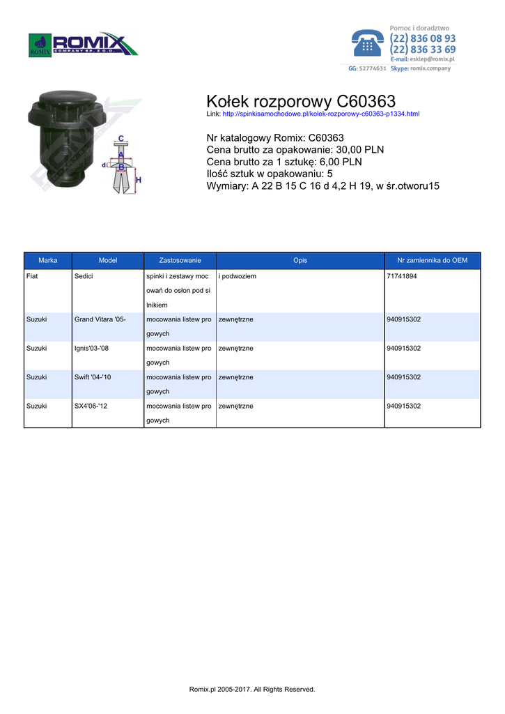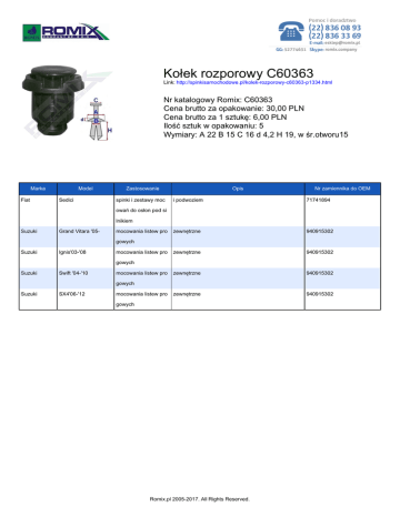 Kołek rozporowy C60363 Link: http://spinkisamochodowe.pl/kolek-rozporowy-c60363-p1334.html Nr katalogowy Romix: C60363 Cena brutto za opakowanie: 30,00 PLN Cena brutto za 1 sztukę: 6,00 PLN Ilość sztuk w opakowaniu: 5 Wymiary: A 22 B 15 C 16 d 4,2 H 19, w śr.otworu15 Marka Fiat Model Sedici Zastosowanie spinki i zestawy moc Opis Nr zamiennika do OEM i podwoziem 71741894 zewnętrzne 940915302 zewnętrzne 940915302 zewnętrzne 940915302 zewnętrzne 940915302 owań do osłon pod si lnikiem Suzuki Grand Vitara '05- mocowania listew pro gowych Suzuki Ignis'03-'08 mocowania listew pro gowych Suzuki Swift '04-'10 mocowania listew pro gowych Suzuki SX4'06-'12 mocowania listew pro gowych Romix.pl 2005-2017. All Rights Reserved.