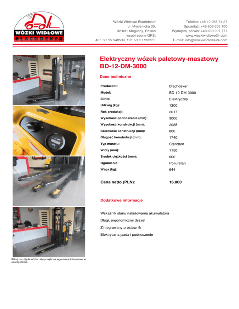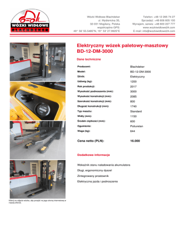 Wózki Widłowe Blachdeker ul. Myślenicka 35, 32-031 Mogilany, Polska współrzędne GPS: 49° 56' 55.5485"N, 19° 53' 27.9925"E Telefon: +48 12 265 74 27 Sprzedaż: +48 606 605 100 Wynajem, serwis: +48 600 227 777 www.wozkiwidlowe24.com E-mail: [email protected] Elektryczny wózek paletowy-masztowy BD-12-DM-3000 Dane techniczne Producent: Blachdeker Model: BD-12-DM-3000 Silnik: Elektryczny Udźwig (kg): 1200 Rok produkcji: 2017 Wysokość podnoszenia (mm): 3000 Wysokość konstrukcji (mm): 2085 Szerokość konstrukcji (mm): 800 Długość konstrukcji (mm): 1740 Typ masztu: Standard Widły (mm): 1150 Środek ciężkości (mm): 600 Ogumienie: Poliuretan Waga (kg): 644 Cena netto (PLN): Dodatkowe informacje Wskaźnik stanu naładowania akumulatora Długi, ergonomiczny dyszel Zintegrowany prostownik Elektryczna jazda i podnoszenie Kliknij na zdjęcie wózka, aby przejść na jego stronę internetową w naszej ofercie. 16.000
