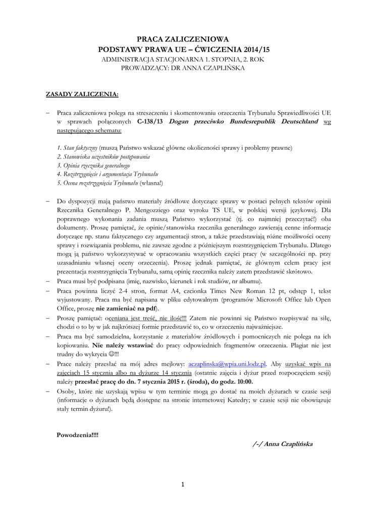 Praca zaliczeniowa - Podstawy prawa UE 2014-15