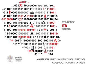 STRAŻACY ITR POCZTA MICHAŁ BONI MINISTER ADMINISTRACJI I CYFRYZACJI WARSZAWA, 1 PAŹDZIERNIKA 2012 R. O czym będziemy rozmawiać O pieniądzach na podwyżki dla strażaków i tych służb mundurowych, które jeszcze nie dostały podwyżek Od 8 września 2012 r. MAC zajmuje się przeciwdziałaniem i usuwaniem skutków klęsk żywiołowych, dysponuje więc rezerwą celową na ten cel O Międzynarodowych Regulacjach Telekomunikacyjnych ITR Dotyczą one nie tylko telekomunikacji, którą MAC się zajmuje, ale i wolności w Internecie. Właśnie zakończyły się społeczne i międzyresortowe konsultacje projektu zmian ITR O nowym Prawie Pocztowym Do zadań MAC należą obok telekomunikacji także sprawy poczty. Projekt nowelizacji Prawa Pocztowego przyjął w zeszłym tygodniu rząd 1.10.2012 2 Podwyżki 300 zł od 1.10 dla strażaków, straży granicznej i innych służb, które nie dostały jeszcze podwyżek Z rezerwy celowej na ten rok na przeciwdziałanie i usuwanie skutków klęsk żywiołowych zostało 76 160 000 zł 76 mln 160 tys. zł na podwyżki MAC wnosi o przekazanie jej na podwyżki dla tych służb mundurowych, które – w przeciwieństwie do żołnierzy i policjantów – nie dostały jeszcze podwyżek Państwowa Straż Pożarna – kwota 30 mln 226 tys. zł Straż Graniczna – kwota 16 mln 438 tys. zł Biuro Ochrony Rządu – kwota 2 mln 256 tys. zł Służba Więziennej – kwota 27 mln 240 tys. zł Dysponując tymi funduszami Minister Spraw Wewnętrznych, Minister Sprawiedliwości i wojewodowie podejmą decyzje w sprawie podwyżek 1.10.2012 3 Międzynarodowe Regulacje Telekomunikacyjne ITR Polskie konsultacje ITR Jak zmienić ITR? Konsultacje Decyzje • 193 kraje – członkowie ITU dyskutują o zmianie ITR • Byliśmy jednym z pierwszych krajów, który poddał założenia zmian w Międzynarodowych Regulacjach Telekomunikacyjnych szerokim publicznym konsultacjom. • ITU robi konsultacje na wzór Polski • Tydzień po Polsce, 9 sierpnia, swoje konsultacje rozpoczął ITU, Międzynarodowy Związek Komunikacyjny, który jest gospodarzem dyskusji o ITR. • Decyzje zapadną w grudniu w Dubaju • Z CZYM JEDZIEMY NA KONFERENCJĘ ITU? 1.10.2012 4 Międzynarodowe Regulacje Telekomunikacyjne ITR Jak zmienia się projekt polskiego stanowiska po konsultacjach? Większy nacisk na obronę demokratycznych wartości w Internecie • Rząd RP nie popiera wprowadzenia w ramach ITR zapisów umożliwiających niektórym państwom ograniczanie swobód, praw podstawowych i wolności. • Jesteśmy otwarci na dyskusję o zarządzaniu przez ITR nazwami domen, przydzielaniem numerów i adresów IP. Uzupełnienie stanowiska m.in. o: • poparcie dla dokładnej informacji o cenach usług; • sprzeciw, by ITR określały sposób, w jaki firmy telekomunikacyjne mają rozliczać wymianę ruchu internetowego (peering) i połączenia telefoniczne (zakańczanie), czy też wobec zobowiązania państw ITU do wprowadzenia u siebie przepisów dotyczących spamu 1.10.2012 5 Nowe prawo pocztowe Na czym polega liberalizacja? Korzyści dla obywateli Brak blaszek i notesów w listach Zniesienie monopolu Poczty Polskiej Lepsze i tańsze usługi pocztowe Konsument chroniony, jakość i terminowość usług gwarantowana 1.10.2012 6 Nowe prawo pocztowe Zmiany na rynku pocztowym i konkurencja między przedsiębiorstwami Rola Urzędu Komunikacji Elektronicznej w regulacji rynku - taka jak w przypadku rynku telekomunikacyjnego Zniesienie monopolu Poczty Polskiej Zmiany na rynku pocztowym i kurierskim - szansa dla gałęzi gospodarki rosnącej dzięki e-handlowi Skutki uwolnienia rynku dla Poczty Polskiej - Restrukturyzacja, unowocześnienie przedsiębiorstwa i usług - Likwidacja obszaru zastrzeżonego, czyli realnego monopolu poczty Państwo jako gwarant powszechnych usług pocztowych 1.10.2012 7 Ministerstwo Administracji i Cyfryzacji 1.10.2012 8