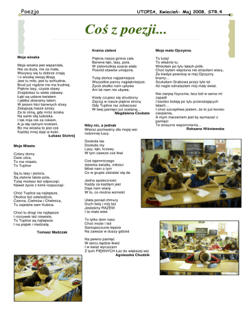 Poezja UTOPIA, Kwiecień- Maj 2008, STR.4 Coś z poezji... Moja wioska Moja wioska jest wspaniała, Nie za duża, nie za mała, Wszyscy się tu dobrze znają I o wioskę swoją dbają Jest tu miło, jest tu schludnie, Brud już nigdzie nie ma trudniej. Piękne lasy, czyste stawy Znajdziesz tu wiele zabawy. Łąki są usłane kwiatem I jabłka zbieramy latem. W jesieni liści barwnych stosy Zasypują nasze szosy. Za to zimą, gdy mróz ściska Na sanki idą ludziska. I tak mija rok za rokiem, A ja idę raźnym krokiem. Bo ma wioska to jest coś Każdej innej daje w kość. Łukasz Stohnij Moje Miasto Cztery domy Dwie ulice, To me miasto, To Tuplice Są tu lasy i jeziora, Są zielone także pola, Tutaj możesz też odpocząć, Nawet życie z kimś rozpocząć. Choć Tuplice są najlepsze, Okolice też odwiedźcie, Czerna, Cielmów i Chełmica, Tu zajedzie sam Kubica. Choć tu drogi nie najlepsze I rozrywek też niewiele, To Tuplice są najlepsze I na piątek i niedzielę. Tomasz Madczak Kraina zieleni Moja mała Ojczyzna. Piękna nasza gmina cała Barwne łąki, lasy, pola. W zieloniutkiej szacie stała Pośród stawów umajona. To tutaj! To właśnie tu. Wróciłam po tylu latach prób. Choć byłam więziona nie straciłam wiary, Że kiedyś powrócę w mej Ojczyzny bramy… Szukałam Grabowa przez tyle lat Aż nagle odnalazłam mój mały świat. Tutaj słońce najjaśniejsze Wszystkie panny najpiękniejsze. Życie słodko nam upływa Ani lat nam nie ubywa. Kiedy czujesz się strudzony Zajrzyj w nasze piękne strony Gdy Tuplice raz zobaczysz W twej pamięci już zostaną… Magdalena Czubata Niby nic, a jednak Wiersz pochwalny dla mojej wsi rodzinnej Łazy. Dookoła las Dookoła my Lasy, łąki, krzewy W tym zawsze coś tkwi Coś tajemniczego Iskierka światła, miłości Mówi nam o tym Co w grupie zdziałać się da Jedna społeczność Każdy za każdym jest Daje nam wiarę W to, co można wznieść Ulata ponad chmury Duch twój i mój też Jesteśmy RAZEM I ta mała wieś To tylko dom nasz Choć może i też Samopoczucie lepsze Na zawsze w duszy gdzieś Na pewno pamięć W sercu będzie tkwić I w świat wyruszam Z tych PIĘKNYCH Łaz do większej wsi Agnieszka Chudzik Nie cierpię fizycznie, lecz ból w serce mi zapadł I bardzo boleję po tylu przerażających latach… I choć szczęśliwa jestem, że to już koniec cierpienia, A mym marzeniem jest by wymazać z pamięci Te straszne wspomnienia… Roksana Wiśniewska