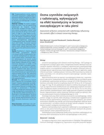 Współczesna Onkologia (2009) vol. 13; 3 (129–133) Cel: Przeprowadzono ocenę wpływu czynników związanych z radioterapią na powstanie późnych powikłań po napromienianiu i końcowy efekt kosmetyczny leczenia oszczędzającego u chorych na raka piersi. Materiał i metody: W analizie uwzględniono 94 chore. Czas od zakończonej radioterapii do badania wynosił 18–154 mies. (mediana 29 mies.). Całkowita dawka obejmująca obszar całej piersi wynosiła 45–50 Gy w 20–25 frakcjach, w ciągu 4–5 tyg. Dawka na okolicę loży po usuniętym guzie wynosiła 10 Gy. W badaniu analizowano występowanie: zwłóknienia tkanek miękkich piersi, teleangiektazji, pogrubienia i przebarwienia skóry, stosując kryteria skali LENT-SOMA. Oceniono również wpływ energii, dawki całkowitej i frakcyjnej, wieku, sposób dopromieniania loży po guzie oraz jednoczesnej chemioterapii. Wyniki: Powikłania 3. stopnia wg skali LENT-SOMA zanotowano jedynie u 8 chorych (8,5%). Przebarwienie skóry częściej występowało po napromienianiu dużych piersi. Czynnikami istotnie wpływającymi na wzrost ryzyka powstania naczyniaków były eskalacja dawki (dawka całkowita 50 Gy) i napromienianie fotonami ze źródła Co-60 o energii 1,33 MeV. Czynnikiem predysponującym do powstania zwłóknień tkanek miękkich były duże wymiary piersi. Popromienne zwłóknienia częściej obserwowano po napromienianiu większą dawką (50 Gy). Nie wykazano wpływu pozostałych analizowanych czynników na nasilenie późnych odczynów popromiennych. Wnioski: Po napromienianiu dużych piersi częściej niż w przypadku piersi małych i średnich obserwuje się zwłóknienia piersi i przebarwienia skóry. Napromienianie fotonami ze źródła kobaltowego w porównaniu z fotonami o wyższej energii jest przyczyną częstszego występowania naczyniaków skóry. Na końcowy efekt kosmetyczny radioterapii w oszczędzającym leczeniu raka piersi nie mają wpływu: wielkość guza, sposób dopromienienia loży po guzie, leczenie chemiczne i wiek chorych. Słowa kluczowe: radioterapia raka piersi, efekt kosmetyczny, powikłania późne. Ocena czynników związanych z radioterapią, wpływających na efekt kosmetyczny w leczeniu oszczędzającym w raku piersi Assessment of factors connected with radiotherapy influencing the cosmetic effect in breast conserving therapy Piotr Błaszczyk1, Krzysztof Roszkowski2, Ewelina Błaszczyk3, Janusz Kowalewski4 1Oddział Radioterapii II, Centrum Onkologii im. prof. F. Łukaszczyka w Bydgoszczy Radioterapii, Centrum Onkologii im. prof. F. Łukaszczyka w Bydgoszczy 3Zakład Radiologii, Centrum Onkologii im. prof. F. Łukaszczyka w Bydgoszczy 4Katedra i Klinika Chirurgii Klatki Piersiowej i Nowotworów, Collegium Medicum w Bydgoszczy, UMK w Toruniu 2Oddział Wstęp Leczenie oszczędzające pierś (breast conserving therapy – BCT) polega na chirurgicznym usunięciu guza wraz z marginesem tkanek zdrowych oraz pachowych węzłów chłonnych, a następnie napromienianiu pozostawionego miąższu piersi, a w przypadkach przerzutów do węzłów chłonnych dołu pachowego obszar napromieniany może obejmować również regionalne węzły chłonne pachowe i nadobojczykowe. Końcowy efekt kosmetyczny zależy od wielu czynników, m.in. od zakresu leczenia operacyjnego i sposobu napromieniania [1–3]. Napromienianie piersi po operacji oszczędzającej składa się z napromieniania całej piersi i podwyższenia dawki na okolicę loży po usuniętym guzie. W radioterapii wykorzystuje się fotony o energii 1,0–12 MV. Stosowane standardowo schematy leczenia to aplikacja dawki 45–50 Gy w 20–25 frakcjach, w ciągu 4–5 tyg. W celu podwyższenia dawki w okolicy loży po guzie wykonuje się napromienianie śródtkankowe lub radioterapię wiązkami zewnętrznymi. Dodatkowa dawka promieniowania, ok. 10–20 Gy, ma na celu zniszczenie komórek nowotworowych, które mogły pozostać na granicy usuniętych tkanek. Napromienianie należy rozpocząć możliwie szybko po operacji, zaleca się zastosowanie leczenia śródoperacyjnego [2, 4–6]. Oceniając końcowy efekt kosmetyczny leczenia oszczędzającego, należy zwrócić uwagę na czynniki, które decydują o ostatecznym wyglądzie piersi. Wczesny odczyn popromienny, zwłaszcza o miernym nasileniu, jak rumień, złuszczanie naskórka oraz obrzęk, jest przyczyną dolegliwości podczas leczenia promieniami i w krótkim okresie po terapii, jednak ustępuje i nie pozostawia trwałych następstw kosmetycznych [7]. Badania nad kosmetycznymi aspektami radioterapii w oszczędzającym leczeniu w raku piersi koncentrują się nad czynnikami istotnymi dla powstawania późnych zmian popromiennych [3, 4]. Prezentowana praca podejmuje próbę oceny czynników wpływających na końcowy efekt kosmetyczny leczenia oszczędzającego w raku piersi. Materiał i metody Do badania włączono chore napromieniane w Zakładzie Teleradioterapii, Centrum Onkologii w Bydgoszczy. Zaproszono wszystkie pacjentki będące Współczesna Onkologia (2009) vol. 13; 3 (129–133) Aim: To compare cosmetic results of different radiotherapy schedules used in the treatment of breast cancer after breast radiotherapy and to identify factors affecting cosmetic outcomes. Material and methods: Nainty-four patients irradiated. Median follow-up of 29 months (ramge 18-154 mo.). Patients were treated with standard fractionation 45-50 Gy/20-25 fx/4-5 weeks. Boost up to 10 Gy. Late effects were evaluated using the LENT-SOMA scoring scale. The cosmetic results were assessed on a four-point scale and presence of concomitant chemotherapy. Results: LENT-SOMA grade 3 toxicity was observed only in 8 (8,5%) patients. The factor associated with hyperpigmentation is large breast size. The significant risk factors for teleangiectasia are high dose and use foton energy 1,33 MeV beam. Factors found to impact significantly cosmesis adversely fibrosis was large breast size. Breast fibrosis were more frequent observed 