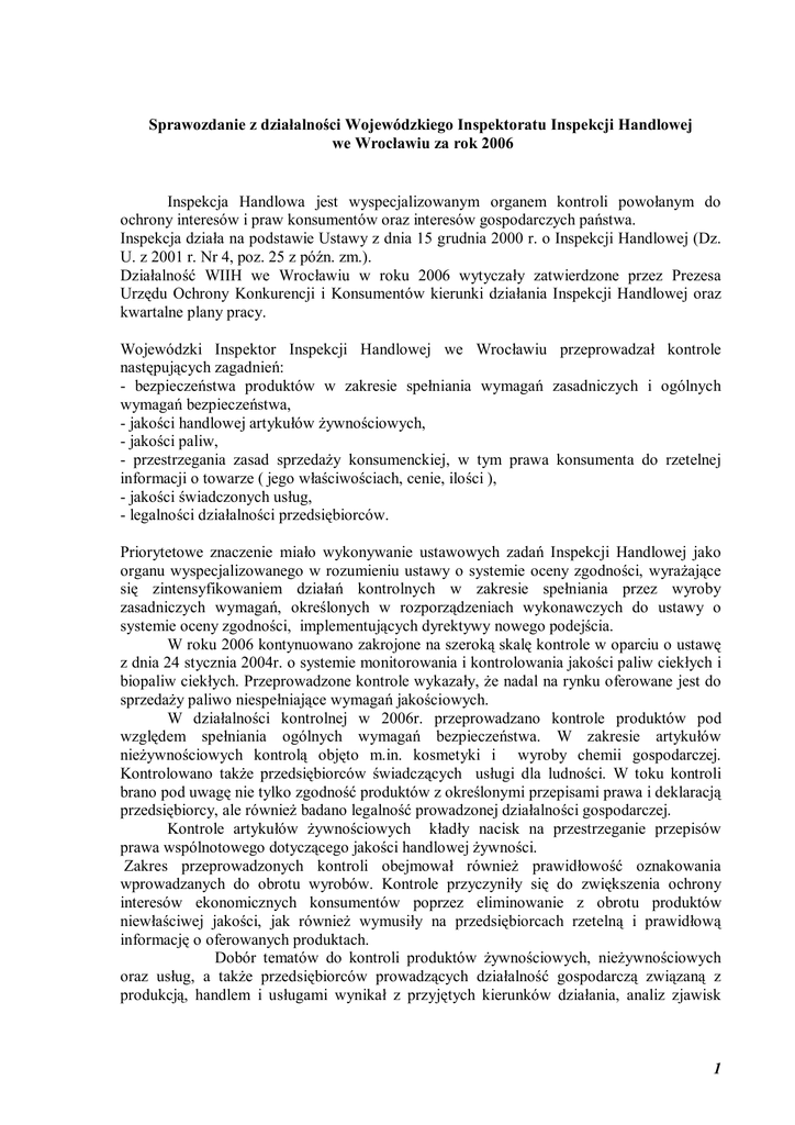 Sprawozdanie z działalności Wojewódzkiego Inspektoratu Inspekcji Handlowej we Wrocławiu za rok 2006 Inspekcja Handlowa jest wyspecjalizowanym organem kontroli powołanym do ochrony interesów i praw konsumentów oraz interesów gospodarczych państwa. Inspekcja działa na podstawie Ustawy z dnia 15 grudnia 2000 r. o Inspekcji Handlowej (Dz. U. z 2001 r. Nr 4, poz. 25 z późn. zm.). Działalność WIIH we Wrocławiu w roku 2006 wytyczały zatwierdzone przez Prezesa Urzędu Ochrony Konkurencji i Konsumentów kierunki działania Inspekcji Handlowej oraz kwartalne plany pracy. Wojewódzki Inspektor Inspekcji Handlowej we Wrocławiu przeprowadzał kontrole następujących zagadnień: - bezpieczeństwa produktów w zakresie spełniania wymagań zasadniczych i ogólnych wymagań bezpieczeństwa, - jakości handlowej artykułów żywnościowych, - jakości paliw, - przestrzegania zasad sprzedaży konsumenckiej, w tym prawa konsumenta do rzetelnej informacji o towarze ( jego właściwościach, cenie, ilości ), - jakości świadczonych usług, - legalności działalności przedsiębiorców. Priorytetowe znaczenie miało wykonywanie ustawowych zadań Inspekcji Handlowej jako organu wyspecjalizowanego w rozumieniu ustawy o systemie oceny zgodności, wyrażające się zintensyfikowaniem działań kontrolnych w zakresie spełniania przez wyroby zasadniczych wymagań, określonych w rozporządzeniach wykonawczych do ustawy o systemie oceny zgodności, implementujących dyrektywy nowego podejścia. W roku 2006 kontynuowano zakrojone na szeroką skalę kontrole w oparciu o ustawę z dnia 24 stycznia 2004r. o systemie monitorowania i kontrolowania jakości paliw ciekłych i biopaliw ciekłych. Przeprowadzone kontrole wykazały, że nadal na rynku oferowane jest do sprzedaży paliwo niespełniające wymagań jakościowych. W działalności kontrolnej w 2006r. przeprowadzano kontrole produktów pod względem spełniania ogólnych wymagań bezpieczeństwa. W zakresie artykułów nieżywnościowych kontrolą objęto m.in. kosmetyki i wyroby chemii gospodarczej. Kontrolowano także przedsiębiorców świadczących usługi dla ludności. W toku kontroli brano pod uwagę nie tylko zgodność produktów z określonymi przepisami prawa i deklaracją przedsiębiorcy, ale również badano legalność prowadzonej działalności gospodarczej. Kontrole artykułów żywnościowych kładły nacisk na przestrzeganie przepisów prawa wspólnotowego dotyczącego jakości handlowej żywności. Zakres przeprowadzonych kontroli obejmował również prawidłowość oznakowania wprowadzanych do obrotu wyrobów. Kontrole przyczyniły się do zwiększenia ochrony interesów ekonomicznych konsumentów poprzez eliminowanie z obrotu produktów niewłaściwej jakości, jak również wymusiły na przedsiębiorcach rzetelną i prawidłową informację o oferowanych produktach. Dobór tematów do kontroli produktów żywnościowych, nieżywnościowych oraz usług, a także przedsiębiorców prowadzących działalność gospodarczą związaną z produkcją, handlem i usługami wynikał z przyjętych kierunków działania, analiz zjawisk 1 występujących na rynku, napływających informacji od przedsiębiorców i konsumentów oraz rozeznania własnego. Niezależnie od powyższego, Inspekcja Handlowa realizowała działania w zakresie podejmowania mediacji i prowadzenia stałych polubownych sądów konsumenckich oraz poradnictwa konsumenckiego. Jednym z celów Inspekcji Handlowej jest propagowanie wśród konsumentów, a także przedsiębiorców tych form niesienia pomocy w rozstrzyganiu sporów i poznawaniu obowiązujących przepisów prawa. Realizując swoje zadania ustawowe Wojewódzki Inspektorat Inspekcji Handlowej we Wrocławiu współpracował z licznymi instytucjami, takimi jak: Policja, Urzędy Miar, Inspekcja Jakości Handlowej Artykułów Rolno-Spożywczych, Państwowa Inspekcja Pracy, Straż Pożarna, Inspekcja Sanitarna, Urzędy Celne, Izba Celna, Urząd Kontroli Skarbowej, Inspekcja Ochrony Środowiska, NIK, prokuratury, urzędy miast i gmin, starostwa powiatowe, Urząd Marszałkowski, Dolnośląski Urząd Wojewódzki. Kontrola wyrobów objętych dyrektywami nowego podejścia w zakresie zgodności z zasadniczymi wymaganiami. W trybie nadzoru rynku w 2006 roku Inspekcja Handlowa prowadziła regularne kontrole wyrobów pod kątem spełniania wymagań przepisów krajowych wdrażających dyrektywy nowego podejścia. Kontrolą objęto wyroby podlegające 8 dyrektywom, działania kontrolne prowadzono na terenie całego Dolnego Śląska. W ramach współpracy z organami celnymi Inspekcja Handlowa wydawała opinie dotyczące spełniania zasadniczych wymagań przez wyroby sprowadzane spoza Unii Europejskiej. Ścisła współpraca w omawianym zakresie umożliwia zatrzymanie na granicy wyrobów, które nie spełniają przepisów obowiązujących we Wspólnocie. W 2006r. w oparciu o programy kontroli opracowane przez Główny Inspektorat Inspekcji Handlowej w Warszawie realizowano następujące tematy kontrolne: 1. Kontrola opraw oświetleniowych. 2. Kontrola sprzętu chłodniczego. 3. Kontrola szybkowarów i hydroforów. 4. Kontrola wybranego sprzętu AGD. 5. Kontrola wprowadzonych do obrotu wybranych maszyn. 6. Kontrola wprowadzonych do obrotu zabawek. 7. Kontrola wprowadzonych do obrotu stateczników lamp fluorescencyjnych. 8. Kontrola wprowadzonych do obrotu przenośnych opraw oświetleniowych. 9. Kontrola środków ochrony indywidualnej używanych przede wszystkim w okresie letnim. 10. Kontrola wprowadzonego do obrotu sprzętu komputerowego. 11. Kontrola wprowadzonych do obrotu wodnych kotłów grzewczych opalanych paliwami ciekłymi lub gazowymi. Efektem przeprowadzonych kontroli było stwierdzenie różnych nieprawidłowości, w tym: - niezgodności z zasadniczymi wymaganiami, - braku oznakowania znakiem CE, - nieprawidłowanego oznakowania znakiem CE, - braku deklaracji zgodności, 2 - nieprawidłowo sporządzonej deklaracj