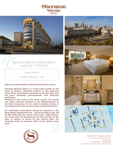 Special Rate for AHK Poland valid till 17.04.2015 single/ double 414 PLN / 486 PLN + VAT Rates include breakfast and Sheraton Fitness access. Sheraton Warsaw Hotel is a 5-star hotel located in the heart of Warsaw. Excellent location at the historical Royal Route guarantees proximity to ancient sites and the most important governmental and financial institutions. Sheraton is also home of the finest cuisine. Our guests can enjoy culinary journeys to the Mediterranean in the Olive restaurant, to the world of eastern flavors in the InAzia and to the tex-mex tastes in SomePlace Else. All individual reservations should be directed to the Reservation Department (tel. + 48 22 450 6800 or fax +48 22 450 6920) with the name of the event „AHK Poland”. All rooms shall be guaranteed for late arrivals. In the case of failure to arrive on the arrival date, the Customer shall be invoiced 100% of the agreed room price. SHERATON WARSAW HOTEL ul. B. Prusa 2, 00-493 Warsaw reservations t- 22 450 6800 f- 22 450 6920 [email protected] Specjalna Stawka dla AHK ważna do 17.04.2015 Pokój jedno - / dwuosobowy 414 PLN / 486 PLN + VAT Ceny zawierają Sheraton Fitness. śniadanie oraz dostęp do klubu Sheraton Warsaw Hotel to 5-gwiazdkowy hotel zlokalizowany w sercu Warszawy. Dogodna lokalizacja hotelu przy Trakcie Królewskim, zapewnia bliskość najważniejszych instytucji rządowych i finansowych oraz atrakcji Warszawy. Sheraton to również uczta dla podniebienia. Restauracje serwujące kuchnie: śródziemnomorską (The Olive), orientalną (InAzia) lub teksańsko-meksykańską (SPE) zabiorą naszych gości w kulinarną podróż. Indywidualne rezerwacje będą zgłaszane telefonicznie na numer + 48 22 450 6800 lub fax +48 22 450 6920 na hasło „AHK Polska”. Hotel gwarantuje zakwaterowanie w przypadku późnych przyjazdów (po godz.18:00). W przypadku niewykorzystania rezerwacji, strona gwarantująca rezerwacje poniesie pełne koszty (100%) wynajmu zamówionego pokoju. SHERATON WARSAW HOTEL ul. B. Prusa 2, 00-493 Warszawa Rezerwacje: t- 22 450 6800 f- 22 450 6920 [email protected]