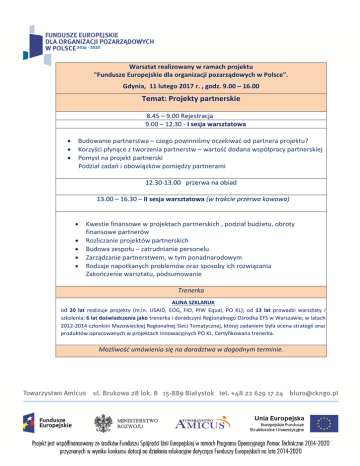 Warsztat realizowany w ramach projektu "Fundusze Europejskie dla organizacji pozarządowych w Polsce". Gdynia, 11 lutego 2017 r. , godz. 9.00 – 16.00 Temat: Projekty partnerskie 8.45 – 9.00 Rejestracja 9.00 – 12.30 - I sesja warsztatowa Budowanie partnerstwa – czego powinniśmy oczekiwać od partnera projektu? Korzyści płynące z tworzenia partnerstw – wartość dodana współpracy partnerskiej Pomysł na projekt partnerski Podział zadań i obowiązków pomiędzy partnerami 12.30-13.00 przerwa na obiad 13.00 – 16.30 – II sesja warsztatowa (w trakcie przerwa kawowa) Kwestie finansowe w projektach partnerskich , podział budżetu, obroty finansowe partnerów Rozliczanie projektów partnerskich Budowa zespołu – zatrudnianie personelu Zarządzanie partnerstwem, w tym ponadnarodowym Rodzaje napotkanych problemów oraz sposoby ich rozwiązania Zakończenie warsztatu, podsumowanie Trenerka ALINA SZKLARUK od 20 lat realizuje projekty (m.in. USAID, EOG, FIO, PIW Equal, PO KL); od 13 lat prowadzi warsztaty i szkolenia; 6 lat doświadczenia jako trenerka i doradczyni Regionalnego Ośrodka EFS w Warszawie; w latach 2012-2014 członkini Mazowieckiej Regionalnej Sieci Tematycznej, której zadaniem była ocena strategii oraz produktów opracowanych w projektach innowacyjnych PO KL. Certyfikowana trenerka . Możliwość umówienia się na doradztwo w dogodnym terminie.