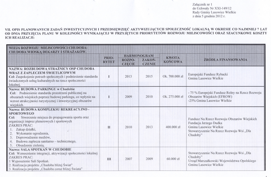 Zalacznik nr l do Uchwaly Nr XXI-149/12 Rady Gminy Lasowice Wielkie z dnia 5 grudnia 2012 r. VII. OPIS PLANOWANYCH ZADAN INWESTYCYJNYCH I PRZEDSIEWZIEC AKTYWIZUJACYCH SPOLECZNOSC LOKALNA W OKRESIE CO NAJMNIEJ 7 LAT OD DNIA PRZY JECIA PLANU W KOLEJNOSCI WYNIKAJACEJ W PRZY JETYCH PRIORYTETÓW ROZWOJU MIEJSCOWOSCI ORAZ SZACUNKOWE KOSZTY ICH REALIZACJI: NAZW A: ROZBUDOWA STRAZNICY OSP CHUDOBA WRAZ Z ZAPLECZEM SWIETLICOWYM Cel: Zaspokojeniepotrzebspolecznychi podniesieniestandardu swiadczonych uslug kulturalnych na rzecz spolecznosci lokalnej. Nazwa: BUDOWA PARKINGU w Chudobie Cel: Podniesienie standardu przestrzeni publicznej na obszarach wiejskich poprzez budowe parkingu, co wplynie na wzrost atrakcyjnosci turystycznej i inwestycyjnej obszarów wiejskich. Nazwa: BUDOWA KOMPLEKSU REKREACYJNO 2013 I I I I 2015 I 2009 Ok. 700.000 zl I 2010 I Ok. 275.000 zl Gmina Lasowice Wielkie Europejski FunduszRybacki - 75 % Europejski Fundusz Rolny na Rzecz Rozwoju Obszarów Wiejskich (EFROW) -25% Gmina Lasowice Wielkie - SPORTOWEGO Cel: Stworzenie miejsca do propagowania sportu oraz organizacji imprez plenerowych i sportowych ZAKRES PRAC: l. Zakup dzialki, i 2. Wykonanie ogrodzenia, 3. Doprowadzenie mediów, 4. Budowa zaplecza sanitarno - technicznego, 5. Obsadzenie zielenia. Nazwa: SALA SPOTKAN W CHUDOBIE Cel: Wzmocnienie integracji, aktywizacji spolecznosci lokalnej ZAKRES PRAC: l Wyposazenie Sali Spotkan. 2. Realizacja projektu "Chudoba blizej Swiat" 3. Realizacia proiektu "Chudoba coraz blizej Swiata" II 2010 2013 400.000 zl Fundusz Na Rzecz Rozwoju Obszarów Wiejskich Fundacja Jerzego Dudka Gmina Lasowice Wielkie Stowarzyszenie Na Rzecz Rozwoju Wsi "Dla Chudoby" III 2007 2009 60.000 zl Stowarzyszenie Na Rzecz Rozwoju Wsi "Dla Chudoby" Urzad Marszalkowski Województwa Opolskiego Gmina Lasowice Wielkie ( ( Nazwa: BUDOWA KANALIZACJI Cel: Polepszenie infrastruktury technicznej wsi. Nazwa: BUDOWA CHODNIKA PRZY DRODZE WOJEWÓDZKIEJ nr 494 Cel: Poprawa bezpieczenstwa pieszych i rowerzystów. Nazwa: USTAWIENIE WITACZY PRZY WJEZDZIE DO MIEJSCOWOSCI CHUDOBA Cel: Poprawa estetyki i promocja wsi Nazwa: UMIESZCZENIE TABLIC INFORMACYJNYCH Z NUMERAMI POSESJI NA KAZDYM SKRZYZOWANIU Cel: Poprawa infrastruktury technicznej wsi Nazwa: ORGANIZACJA SZKOLEN DLA MIESZKANCÓW Cel: Podniesienie kwalifikacji Nazwa: ORGANIZACJA CYKLICZNEGO TURNIEJU PILKARSKIEGO Cel: Krzewienie kultury fizycznej, sportu i rekreacji Nazwa: ORGANIZACJA RAJDOW ROWEROWYCHCYKLICZNIE Cel: Krzewienie kultury fizycznej oraz integracja mieszkanców Nazwa: ORGANIZACJA IMPREZ OKOLICZNOSCIOWYCH (Spotkanie adwentowe, Mikolajki, Dzien Matki, Dzien Strazaka, Walentynki, Sw. Marcina, itp.) Cel: Kultywowanie tradycji oraz integracja mieszkanców Nazwa: ORGANIZACJA CYKLICZNEJ IMPREZY: ZAWODY DEKARZY Cel: Promocja miejscowosci, integracja mieszkanców Nazwa: ORGANIZACJA PLACU ZAB W Z TERENEM SKEYTOWYM Cel: Krzewienie kultury fizycznej i sportu Gmina Lasowice Wielkie Program Rozwoju Obszarów Wiejskich IV 2009 2012 3.400.000 zl V 2010 2013 500.000 zl VI 2009 2009 6000 zl Stowarzyszenie Na Rzecz Rozwoju Wsi "Dla Chudoby" VII 2008 2009 10.000 zl Gmina Lasowice Wielkie Stowarzyszenie Na Rzecz Rozwoju Wsi "Dla Chudoby" VIII 2008 2015 20.000 zl Stowarzyszenie Na Rzecz Rozwoju Wsi "Dla Chudoby" w ramach srodków pozyskanych z dotacji Urzedu Gminy i Urzedu Marszalkowskiego IX 2008 2015 1.000 zl / turniej X 2008 2015 700 zl / rajd Stowarzyszenie Na Rzecz Rozwoju Wsi "Dla Chudoby" w ramach srodków wlasnych oraz pozyskanych z dotacji Urzedu Gminy Srodki DFK, OSP, Caritas, Zarzad Dróg Wojewódzkich w Opolu Stowarzyszenie Na Rzecz Rozwoju Wsi "Dla Chudoby" w ramach srodków pozyskanych z dotacji Urzedu Gminy Stowarzyszenie Na Rzecz Rozwoju Wsi "Dla Chudoby" w ramach srodków wlasnych oraz pozyskanych z dotacii Urzedu Gminy XI 2008 2015 500 zl / impreza XII 2011 2015 5.000 zl / impreza Stowarzyszenie Na Rzecz Rozwoju Wsi "Dla Chudoby" w ramach srodków wlasnych oraz pozyskanych od sponsorów, XIII 2013 2014 20.000zl Stowarzyszenie Na Rzecz Rozwoju Wsi "Dla Chudoby" w ramach srodków wlasnych oraz pozyskanych dotacji, Najwazniejszym planowanym zadaniem do wykonania wplywajacym na zycie mieszkanców, waznym ze wzgledów: emocjonalnych, funkcjonalno - przestrzennych jest "Budowa parkingu w Chudobie" - zlokalizowanego w centrum wsi czyli na obszarze o szczególnym znaczeniu dla zaspokojenia potrzeb mieszkanców. Ponadto realizacja tego przedsiewziecia bedzie sprzyjala nawiazywaniu kontaktów spolecznych. Cel tej operacji zostal okreslony jako: podniesienie standardu przestrzeni publicznej na obszarach wiejskich poprzez budowe parkingu, co wplynie na wzrost atrakcyjnosci turystycznej i inwestycyjnej obszarów wiejskich. PRZEWODNICZACY ~AI!Y()GMINY ,~ 2 Rajmund Kinder