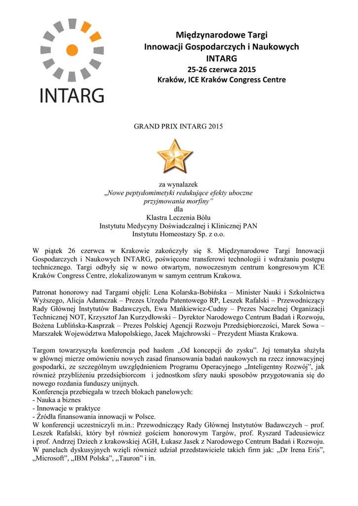 Międzynarodowe Targi Innowacji Gospodarczych i Naukowych INTARG 25-26 czerwca 2015 Kraków, ICE Kraków Congress Centre GRAND PRIX INTARG 2015 za wynalazek „Nowe peptydomimetyki redukujące efekty uboczne przyjmowania morfiny” dla Klastra Leczenia Bólu Instytutu Medycyny Doświadczalnej i Klinicznej PAN Instytutu Homeostazy Sp. z o.o. W piątek 26 czerwca w Krakowie zakończyły się 8. Międzynarodowe Targi Innowacji Gospodarczych i Naukowych INTARG, poświęcone transferowi technologii i wdrażaniu postępu technicznego. Targi odbyły się w nowo otwartym, nowoczesnym centrum kongresowym ICE Kraków Congress Centre, zlokalizowanym w samym centrum Krakowa. Patronat honorowy nad Targami objęli: Lena Kolarska-Bobińska – Minister Nauki i Szkolnictwa Wyższego, Alicja Adamczak – Prezes Urzędu Patentowego RP, Leszek Rafalski – Przewodniczący Rady Głównej Instytutów Badawczych, Ewa Mańkiewicz-Cudny – Prezes Naczelnej Organizacji Technicznej NOT, Krzysztof Jan Kurzydłowski – Dyrektor Narodowego Centrum Badań i Rozwoju, Bożena Lublińska-Kasprzak – Prezes Polskiej Agencji Rozwoju Przedsiębiorczości, Marek Sowa – Marszałek Województwa Małopolskiego, Jacek Majchrowski – Prezydent Miasta Krakowa. Targom towarzyszyła konferencja pod hasłem „Od koncepcji do zysku”. Jej tematyka służyła w głównej mierze omówieniu nowych zasad finansowania badań naukowych na rzecz innowacyjnej gospodarki, ze szczególnym uwzględnieniem Programu Operacyjnego „Inteligentny Rozwój”, jak również przybliżeniu przedsiębiorcom i jednostkom sfery nauki sposobów przygotowania się do nowego rozdania funduszy unijnych. Konferencja przebiegała w trzech blokach panelowych: - Nauka a biznes - Innowacje w praktyce - Źródła finansowania innowacji w Polsce. W konferencji uczestniczyli m.in.: Przewodniczący Rady Głównej Instytutów Badawczych – prof. Leszek Rafalski, który był również gościem honorowym Targów, prof. Ryszard Tadeusiewicz i prof. Andrzej Dziech z krakowskiej AGH, Łukasz Jasek z Narodowego Centrum Badań i Rozwoju. W panelach dyskusyjnych wzięli również udział przedstawiciele takich firm jak: „Dr Irena Eris”, „Microsoft”, „IBM Polska”, „Tauron” i in. GALA OGŁOSZENIA WYNIKÓW KONKURSU I WRĘCZENIA NAGRÓD Prezentowane rozwiązania zostały zgłoszone do konkursu Targów INTARG, w ramach którego grono kilkunastu jurorów i ekspertów, pod przewodnictwem dr. inż. Krzysztofa Biernata, prof. nadzw., dokonało ich oceny, przyznając nagrody i medale. W dniu 26 czerwca 2015 roku odbyła się Gala, na której ogłoszono oficjalne wyniki konkursu i wręczono nagrody: • ufundowane przez patronów wydarzenia oraz instytucje zewnętrzne • przyznane przez jury Targów W ramach konkursu INTARG jury przyznało: Wyróżnienia specjalne:  Grand Prix za rozwiązanie: „Nowe peptydomimetyki redukujące efekty uboczne przyjmowania morfiny”. Wynalazek opracowany został przez Andrzeja Lipkowskiego, Aleksandrę MisickąKęsik, Krzysztofa Różyckiego, Annę Leśniak, Jakuba Fichnę, Annę Puszko, Piotra Sosnowskiego i Monikę Ruszkarską. Rozwiązanie zaprezentowane zostało przez: Klaster Leczenia Bólu, Instytut Medycyny Doświadczalnej i Klinicznej PAN oraz Instytut Homeostazy Sp. z o.o.  Nagroda przewodniczącego Jury dla Uniwersytetu Mikołaja Kopernika w Toruniu za: „System do wspomagania rozwoju percepcyjno-poznawczego niemowląt i małych dzieci”, opracowany przez: Włodzisława Ducha, Bibiannę Bałaj, Joannę Dreszer-Drogorób, Oleksandra Sokolova, Tomasza Komendzińskiego, Jacka Matulewskiego i Dariusza Mikołajewskiego.  Najlepszy wynalazek zagraniczny dla National Institute for Research and Development in Construction, Urban Planning and Sustainable Spatial Development z Rumunii za: „System budowlany ze strukturą i powłoką zamykającą typu konwertor-generator-akumulator z masywnymi elementami termicznymi zawierającymi wodę”, opracowany przez Constantina Mirona. Nagrody i medale konkursowe (czterostopniowa gradacja)  8 nagród platynowych w 6 kategoriach – po jednej w kategoriach: środowisko naturalne, medycyna i biotechnologia, informatyka, bezpieczeństwo, młody wynalazca oraz 3 w najszerszej kategorii inżynieria i przemysł.  medale złote  medale srebrne  medale brązowe W czasie Gali zostały też ogłoszone oficjalne wyniki konkursów organizowanych pod honorowym patronatem Ministra Nauki i Szkolnictwa Wyższego: • Młody Wynalazca 2015 • Lider Innowacji 2015 (w kategoriach: instytucja, menadżer, osobowość, produkt) WYSTAWCY INTARG 2015 Na targach zaprezentowano 100 wynalazków z Polski i z zagranicy – z Bośni i Hercegowiny, Rumunii, Tajwanu, Malezji i Iranu. Wystawcy reprezentowali jednostki sfery nauki, przedsiębiorstwa produkcyjne oraz młodzież szkół średnich i wyższych. Rozwiązania obejmowały zagadnienia z różnych dziedzin: ekologia, medycyna, bezpieczeństwo, lotnictwo, przemysł samochodowy i transport, metalurgia, włókiennictwo, maszyny i urządzenia, chemia, mechanika, inżynieria, elektronika, energetyka, informatyka i inne. NAGRODY I WYRÓŻNIENIA DLA POLSKICH WYSTAWCÓW Jury przyznało najwyższą nagrodę – Grand Prix polskiemu wynalazkowi: „Nowe peptydomimetyki redukujące efekty uboczne przyjmowania morfiny”. Wynalazek opracowany został przez Andrzeja Lipkowskiego, Aleksandrę Misicką-Kęsik, Krzysztofa Różyckiego, Annę Leśniak, Jakuba Fichnę, Annę Puszko, Piotra Sosnowskiego i Monikę Ruszkarską. Rozwiązanie zaprezentowane zostało przez: Klaster Leczenia Bólu, Instytut Medycyny Doświadczalnej i Klinicznej PAN oraz Instytut Homeostazy Sp. z o.o. Przedmiotem wynalazku są związki blokujące niepożądane działanie opioidów w przewodzie pokarmowym, a przy tym nie mające wpływu na działanie przeciwbólowe morfiny, ponieważ nie przechodzą one przez barierę jelitową do krwi i dalej do ośrodkowego układu nerwowego. Nowy typ związków moż