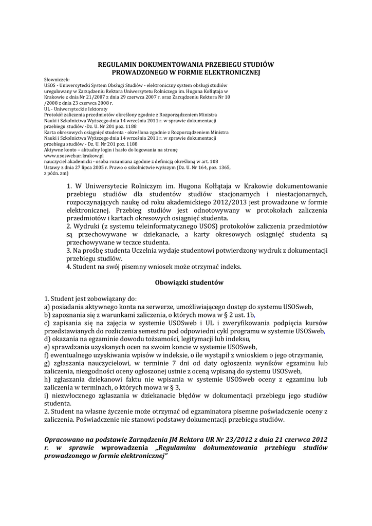 REGULAMIN DOKUMENTOWANIA PRZEBIEGU STUDIÓW PROWADZONEGO W FORMIE ELEKTRONICZNEJ Słowniczek: USOS - Uniwersytecki System Obsługi Studiów - elektroniczny system obsługi studiów uregulowany w Zarządzeniu Rektora Uniwersytetu Rolniczego im. Hugona Kołłątaja w Krakowie z dnia Nr 21/2007 z dnia 29 czerwca 2007 r. oraz Zarządzeniu Rektora Nr 10 /2008 z dnia 23 czerwca 2008 r. UL - Uniwersyteckie lektoraty Protokół zaliczenia przedmiotów określony zgodnie z Rozporządzeniem Ministra Nauki i Szkolnictwa Wyższego dnia 14 września 2011 r. w sprawie dokumentacji przebiegu studiów -Dz. U. Nr 201 poz. 1188 Karta okresowych osiągnięć studenta - określona zgodnie z Rozporządzeniem Ministra Nauki i Szkolnictwa Wyższego dnia 14 września 2011 r. w sprawie dokumentacji przebiegu studiów - Dz. U. Nr 201 poz. 1188 Aktywne konto – aktualny login i hasło do logowania na stronę www.usosweb.ur.krakow.pl nauczyciel akademicki - osoba rozumiana zgodnie z definicją określoną w art. 108 Ustawy z dnia 27 lipca 2005 r. Prawo o szkolnictwie wyższym (Dz. U. Nr 164, poz. 1365, z późn. zm) 1. W Uniwersytecie Rolniczym im. Hugona Kołłątaja w Krakowie dokumentowanie przebiegu studiów dla studentów studiów stacjonarnych i niestacjonarnych, rozpoczynających naukę od roku akademickiego 2012/2013 jest prowadzone w formie elektronicznej. Przebieg studiów jest odnotowywany w protokołach zaliczenia przedmiotów i kartach okresowych osiągnięć studenta. 2. Wydruki (z systemu teleinformatycznego USOS) protokołów zaliczenia przedmiotów są przechowywane w dziekanacie, a karty okresowych osiągnięć studenta są przechowywane w teczce studenta. 3. Na prośbę studenta Uczelnia wydaje studentowi potwierdzony wydruk z dokumentacji przebiegu studiów. 4. Student na swój pisemny wniosek może otrzymać indeks. Obowiązki studentów 1. Student jest zobowiązany do: a) posiadania aktywnego konta na serwerze, umożliwiającego dostęp do systemu USOSweb, b) zapoznania się z warunkami zaliczenia, o których mowa w § 2 ust. 1b, c) zapisania się na zajęcia w systemie USOSweb i UL i zweryfikowania podpięcia kursów przedstawianych do rozliczenia semestru pod odpowiedni cykl programu w systemie USOSweb, d) okazania na egzaminie dowodu tożsamości, legitymacji lub indeksu, e) sprawdzania uzyskanych ocen na swoim koncie w systemie USOSweb, f) ewentualnego uzyskiwania wpisów w indeksie, o ile wystąpił z wnioskiem o jego otrzymanie, g) zgłaszania nauczycielowi, w terminie 7 dni od daty ogłoszenia wyników egzaminu lub zaliczenia, niezgodności oceny ogłoszonej ustnie z oceną wpisaną do systemu USOSweb, h) zgłaszania dziekanowi faktu nie wpisania w systemie USOSweb oceny z egzaminu lub zaliczenia w terminach, o których mowa w § 3, i) niezwłocznego zgłaszania w dziekanacie błędów w dokumentacji przebiegu jego studiów studenta. 2. Student na własne życzenie może otrzymać od egzaminatora pisemne poświadczenie oceny z zaliczenia. Poświadczenie nie stanowi podstawy dokumentacji przebiegu studiów. Opracowano na podstawie Zarządzenia JM Rektora UR Nr 23/2012 z dnia 21 czerwca 2012 r. w sprawie wprowadzenia „Regulaminu dokumentowania przebiegu studiów prowadzonego w formie elektronicznej”
