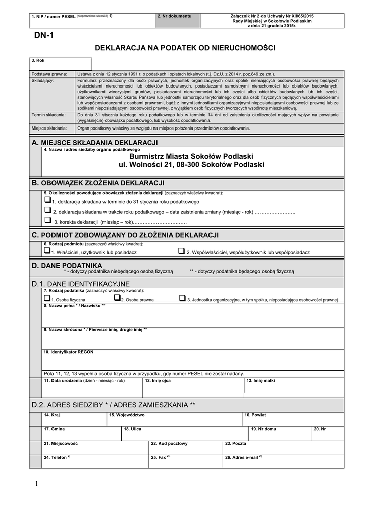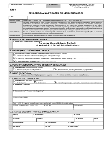1. NIP / numer PESEL (niepotrzebne skreślić) 1) 2. Nr dokumentu Załącznik Nr 2 do Uchwały Nr XII/65/2015 Rady Miejskiej w Sokołowie Podlaskim z dnia 21 grudnia 2015r. DN-1 DEKLARACJA NA PODATEK OD NIERUCHOMOŚCI 3. Rok Podstawa prawna: Składający: Ustawa z dnia 12 stycznia 1991 r. o podatkach i opłatach lokalnych (t.j. Dz.U. z 2014 r. poz.849 ze zm.). Formularz przeznaczony dla osób prawnych, jednostek organizacyjnych oraz spółek niemających osobowości prawnej będących właścicielami nieruchomości lub obiektów budowlanych, posiadaczami samoistnymi nieruchomości lub obiektów budowlanych, użytkownikami wieczystymi gruntów, posiadaczami nieruchomości lub ich części albo obiektów budowlanych lub ich części, stanowiących własność Skarbu Państwa lub jednostki samorządu terytorialnego oraz dla osób fizycznych będących współwłaścicielami lub współposiadaczami z osobami prawnymi, bądź z innymi jednostkami organizacyjnymi nieposiadającymi osobowości prawnej lub ze spółkami nieposiadającymi osobowości prawnej, z wyjątkiem osób fizycznych tworzących wspólnotę mieszkaniową. Termin składania: Do dnia 31 stycznia każdego roku podatkowego lub w terminie 14 dni od zaistnienia okoliczności mających wpływ na powstanie (wygaśnięcie) obowiązku podatkowego, lub wysokość opodatkowania. Miejsce składania: Organ podatkowy właściwy ze względu na miejsce położenia przedmiotów opodatkowania. A. MIEJSCE SKŁADANIA DEKLARACJI 4. Nazwa i adres siedziby organu podatkowego Burmistrz Miasta Sokołów Podlaski ul. Wolności 21, 08-300 Sokołów Podlaski B. OBOWIĄZEK ZŁOŻENIA DEKLARACJI 5. Okoliczności powodujące obowiązek złożenia deklaracji (zaznaczyć właściwy kwadrat): 1. deklaracja składana w terminie do 31 stycznia roku podatkowego 2. deklaracja składana w trakcie roku podatkowego – data zaistnienia zmiany (miesiąc - rok) ……………………. 3. korekta deklaracji (miesiąc – rok)…………………………… C. PODMIOT ZOBOWIĄZANY DO ZŁOŻENIA DEKLARACJI 6. Rodzaj podmiotu (zaznaczyć właściwy kwadrat): 1. Właściciel, użytkownik lub posiadacz 2. Współwłaściciel, współużytkownik lub współposiadacz D. DANE PODATNIKA * - dotyczy podatnika niebędącego osobą fizyczną ** - dotyczy podatnika będącego osobą fizyczną D.1. DANE IDENTYFIKACYJNE 7. Rodzaj podatnika (zaznaczyć właściwy kwadrat): 1. Osoba fizyczna 2. Osoba prawna 8. Nazwa pełna * / Nazwisko ** 3. Jednostka organizacyjna, w tym spółka, nieposiadająca osobowości prawnej 9. Nazwa skrócona * / Pierwsze imię, drugie imię ** 10. Identyfikator REGON Pola 11, 12, 13 wypełnia osoba fizyczna w przypadku, gdy numer PESEL nie został nadany. 11. Data urodzenia (dzień - miesiąc - rok) 12. Imię ojca 13. Imię matki D.2. ADRES SIEDZIBY * / ADRES ZAMIESZKANIA ** 14. Kraj 17. Gmina 1 15. Województwo 16. Powiat 18. Ulica 19. Nr domu 21. Miejscowość 22. Kod pocztowy 23. Poczta 24. Telefon 2) 25. Fax 2) 26. Adres e-mail 2) 20. Nr E. DANE DOTYCZĄCE PRZEDMIOTÓW OPODATKOWANIA NIEPODLEGAJĄCYCH ZWOLNIENIU E.1. POWIERZCHNIA GRUNTÓW Podstawa opodatkowania w m2 (ha) z dokładnością do 1 m2 Stawka podatku zł, gr Kwota podatku 1. Związane z prowadzeniem działalności gospodarczej, bez względu na sposób zakwalifikowania w ewidencji gruntów i budynków 2. Pod wodami powierzchniowymi stojącymi lub wodami powierzchniowymi płynącymi jezior i zbiorników sztucznych 3) 27. 28. 29. 30. 31. 32. 3. Pozostałe grunty, w tym zajęte na prowadzenie odpłatnej statutowej działalności pożytku publicznego przez organizacje pożytku publicznego 4. Niezabudowane objęte obszarem rewitalizacji, o którym mowa w ustawie z dnia 9 października 2015 r. o rewitalizacji, i położone na terenach, dla których miejscowy plan zagospodarowania przestrzennego przewiduje przeznaczenie pod zabudowę mieszkaniową, usługową albo zabudowę o przeznaczeniu mieszanym obejmującym wyłącznie te rodzaje zabudowy, jeżeli od dnia wejścia w życie tego planu w odniesieniu do tych gruntów upłynął okres 4 lat, a w tym czasie nie zakończono budowy zgodnie z przepisami prawa budowlanego 33. , 36. ha , 35. 37. 38. , , , , m2 E.2. POWIERZCHNIA BUDYNKÓW LUB ICH CZĘŚCI Podstawa opodatkowania w m2 1. Budynki mieszkalne – ogółem 39. Stawka podatku zł, 40. gr Kwota podatku kondygnacji o wysokości: - od 1,40 do 2,20 m (zaliczyć 50% powierzchni) 42. - powyżej 2,20 m 43. 2. Związane z prowadzeniem działalności gospodarczej oraz części budynków mieszkalnych zajęte na prowadzenie działalności gospodarczej – ogółem w tym kondygnacji o wysokości: - od 1,40 do 2,20 m (zaliczyć 50% powierzchni) 47. - powyżej 2,20 m 48. 3. Zajęte na prowadzenie działalności gospodarczej w zakresie obrotu kwalifikowanym materiałem siewnym ogółem - od 1,40 do 2,20 m (zaliczyć 50% powierzchni) w tym kondygnacji - powyżej 2,20 m o wysokości: 49. 4. Związane z udzielaniem świadczeń zdrowotnych w rozumieniu przepisów o działalności leczniczej, zajęte przez podmioty udzielające tych świadczeń 54. w tym kondygnacji o wysokości: w tym kondygnacji o wysokości: gr 45. , 46. 50. 51. , , 52. 53. - od 1,40 do 2,20 m (zaliczyć 50% powierzchni) 57. - powyżej 2,20 m 58. 5. Pozostałe, w tym zajęte na prowadzenie odpłatnej statutowej działalności pożytku publicznego przez organizacje pożytku publicznego – ogółem 2 44. zł, 41. , w tym gr , 34. m2 zł, 59. - od 1,40 do 2,20 m (zaliczyć 50% powierzchni) 62. - powyżej 2,20 m 63. 55. 56. , 60. , 61. , , E.3. WARTOŚĆ BUDOWLI LUB ICH CZĘŚCI ZWIĄZANYCH Z PROWADZENIEM DZIAŁALNOŚCI GOSPODARCZEJ Podstawa opodatkowania w zł z dokładnością do 1 zł 1. Budowle 64. Stawka podatku 65. Kwota podatku zł, gr 66. …% F. ŁĄCZNA KWOTA PODATKU 67. Kwota podatku (w pełnych złotych) ***) G. INFORMACJA O ZAŁĄCZNIKACH (do niniejszej deklaracji dołączono) 68. Liczba załączników ZN-1/A 69.. Załącznik ZN-1/B s