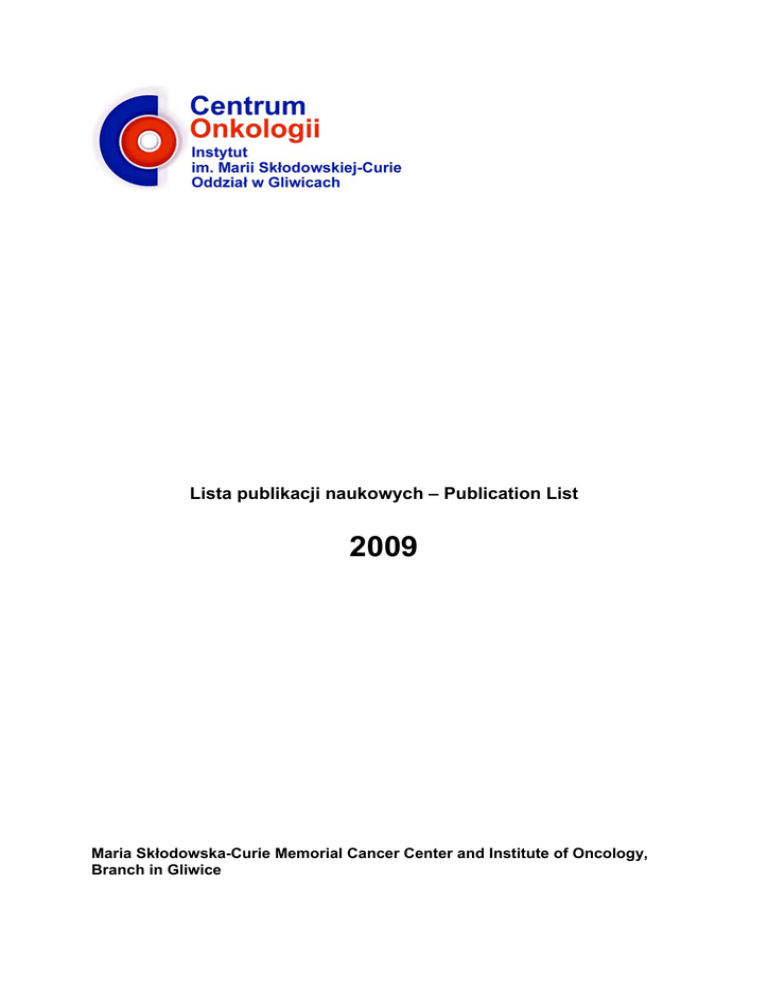 Lista publikacji naukowych – Publication List 2009 Maria Skłodowska-Curie Memorial Cancer Center and Institute of Oncology, Branch in Gliwice Selected papers published in internationally reviewed journals indexed by ISI Chechlińska M, Siwicki JK, Gos M, Oczko-Wojciechowska M, Jarzab M, Pfeifer A, Jarzab B, Steffen J (2009): Molecular signature of cell cycle exit induced in human T lymphoblasts by IL-2 withdrawal. BMC Genomics 10: e261. (IF=3,926) Cote L, Chen W, Sealy-Jefferson S, Autrup H, Behamour S, Butkiewicz D, Fong K.M, Hirvonen A, Kiyohara C, Larsen J.E, Lin P, Povey A.C, Reszka E, Risch A, Schneider J, Schwartz A.G, Sorensen M, To-Figureas J, Tokudome S, Pu Y, Yang P, Wenzlaff A.S, Taioli E. (2009): Meta- and pooled analysis of GSTP1and lung cancer: A HuGE-GSEC rewiev. Am. J. Epidemiol. 169: 802-814. (IF=5,454) Erlic Z, Rybicki L, Peczkowska M, Golcher H, Kann PH, Brauckhoff M, Müssig K, Muresan M, Schäffler A, Reisch N, Schott M, Fassnacht M, Opocher G, Klose S, Fottner C, Forrer F, Plöckinger U, Petersenn S, Zabolotny D, Kollukch O, Yaremchuk S, Januszewicz A, Walz MK, Eng C, Neumann HP, European-American Pheochromocytoma Study Group (m.in. Jarząb B) (2009): European-American Pheochromocytoma Study Group. Clinical predictors and algorithm for the genetic diagnosis of pheochromocytoma patients. Clin. Cancer Res. 15: 6378-6385. (IF=6,488) Gąsowska-Bajger B, Frąckowiak-Wojtasek B, Koj S, Cichoń T, Smolarczyk R, Szala S, Wojtasek H (2009): Oxidation of carbidopa by tyrosinase and its effect on murine melanoma. Bioorg. Med. Chem. Lett. 19: 3507-3510. (IF=2,531) Giebel S, Krawczyk-Kulis M, Kyrcz-Krzemien S, Haus O, Jagoda K, Piatkowska-Jakubas B, Paluszewska M, Seferynska I, Chrobok A, Stella-Holowiecka B, Kielbinski M, Hołowiecki J. (2009). Could cytogenetics and minimal residual disease replace conventional risk criteria in adults with Ph-negative acute lymphoblastic leukemia? Brit. J. Haematol. 144: 970-972. (IF=4,478) Giebel S, Hołowiecki J, Krawczyk-Kulis M, Jagoda K, Stella-Hołowiecka B, SadusWojciechowska M, Hellmann A, Dmoszynska A, Paluszewska M, Robak T, Konopka L, Seferynska I, Skotnicki AB, Kyrcz-Krzemien S (2009): Impact of granulocyte colony stimulating factor administered during induction and consolidation of adults with acute lymphoblastic leukemia on survival: long-term follow-up of the Polish adult leukemia group 4-96 study. Leukemia Lymphoma. 50: 1050-1053. (IF=1,939) Giebel S, Nowak I, Dziaczkowska J, Czerw T, Wojnar J, Krawczyk-Kulis M, Hołowiecki J, Holowiecka-Goral A, Markiewicz M, Kopera M, Karolczyk A, Kyrcz-Krzemien S, Kusnierczyk P (2009): Activating killer immunoglobulin-like receptor incompatibilities enhance graft-versus host disease and affect survival after allogeneic hematopoietic stem cell transplantation. Eur. J. Haematol. 83: 343-356. (IF=2,237) Giebel S, Labopin M, Hołowiecki J, Labar B, Komarnicki M, Koza V, Masszi T, Mistrik M, Lange A, Hellmann A, Vitek A, Pretnar J, Mayer J, Rzepecki P, Indrak K, Wiktor-Jedrzejczak W, Wojnar J, Krawczyk-Kulis M, Kyrcz-Krzemien S, Rocha V. (2009). Outcome of HLAmatched related allogeneic hematopoietic stem cell transplantation for patients with acute leukemia in first complete remission treated in Eastern European centers. Better results in recent years. Ann. Hematol. 88:1005-1013. (IF=2,454) 2 Hołowiecka-Goral A, Hołowiecki J, Giebel S, Stella-Holowiecka B, Kos K, LehmannKopydłowska A, Dudziński M, Hałasz M, Preisner W, Cioch M, Piszcz J. (2009). Liposomal cytarabine in advanced-stage acute lymphoblastic leukemia and aggressive lymphoma with CNS involvement: experience of The Polish Acute Leukemia Group. Leukemia Lymphoma 50: 478-80. (IF=1,939) Jaksik R, Polańska J, Herok R, Rzeszowska-Wolny J (2009): Calculation of reliable transcript levels of annotated genes on the basis of multiple probe-sets in Affymetrix microarrays. Acta Biochim. Polon. 56: 271-277. (IF=1,448) Jażdżewski K, Liyanarachchi S, Świerniak M, Pachucki J, Ringel M, Jarząb B (2009): Polymorphic mature microRNAs from passenger stand of pre-miR-146a contribute to thyroid cancer. Proc. Nat. Acad. Sci. USA 106: 1502-1505. (IF=9,380) Jędrzejowska-Szypułka H, Larysz-Brysz M, Kukla M, Snietura M, Lewin-Kowalik J (2009): Neutralization of interleukin-1beta reduces vasospasm and alters cerebral blood vessel density following experimental subarachnoid hemorrhage in rats. Curr. Neurovasc. Res. 6: 95-103. (IF=3,571) Kępka L, Maciejewski B, Withers RH (2009): Does incidental irradiation with doses below 50Gy effectively reduce isolated nodal failures in non-small-cell lung cancer: Dose-Response relationship. Int. J. Radiat. Oncol. Biol. Phys. 73: 1391-1396. (IF=4,639) Kuzbicki L, Lange D, Chwirot BW (2009): Cyclooxygenase-2 immunohistochemistry in human melanoma: differences between results obtained with different antibodies. Melanoma Res. 19: 294-300. (IF=2,336) Luster M, Handkiewicz-Junak D, Grossi A, Zacharin M, Taïeb D, Cruz O, Hitzel A, Casas JA, Mäder U, Dottorini ME; Pediatric rhTSH Investigators Group (2009): Multicenter retrospective study on recombinant human TSH use in children and adolescents with differentiated thyroid cancer: tolerability and serum TSH effect. J. Clin. Endocrin. Metab. 94: 3948-3953. (IF=6,325) Maciejewski A, Szymczyk C, Półtorak S, Grajek M (2009): Tracheal reconstruction with the use of radial forearm free flap combined with biodegradative mesh suspension. Ann. Thorac. Surg. 87: 608-610. (IF=2,689) Majewski W, Tarnawski R (2009): Acute and late toxicity in radical radiotherapy for bladder cancer. Clin. Oncol. 21: 598-609. (IF=2,184) Majewski W, Wesołowska I, Urbańczyk H, Hawrylewicz L, Świerczok B, Miszczyk L (2009): Dose distribution in bladder and surrounding normal tissues in relation to bladder volume in conformal radiotherapy for bladder cancer. Int. J. Radiat. Oncol. Biol. Phys. 75: 1371-1378. (IF=4,639) Markowski J, Tyszkiewicz T, Jarzab M, Oczko-Wojciechowska M, Gierek T, Witkowska