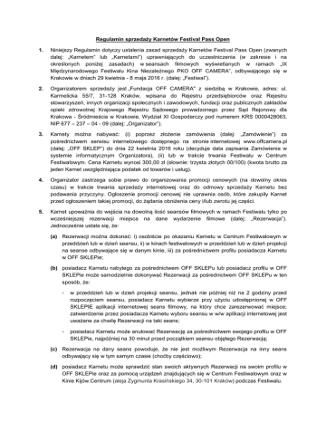 Regulamin sprzedaży Karnetów Festival Pass Open 1. Niniejszy Regulamin dotyczy ustalenia zasad sprzedaży Karnetów Festival Pass Open (zwanych dalej: „Karnetem” lub „Karnetami”) uprawniających do uczestniczenia (w zakresie i na określonych poniżej zasadach) w seansach filmowych wyświetlanych w ramach „IX Międzynarodowego Festiwalu Kina Niezależnego PKO OFF CAMERA”, odbywającego się w Krakowie w dniach 29 kwietnia - 8 maja 2016 r. (dalej: „Festiwal”). 2. Organizatorem sprzedaży jest „Fundacja OFF CAMERA" z siedzibą w Krakowie, adres: ul. Karmelicka 55/7, 31-128 Kraków, wpisana do Rejestru przedsiębiorców oraz Rejestru stowarzyszeń, innych organizacji społecznych i zawodowych, fundacji oraz publicznych zakładów opieki zdrowotnej Krajowego Rejestru Sądowego prowadzonego przez Sąd Rejonowy dla Krakowa - Śródmieścia w Krakowie, Wydział XI Gospodarczy pod numerem KRS 0000428063, NIP 677 – 237 – 04 - 09 (dalej: „Organizator”). 3. Karnety można nabywać: (i) poprzez złożenie zamówienia (dalej: „Zamówienie”) za pośrednictwem serwisu internetowego dostępnego na stronie internetowej www.offcamera.pl (dalej: „OFF SKLEP”) do dnia 22 kwietnia 2016 roku (decyduje data zapisania Zamówienia w systemie informatycznym Organizatora), (ii) lub w trakcie trwania Festiwalu w Centrum Festiwalowym. Cena Karnetu wynosi 300,00 zł (słownie: trzysta złotych 00/100) (kwota brutto za jeden Karnet uwzględniająca podatek od towarów i usług). 4. Organizator zastrzega sobie prawo do organizowania promocji cenowych (na dowolny okres czasu) w trakcie trwania sprzedaży internetowej oraz do odmowy sprzedaży Karnetu bez podawania przyczyny. Ogłoszenie promocji cenowej nie uprawnia osób, które zakupiły Karnet przed ogłoszeniem takiej promocji, do żądania obniżenia ceny i/lub zwrotu jej części. 5. Karnet upoważnia do wejścia na dowolną ilość seansów filmowych w ramach Festiwalu tylko po wcześniejszej rezerwacji miejsca na dane wydarzenie filmowe (dalej: „Rezerwacja”). Jednocześnie ustala się, że: (a) Rezerwacji można dokonać: i) osobiście po okazaniu Karnetu w Centrum Festiwalowym w przeddzień lub w dzień seansu, ii) w kinach festiwalowych w przeddzień lub w dzień projekcji na seanse odbywające się w danym kinie, iii) za pośrednictwem profilu posiadacza Karnetu w OFF SKLEPie; (b) posiadacz Karnetu nabytego za pośrednictwem OFF SKLEPu lub posiadacz profilu w OFF SKLEPie może samodzielnie dokonywać Rezerwacji za pośrednictwem OFF SKLEPu w ten sposób, że: - w przeddzień lub w dzień projekcji seansu, jednak nie później niż na 2 godziny przed rozpoczęciem seansu, posiadacz Karnetu wybierze przy użyciu udostępnionej w OFF SKLEPIE aplikacji internetowej seans filmowy, na który chce zarezerwować miejsce; zatwierdzenie przez posiadacza Karnetu wyboru seansu w w/w aplikacji internetowej jest uważane za chwilę Rezerwacji na taki seans; - posiadacz Karnetu może anulować Rezerwację za pośrednictwem swojego profilu w OFF SKLEPie, najpóźniej na 30 minut przed początkiem seansu objętego Rezerwacją; (c) Rezerwacja na dany seans powoduje, że nie jest możliwym Rezerwacja na inny seans odbywający się w tym samym czasie (choćby częściowo); (d) posiadacz Karnetu może sprawdzić stan swoich aktywnych Rezerwacji na swoim profilu w OFF SKLEPie oraz za pomocą urządzeń znajdujących się w Centrum Festiwalowym oraz w Kinie Kijów.Centrum (aleja Zygmunta Krasińskiego 34, 30-101 Kraków) podczas Festiwalu. 6. Jednocześnie ustala się, że: - Karnet nie upoważnia do wejścia na Galę Otwarcia i Zamknięcia Festiwalu oraz na inne gale odbywające się podczas Festiwalu; - wstęp na seanse filmowe możliwy jest tylko za okazaniem Karnetu, któremu przypisana jest aktywna Rezerwacja na dany seans; - na potrzeby Rezerwacji przez nabywców Karnetów Organizator przeznacza ustaloną, proporcjonalną liczbę miejsc na każdym seansie i będą one dostępne do wyczerpania puli miejsc przeznaczonych przez Organizatora na dany seans; Rezerwacji na dany seans można dokonywać do wyczerpania liczby miejsc; miejsca w kinach festiwalowych nie są numerowane; - osoby spóźnione na seans muszą liczyć się z brakiem miejsc siedzących lub odmową wstępu na seans. 7. Ilość Karnetów jest ograniczona - Zamówienia będą przyjmowane do wyczerpania zapasu Karnetów. Organizator zastrzega sobie możliwość zakończenia sprzedaży Karnetów w każdej chwili, bez podania przyczyn. 8. W celu nabycia Karnetu w OFF SKLEPie konieczne jest złożenie Zamówienia za pośrednictwem formularza internetowego (dalej: „Formularz”) dostępnego na stronie www.offcamera.pl w zakładce OFF SKLEP. W celu złożenia Zamówienia, muszą zostać spełnione łącznie następujące warunki: (a) Zamawiający wypełni wszystkie pola Formularza prawdziwymi i prawidłowymi danymi, załączy zdjęcie nabywcy Karnetu umożliwiające jego łatwą identyfikację (dalej: „Zdjęcie”) w celu umożliwienia Organizatorowi przygotowania Karnetu poprzez umieszczenie Zdjęcia na Karnecie i prześle Formularz do Organizatora (za pośrednictwem Internetu); Organizator zastrzega sobie prawo odmowy wydania Karnetu w przypadku braku czytelności Zdjęcia; (b) Zamawiający dokona zapłaty ceny za zamawiany Karnet - w jeden ze sposobów dostępnych w centrum e-płatności, do którego przekierowanie następuje za pośrednictwem OFF SKLEPu, w trakcie składania Zamówienia. 9. Nabycie Karnetu w OFFSKLEPie wymaga spełnienia następujących wymagań technicznych: (a) urządzenie, z którego korzysta Zamawiający musi posiadać dostęp do Internetu oraz być wyposażone w przeglądarkę internetową; (b) Zamawiający musi posiadać działający adres poczty elektronicznej. 10. W trakcie świadczenia usługi w urządzeniu, za pośrednictwem którego Zamawiający korzysta z OFFSKLEPu w celu zapewnienia prawidłowego funkcjonowania serwisu zapisywane są „cookies