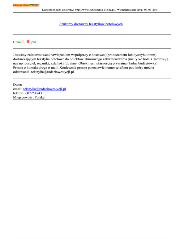 Dane pochodzą ze strony: http://www.ogloszenia-kielce.pl/. Wygenerowano dnia: 07-03-2017. Szukamy dostawcy tekstyliów hotelowych Cena:1,00 pln Jesteśmy zainteresowani nawiązaniem współpracy z dostawcą (producentem lub dystrybutorem) dostarczającym tekstylia hotelowe do obiektów zbiorowego zakwaterowania (nie tylko hotel). Interesują nas np. pościel, ręczniki, szlafroki lub inne. Obiekt jest własnością prywatną (żadna budżetówka). Proszę o kontakt drogą e-mail. Koniecznie proszę pozostawić numer telefonu pod który można oddzwonić. [email protected] Dane: email: [email protected] telefon: 607254743 Miejscowość: Polska