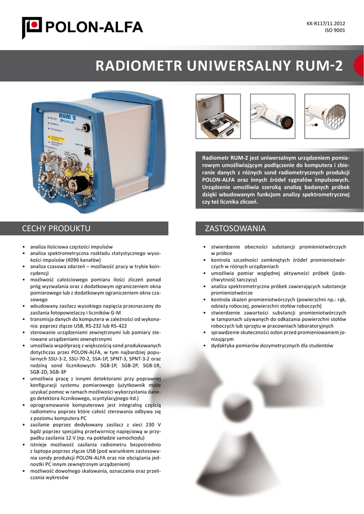 KK-R117/11.2012 ISO 9001 RADIOMETR UNIWERSALNY RUM-2 Radiometr RUM-2 jest uniwersalnym urządzeniem pomiarowym umożliwiającym podłączenie do komputera i zbieranie danych z różnych sond radiometrycznych produkcji POLON-ALFA oraz innych źródeł sygnałów impulsowych. Urządzenie umożliwia szeroką analizę badanych próbek dzięki wbudowanym funkcjom analizy spektrometrycznej czy też licznika zliczeń. CECHY PRODUKTU • analiza ilościowa częstości impulsów • analiza spektrometryczna rozkładu statystycznego wysokości impulsów (4096 kanałów) • analiza czasowa zdarzeń – możliwość pracy w trybie koincydencji • możliwość całościowego pomiaru ilości zliczeń ponad próg wyzwalania oraz z dodatkowym ograniczeniem okna pomiarowego lub z dodatkowym ograniczeniem okna czasowego • wbudowany zasilacz wysokiego napięcia przeznaczony do zasilania fotopowielaczy i liczników G-M • transmisja danych do komputera w zależności od wykonania: poprzez złącze USB, RS-232 lub RS-422 • sterowanie urządzeniami zewnętrznymi lub pomiary sterowane urządzeniami zewnętrznymi • umożliwia współpracę z większością sond produkowanych dotychczas przez POLON-ALFA, w tym najbardziej popularnych SSU-3-2, SSU-70-2, SSA-1P, SPNT-3, SPNT-3-2 oraz rodziną sond licznikowych: SGB-1P, SGB-2P, SGB-1R, SGB-2D, SGB-3P • umożliwia pracę z innymi detektorami przy poprawnej konfiguracji systemu pomiarowego (użytkownik może uzyskać pomoc w ramach możliwości wykorzystania danego detektora licznikowego, scyntylacyjnego itd.) • oprogramowanie komputerowe jest integralną częścią radiometru poprzez które całość sterowania odbywa się z poziomu komputera PC • zasilanie poprzez dedykowany zasilacz z sieci 230 V bądź poprzez specjalną przetwornicę napięciową w przypadku zasilania 12 V (np. na pokładzie samochodu) • istnieje możliwość zasilania radiometru bezpośrednio z laptopa poprzez złącze USB (pod warunkiem zastosowania sondy produkcji POLON-ALFA oraz nie obciążania jednostki PC innym zewnętrznym urządzeniem) • możliwość dowolnego skalowania, oznaczania oraz przeliczania wykresów ZASTOSOWANIA • stwierdzenie obecności substancji promieniotwórczych w próbce • kontrola szczelności zamkniętych źródeł promieniotwórczych w różnych urządzeniach • umożliwia pomiar względnej aktywności próbek (jodochwytność tarczycy) • analiza spektrometryczna próbek zawierających substancje promieniotwórcze • kontrola skażeń promieniotwórczych (powierzchni np.: rąk, odzieży roboczej, powierzchni stołów roboczych) • stwierdzenie zawartości substancji promieniotwórczych w tamponach używanych do odkażania powierzchni stołów roboczych lub sprzętu w pracowniach laboratoryjnych • sprawdzenie skuteczności osłon przed promieniowaniem jonizującym • dydaktyka pomiarów dozymetrycznych dla studentów PODSTAWOWE DANE TECHNICZNE Ilość kanałów Nominalna szerokość kanału Zmienność szerokości kanału Max częstość zliczeń z analizą amplitudy impulsów Max częstość zliczeń bez analizy amplitud impulsów Zakres syg. wejściowego analizatora Przesunięcie piku od temperatury Zasilanie PANEL PRZEDNI 4096 366 µV -75 % ÷ 75 % 25 000 imp/s 200 000 imp/s (5 ÷ 1440) mV ≤ ± 1,5 kanał/K poprzez dedykowany zasilacz z sieci 230 V Wbudowany zasilacz wys. napięcia (300 ÷ 1500) V Wbudowany zasilacz niskiego napięcia 24 V ± 5% Zakres temperatur pracy -10 oC ÷ +40 oC Ciśnienie atmosferyczne (900 ÷ 1100) hPa Masa ~ 0,9 kg Wymiary (DŁ x SZ x W) (140 x 126 x 136) mm Szczelność obudowy IP 40 TYPY ZŁĄCZ: Wyjście do komputera (do wyboru przez klienta jest tylko jedno z wyjść)(1) USB – zasięg do 5 m RS-232 – zasięg do 12 m RS-422 – zasięg do 100 m Zasilacz wysokiego napięcia gniazdo wyjściowe C – 5(2) gniazdo na wy/we sygnałowym BNC-2,5(3) Zasilacz niskiego napięcia gniazdo wyjściowe BNC-50 We/Wy Synchronizacji gniazdo wyjściowe BNC-50 Wyjście liniowe gniazdo wyjściowe BNC-50 (1) – należy określić rodzaj złącza w zamówieniu (2) – lub inny, na żądanie zamawiającego (3) – lub inny, na żądanie zamawiającego 1. Wejście zasilania 2. Wejście/wyjście podłączenia komputera 3. Wyjście niskiego napięcia / wejście impulsów dodatnich 4. Wyjście wysokiego napięcia 5. Wyjście wysokiego napięcia / wejście impulsów ujemnych 6. Wyjście liniowe 7. Gniazdo uziomu funkcjonalnego 8. Wejście/wyjście synchronizacji 9. Sygnalizacja włączenia zasilacza niskiego napięcia na wyjściu 3 10. Sygnalizacja włączenia wysokiego napięcia na wyjściach 4, 5 11. Sygnalizacja stanu niskiego na wyjściu/wejściu synchronizacji 12. Sygnalizacja transmisji do komputera na wyjściu 2 13. Sygnalizacja włączenia zasilania na wejściu 1 OPROGRAMOWANIE Radiometr nie posiada własnego wyświetlacza oraz żadnych elementów manipulacyjnych - całość sterowania odbywa się z poziomu komputera typu PC. Dzięki temu użytkownik w prosty sposób steruje całym procesem pomiarowym począwszy od doboru wysokiego napięcia aż po ustawienie parametrów toru analogowego (wzmocnienie, próg wyzwalania, korekta offsetu). Oprogramowanie pozwala na dokładne zobrazowanie wyników oraz daje możliwość dowolnego skalowania, oznaczania oraz przeliczania wykresów. UWAGA! Oprogramowanie jest wyposażone w tryb demonstracyjny pozwalający na zapoznanie się z wybranym zestawem funkcji radiometru. Wersja demo oprogramowania udostępniona jest dla Państwa na stronie firmy POLON-ALFA. Istnieje również możliwość modyfikacji panelu sterowania tak, by spełniał jak najlepiej Państwa potrzeby. WYPOSAŻENIE STANDARDOWE WYPOSAŻENIE RADIOMETRU UNIWERSALNEGO RUM-2 PRODUKT NAZWA/TYP OPIS Radiometr uniwersalny RUM-2 Radiometr RUM-2 jest uniwersalnym urządzeniem pomiarowym umożliwiającym podłączenie do komputera i zbieranie danych z różnych sond radiometrycznych produkcji POLON-ALFA oraz innych źródeł 