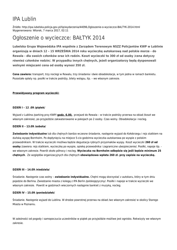 IPA Lublin Ogłoszenie o wycieczce: BAŁTYK 2014